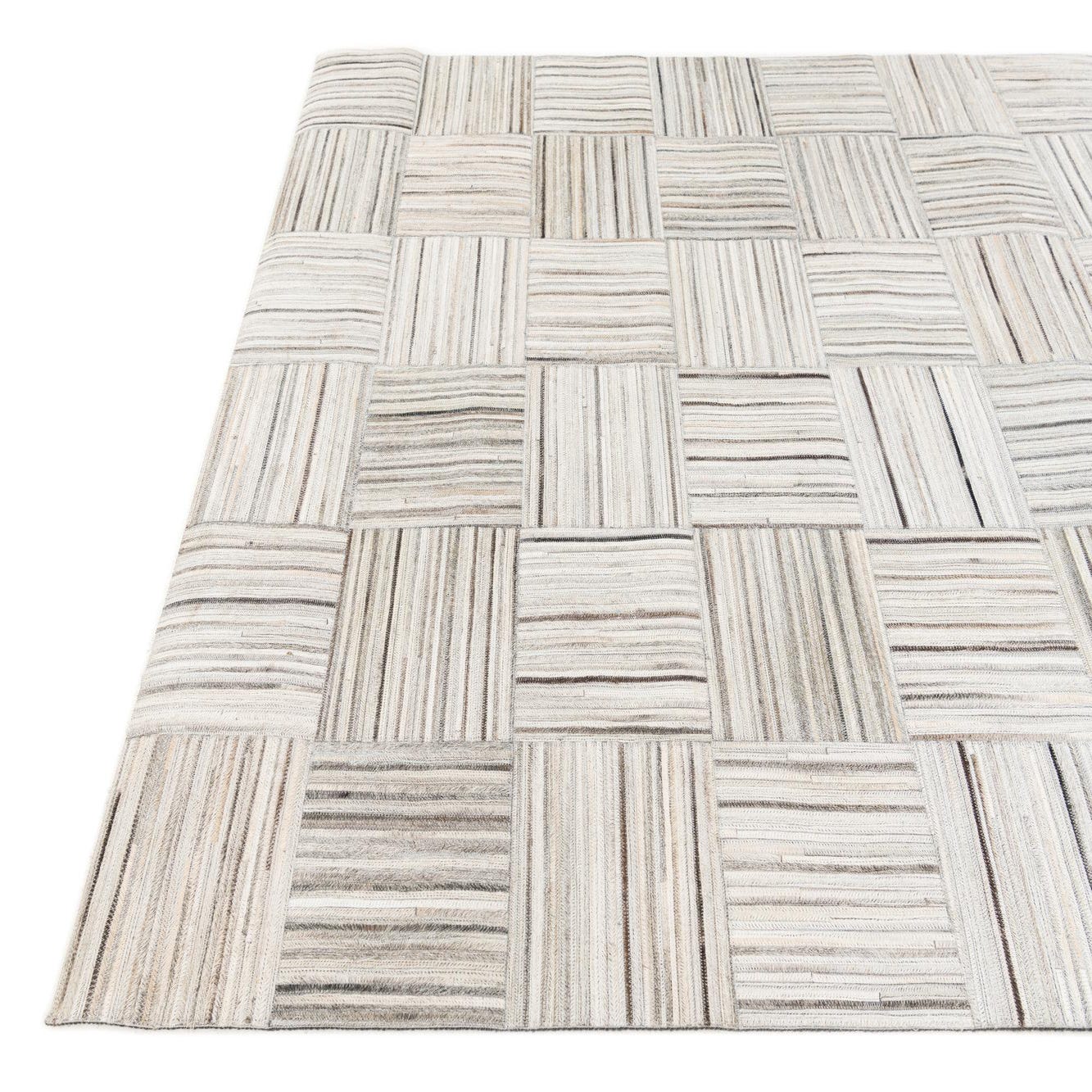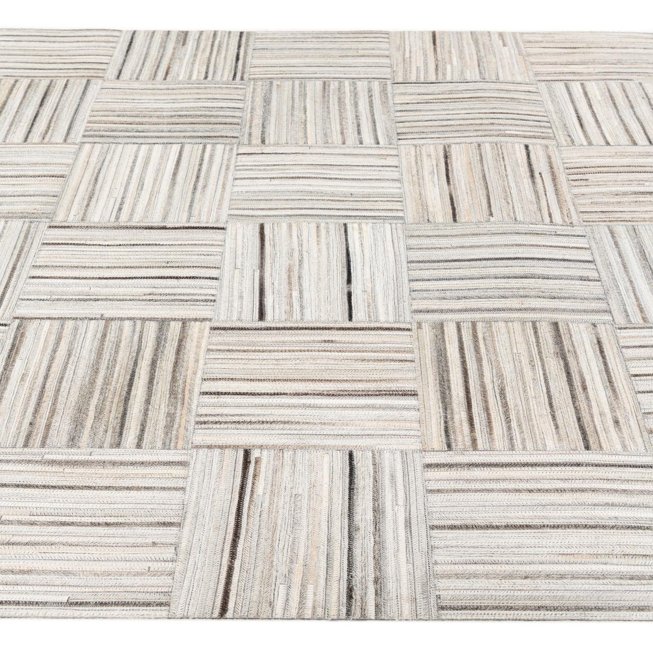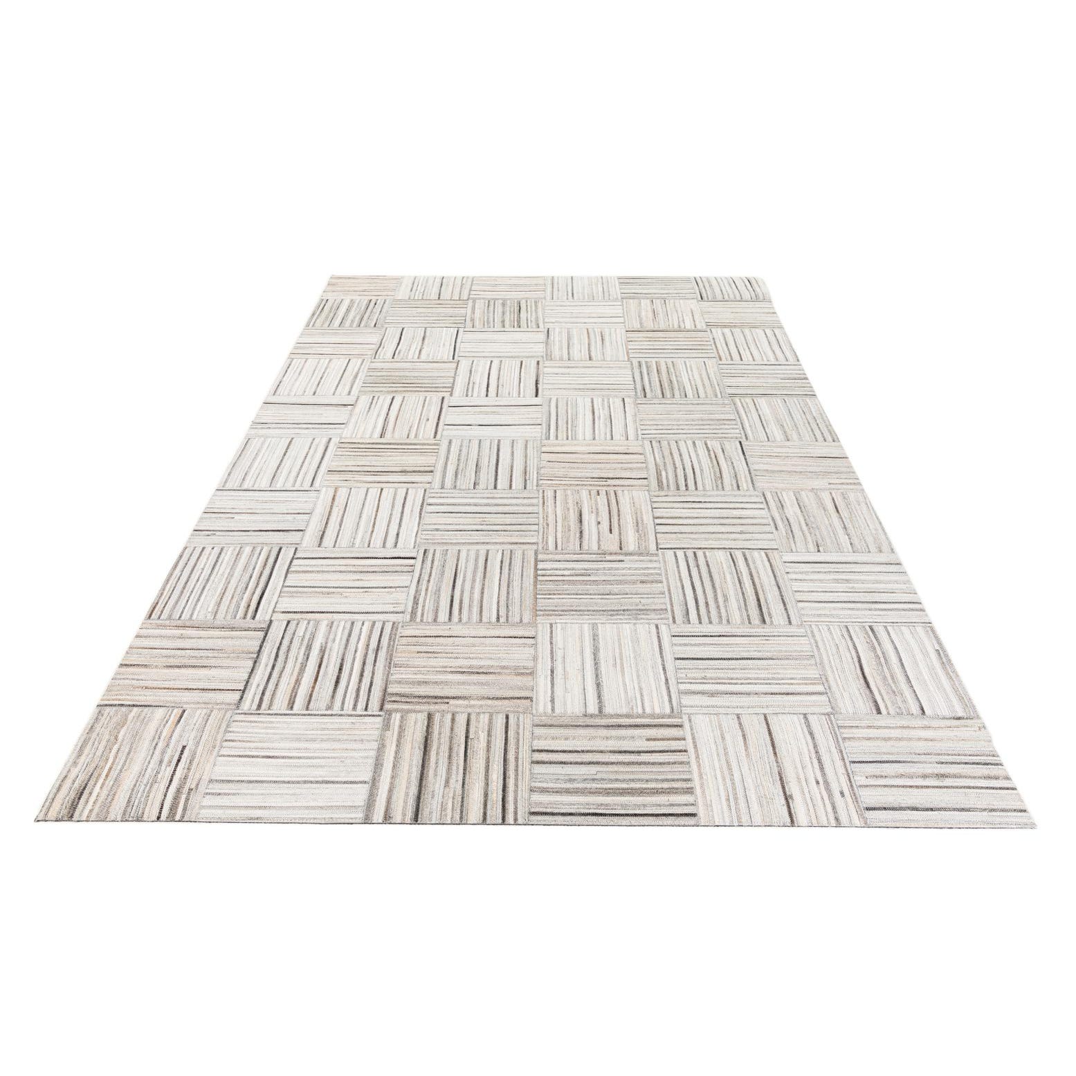A 5x8 rectangular gray patchwork rug made from cowhide and leather, featuring a geometric block pattern with alternating horizontal and vertical strips.