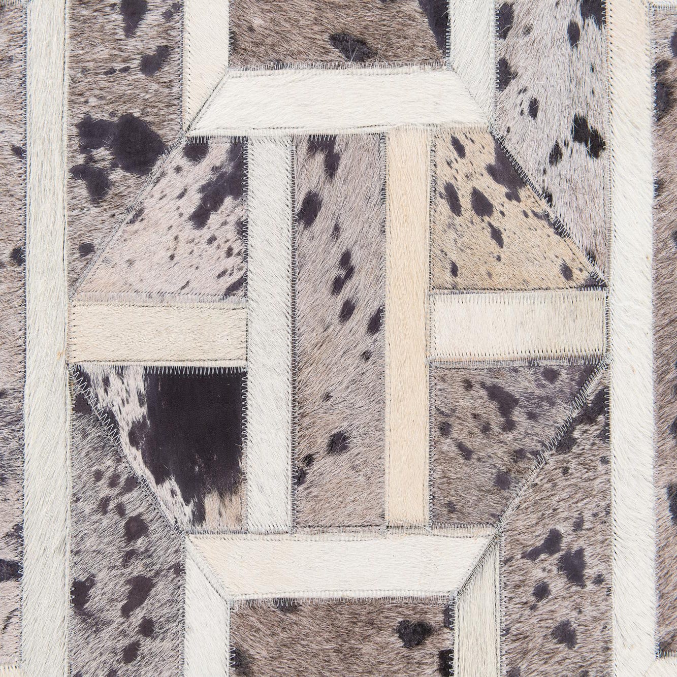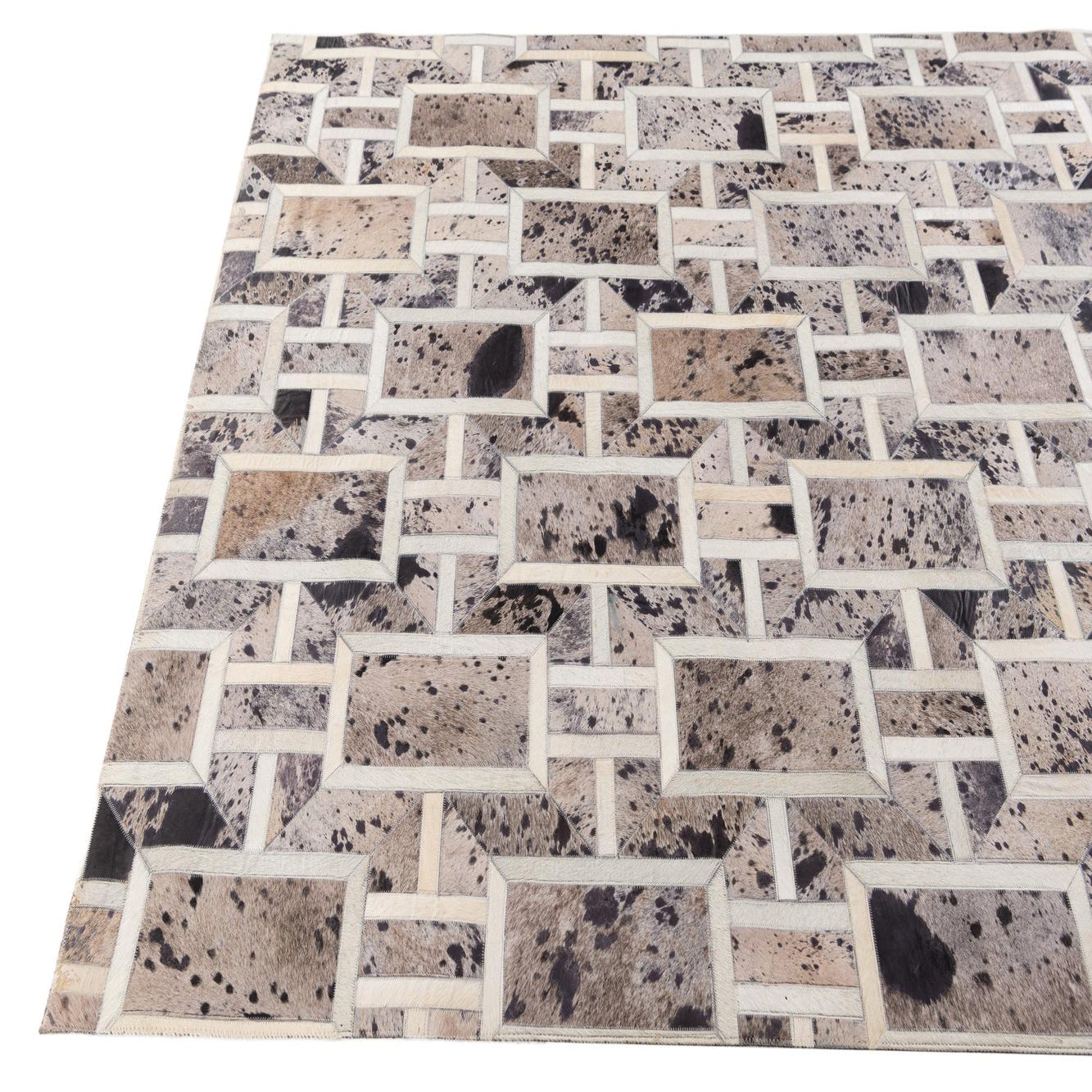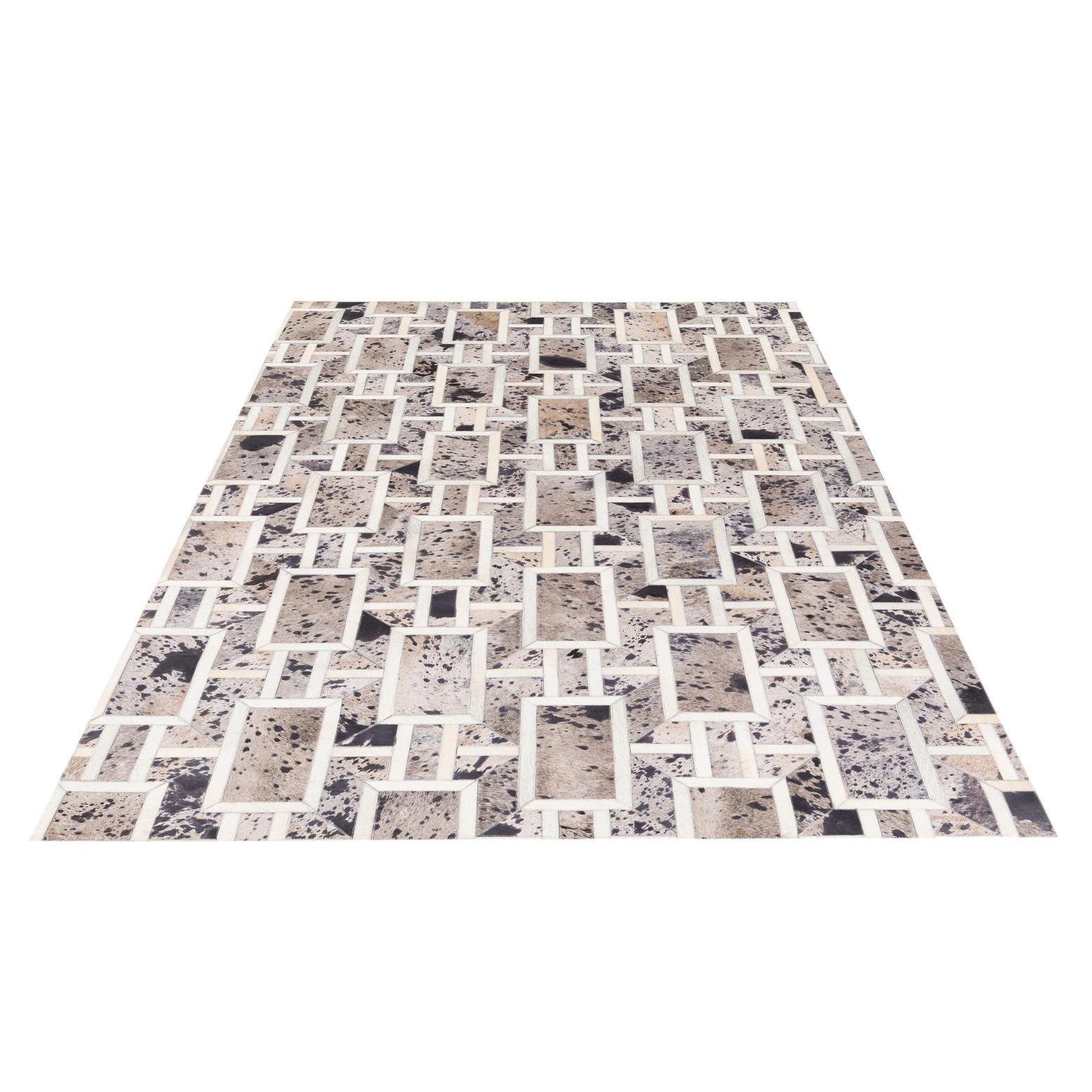A rectangular 5x8 gray patchwork cowhide rug with a geometric pattern, featuring varying shades of gray, black, and white.