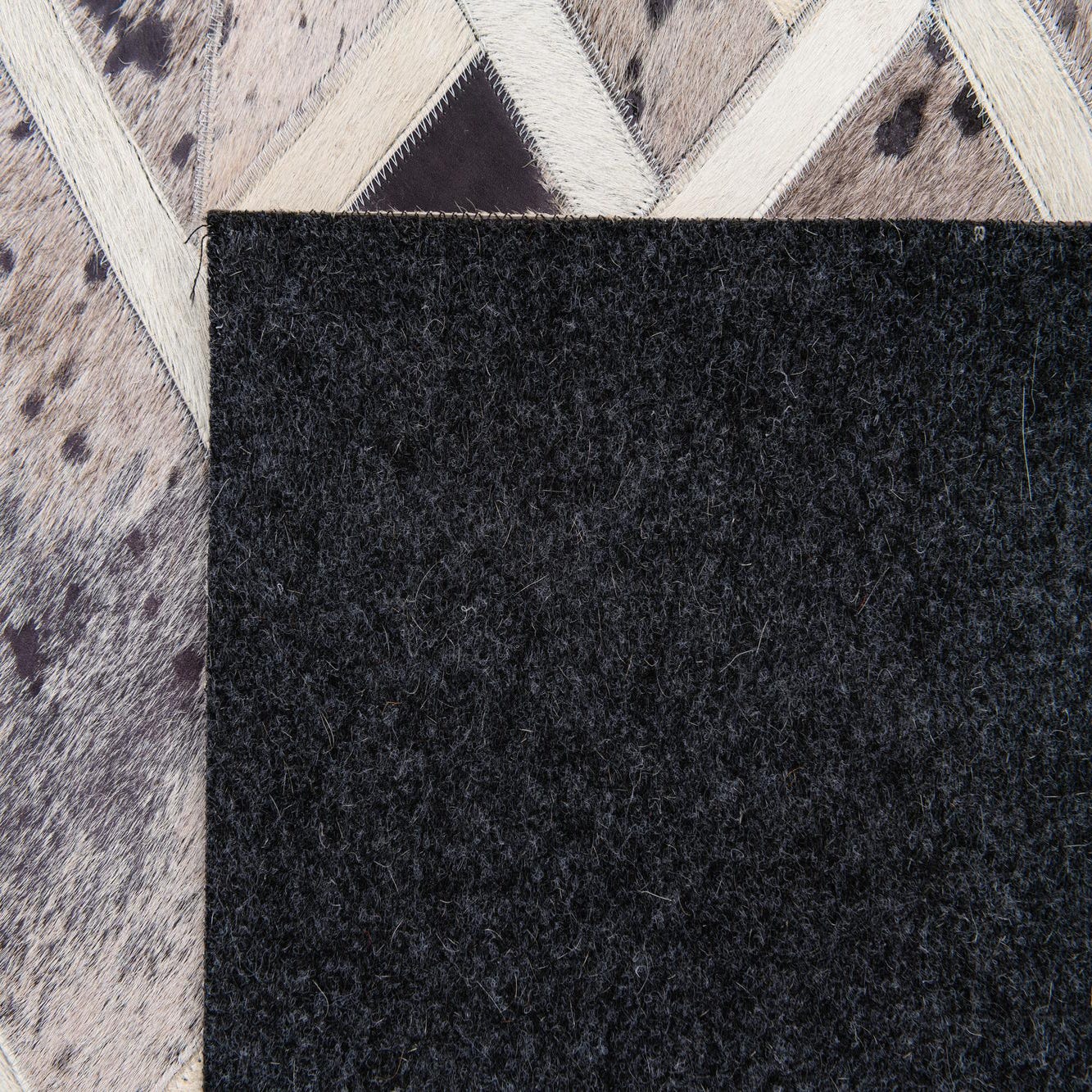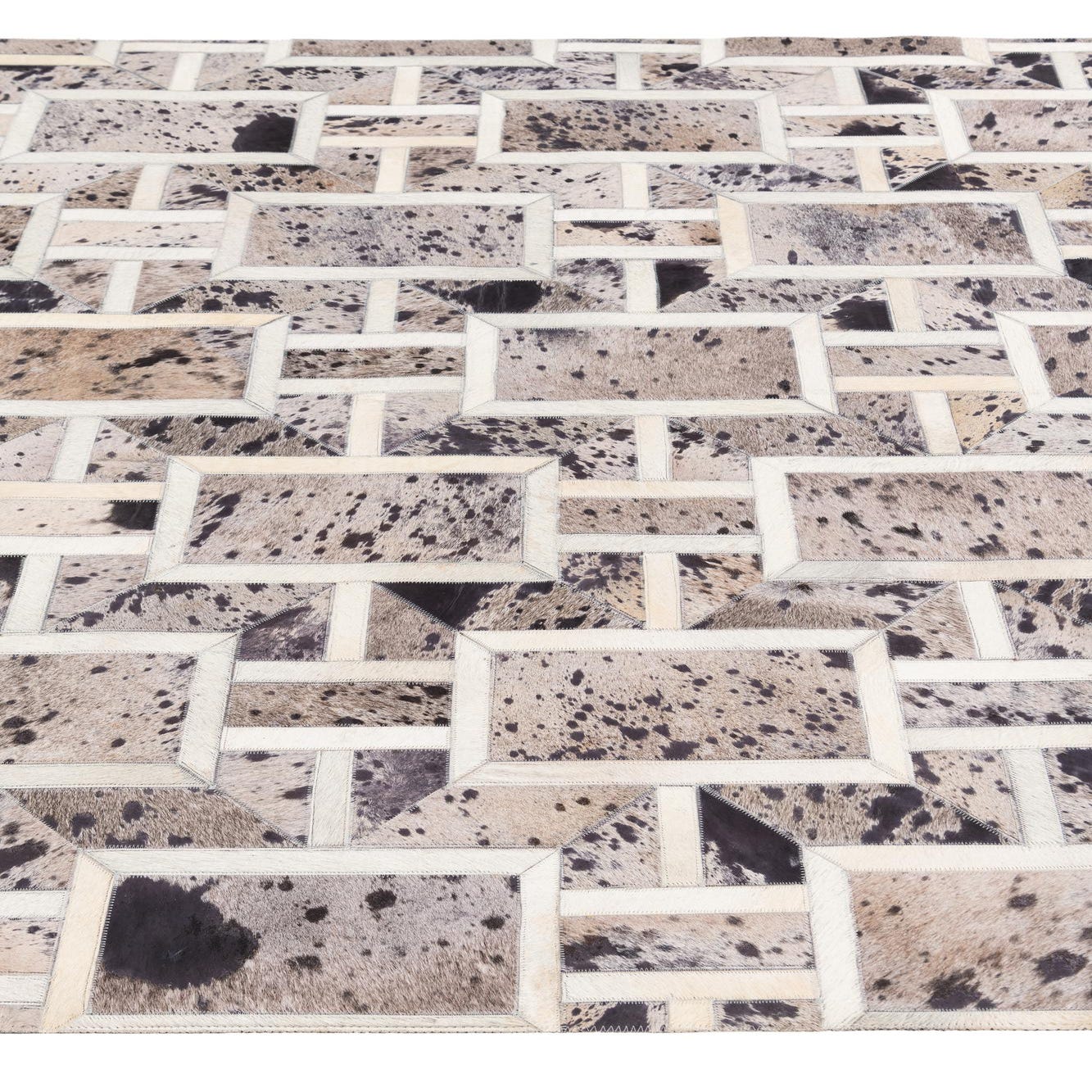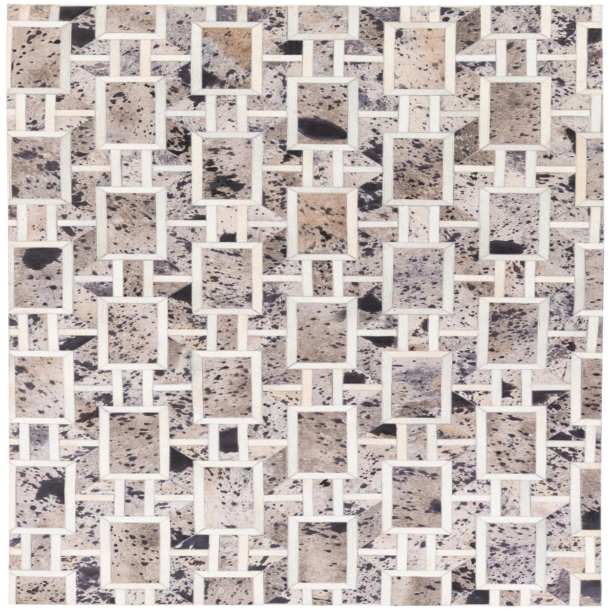 A rectangular 5x8 gray patchwork cowhide rug with a geometric pattern, featuring varying shades of gray, black, and white.