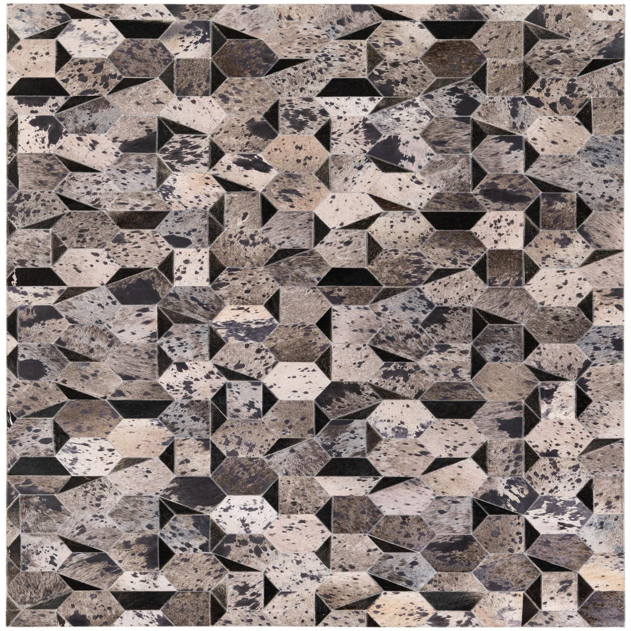 A 5x8 rectangular Cowhide Stocks rug featuring a modern geometric pattern of gray, silver, and black hexagonal patches.
