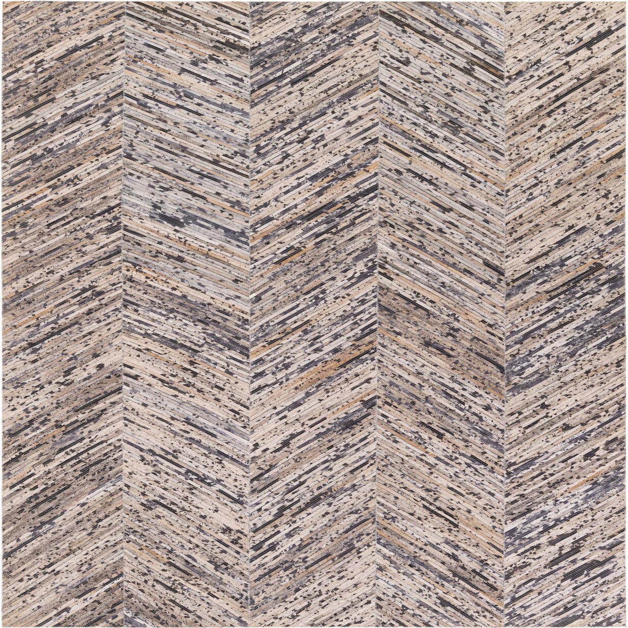 A tightly arranged chevron pattern of narrow cowhide and leather strips creates a bold V?shaped motif across a gray background. The design layers flecks of ivory, beige and brown into each stripe, producing a mottled, almost painterly effect that reads modern and grounded at the same time. The neutral palette and linear rhythm give the rug a transitional sensibility that complements both contemporary and more rustic interiors.