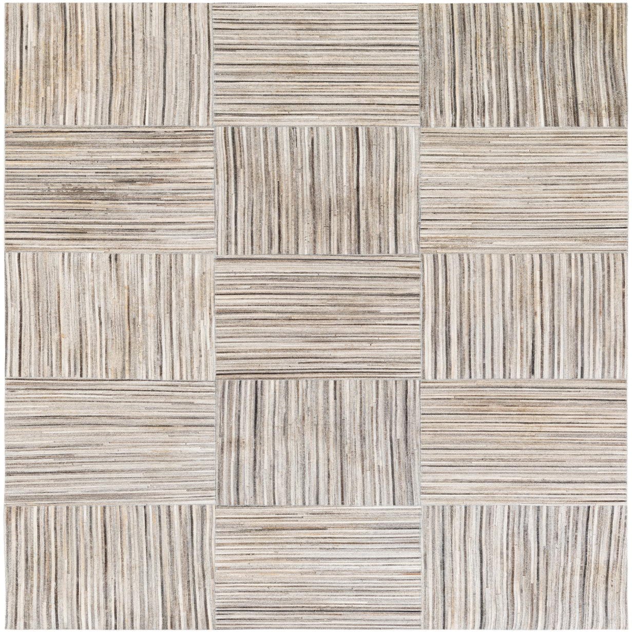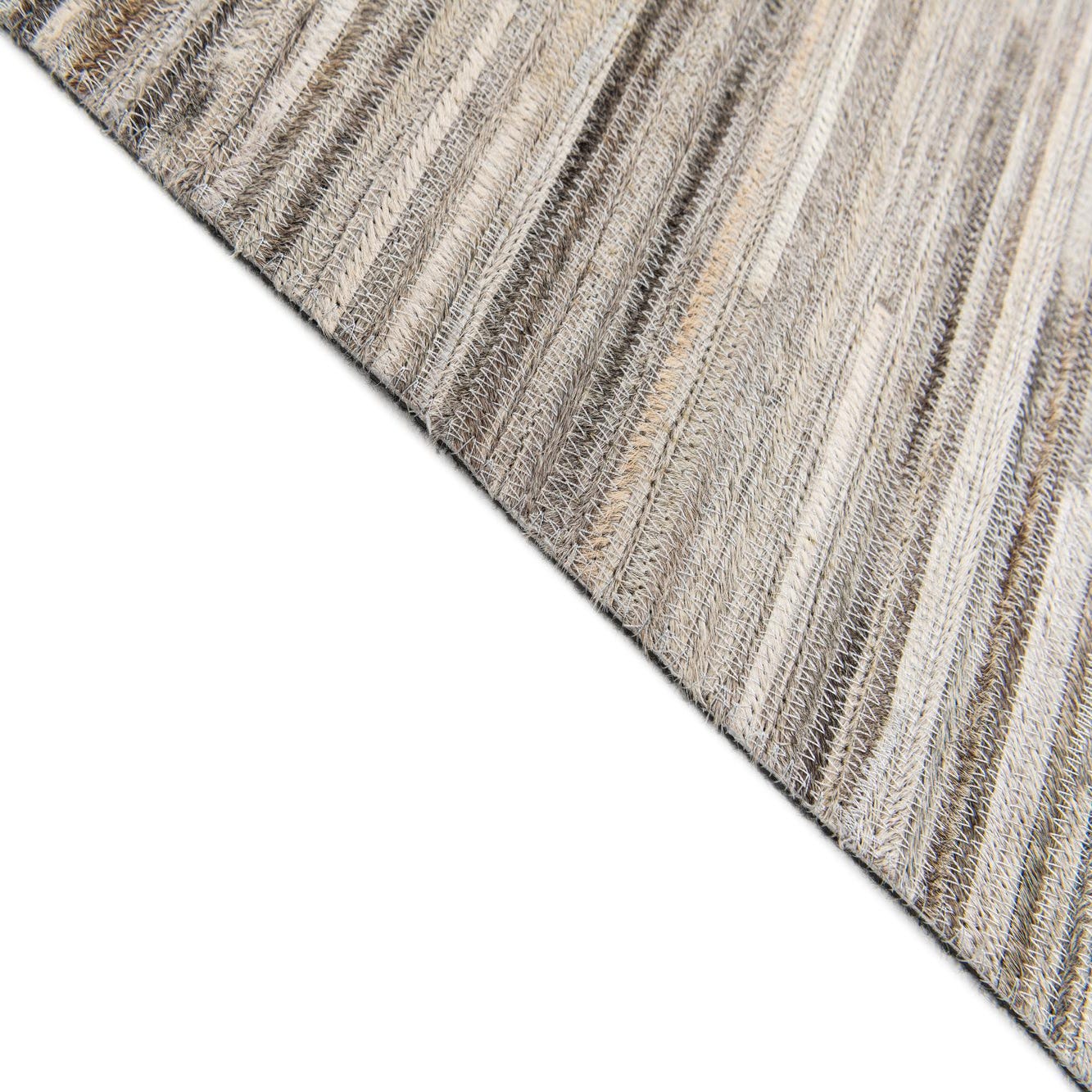 A 5x8 rectangular gray modern rug featuring a unique striped cowhide and leather patchwork design, ideal for a living room.