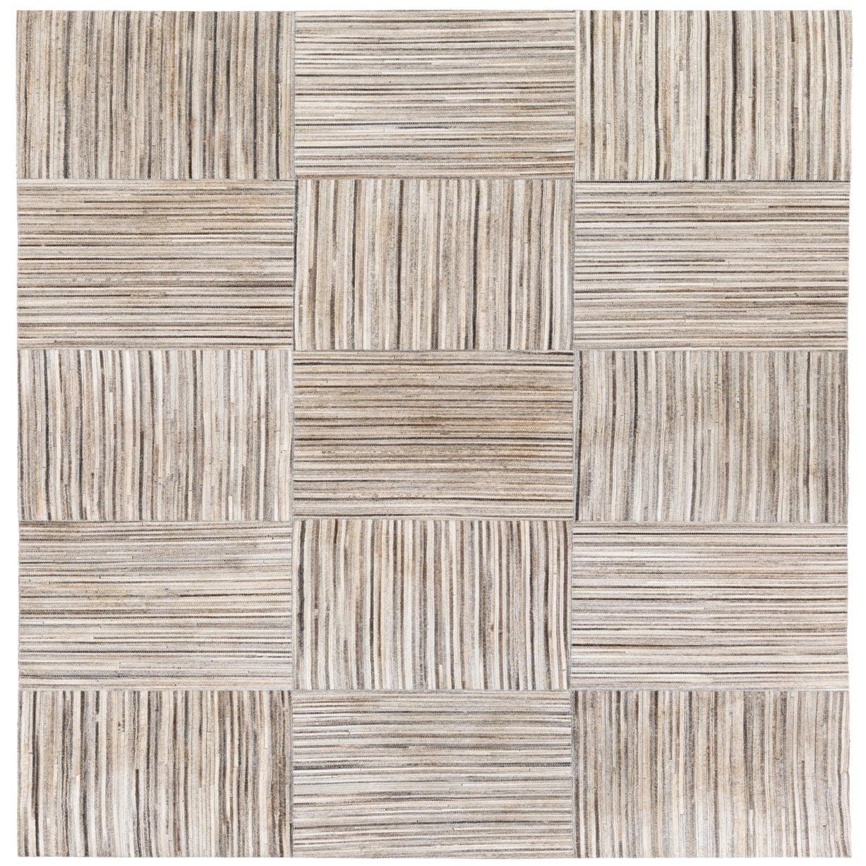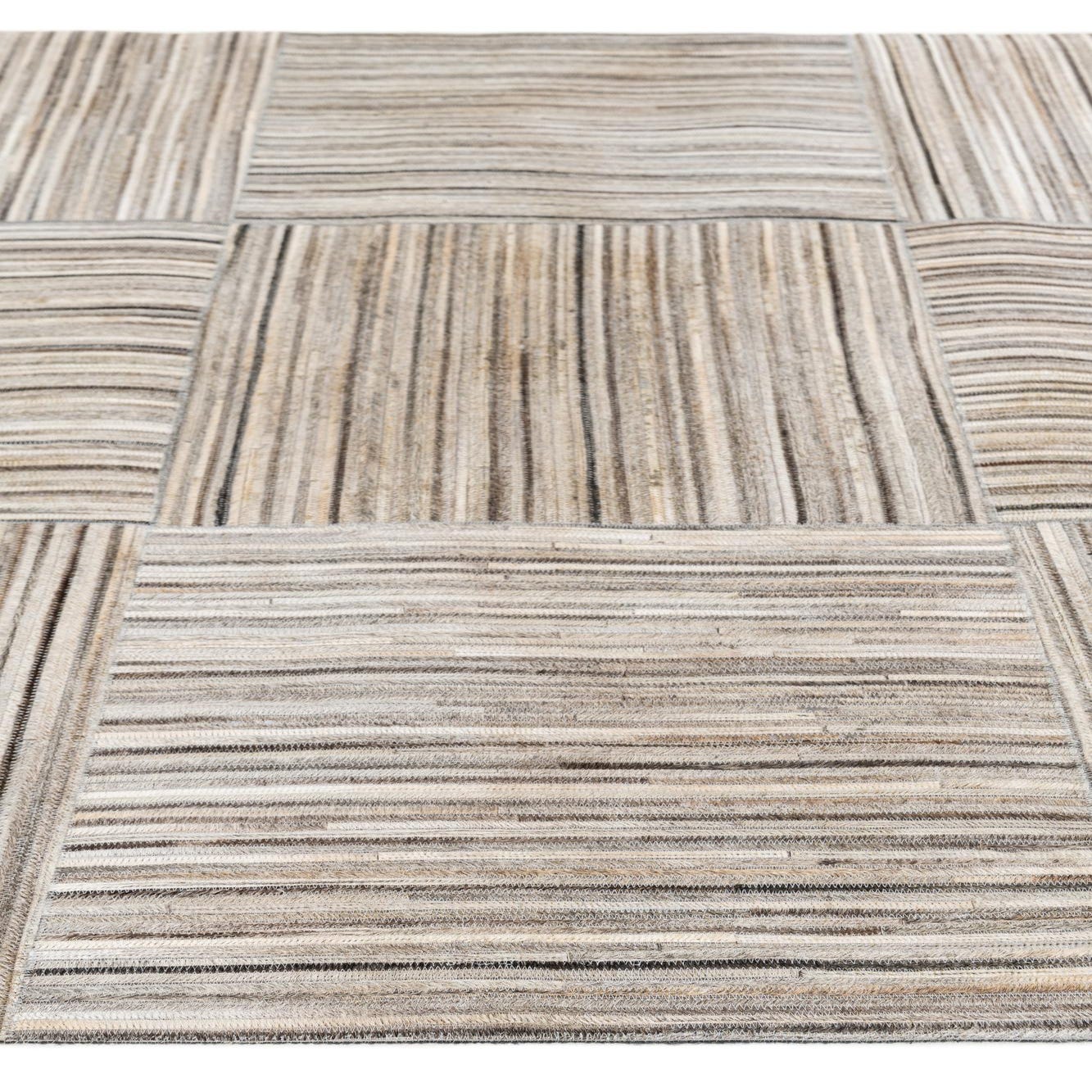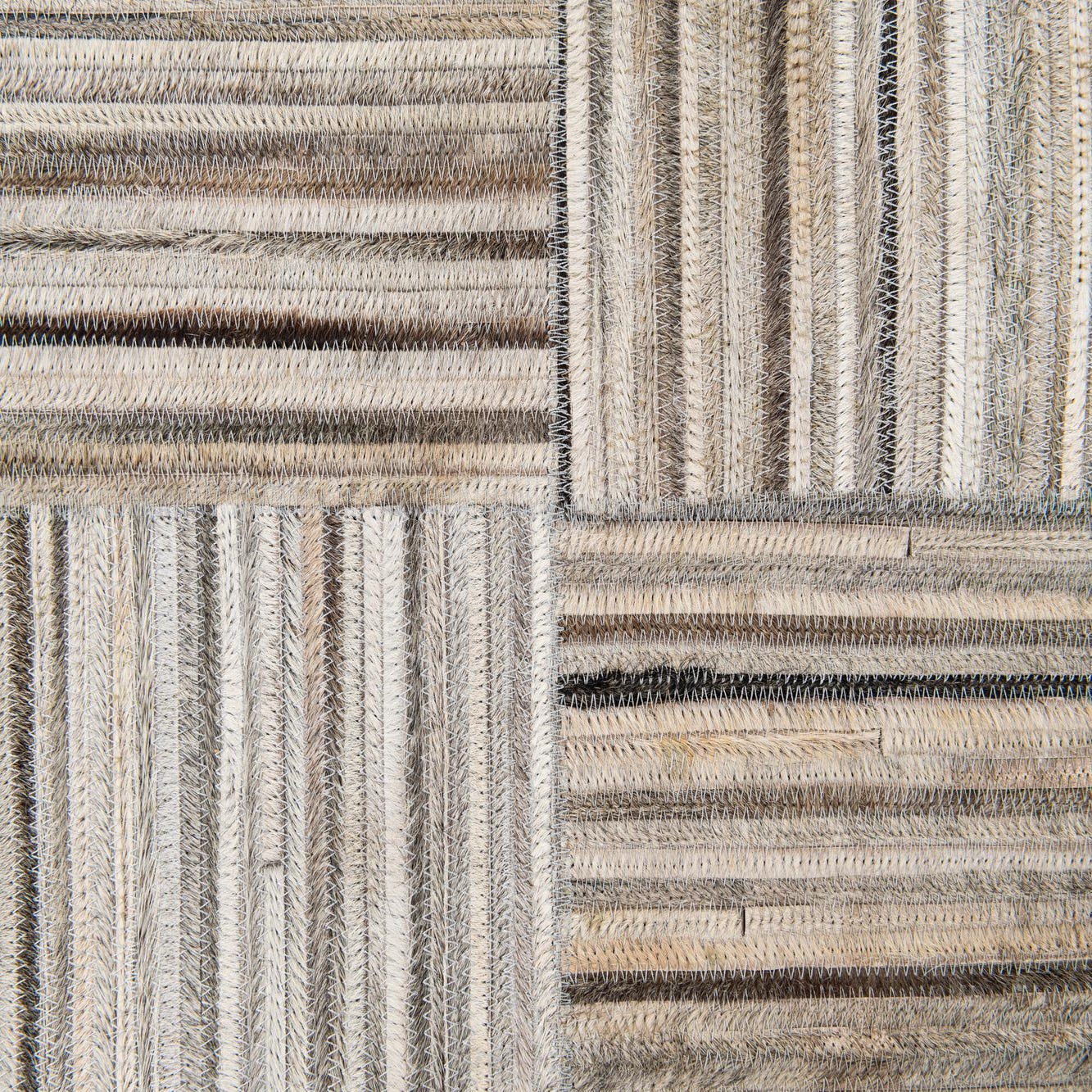 A 5x8 rectangular Cowhide Stocks rug from Rugs.com featuring a modern striped pattern in varying shades of gray.