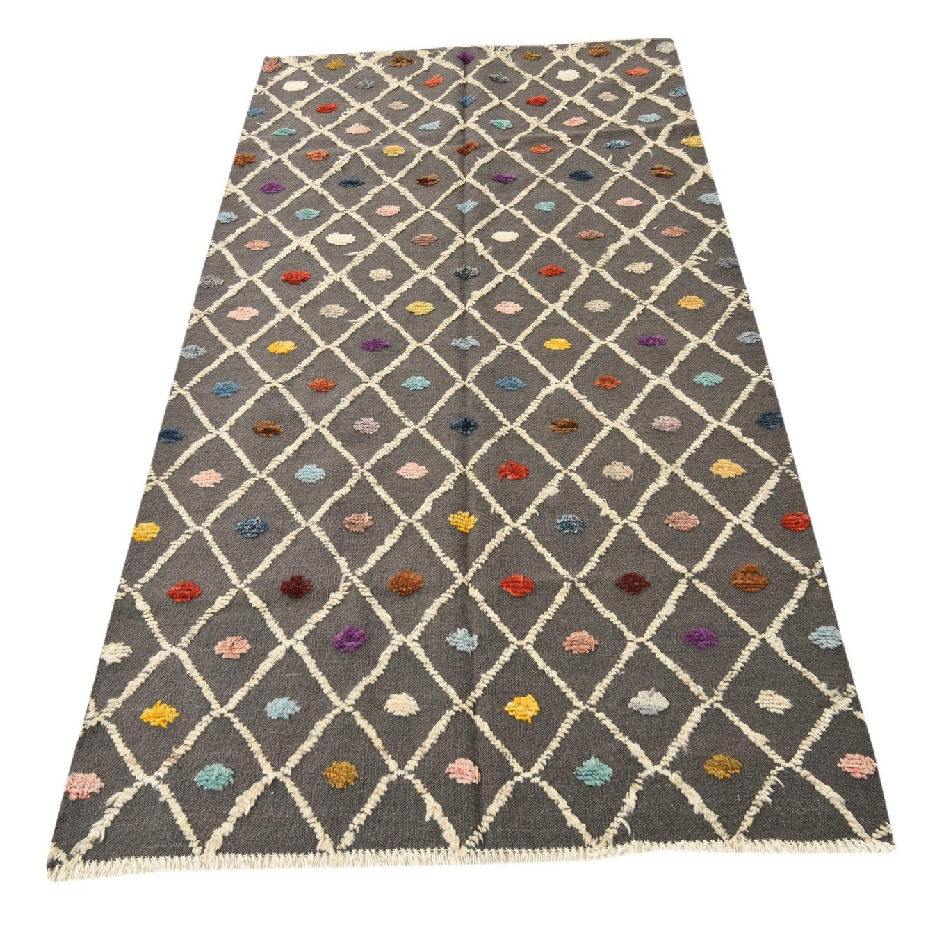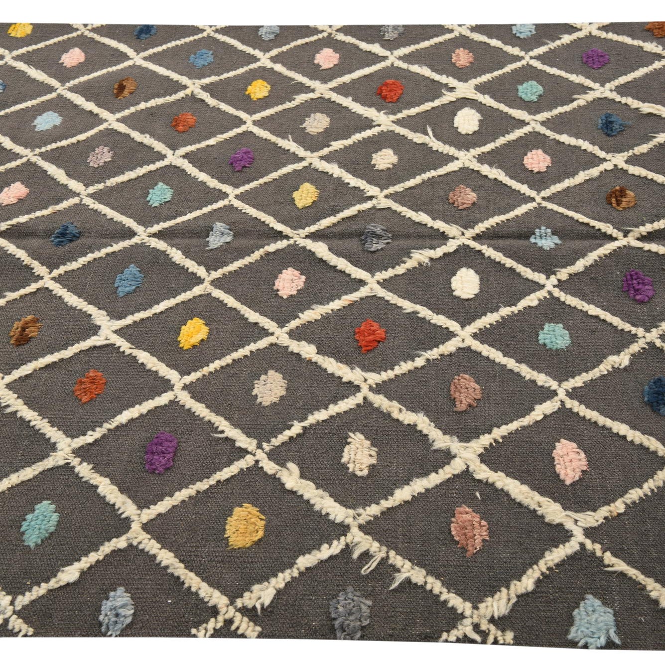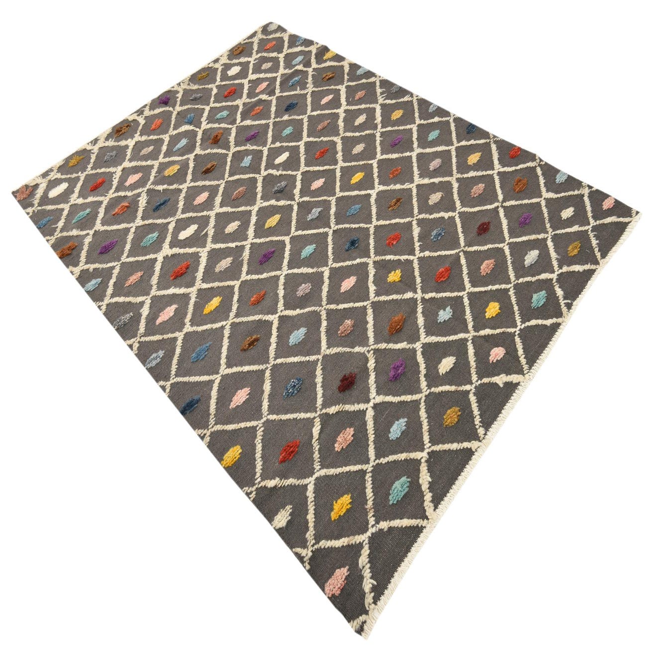 A 5x8 rectangular Darya rug in gray wool with a modern diamond pattern and colorful abstract dots.