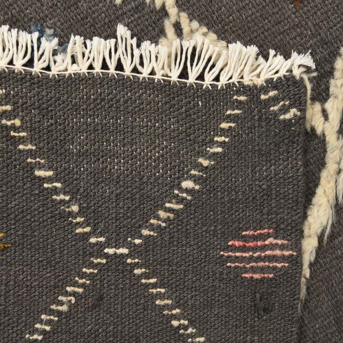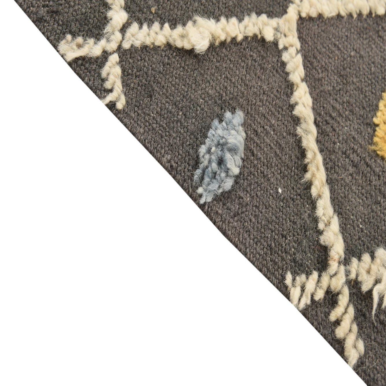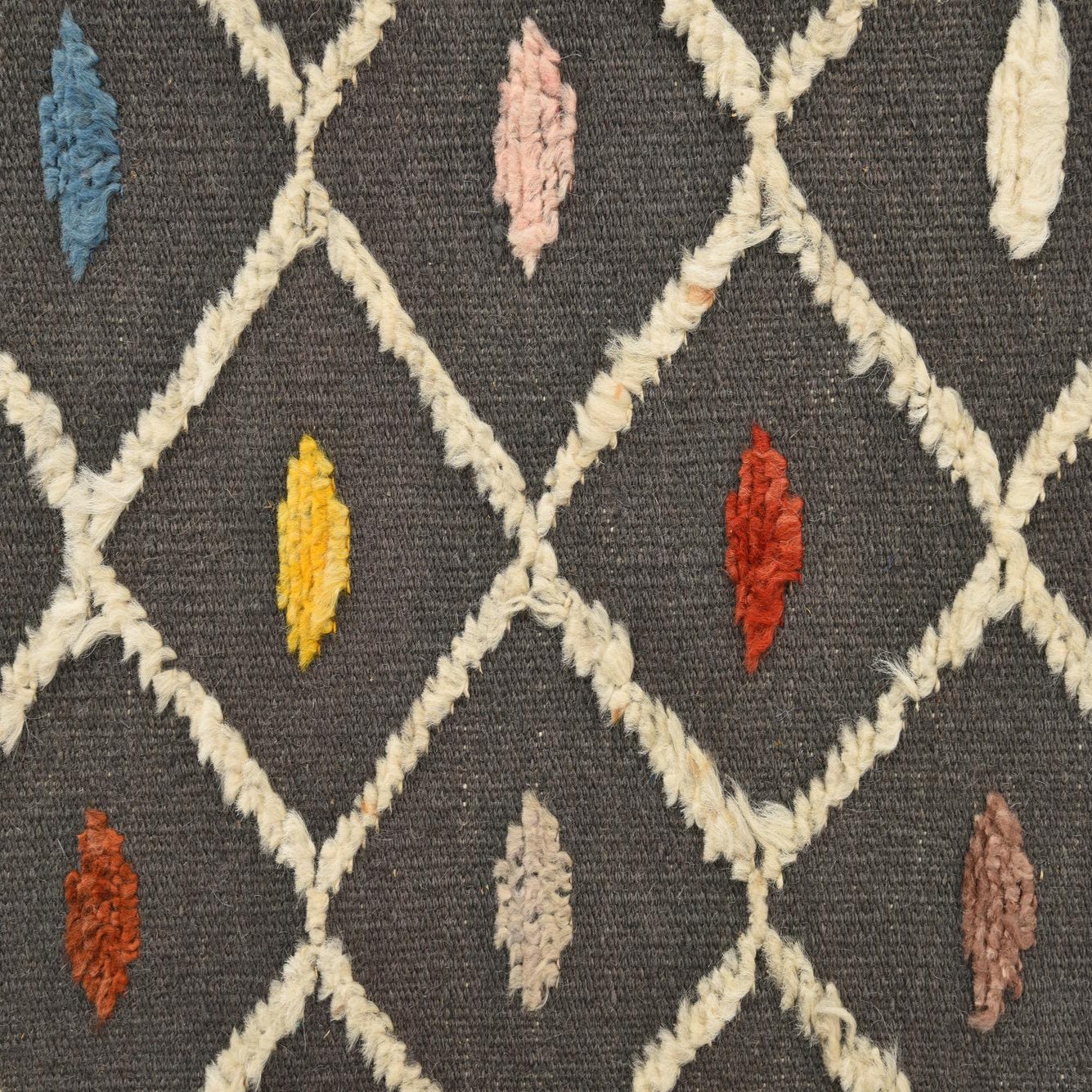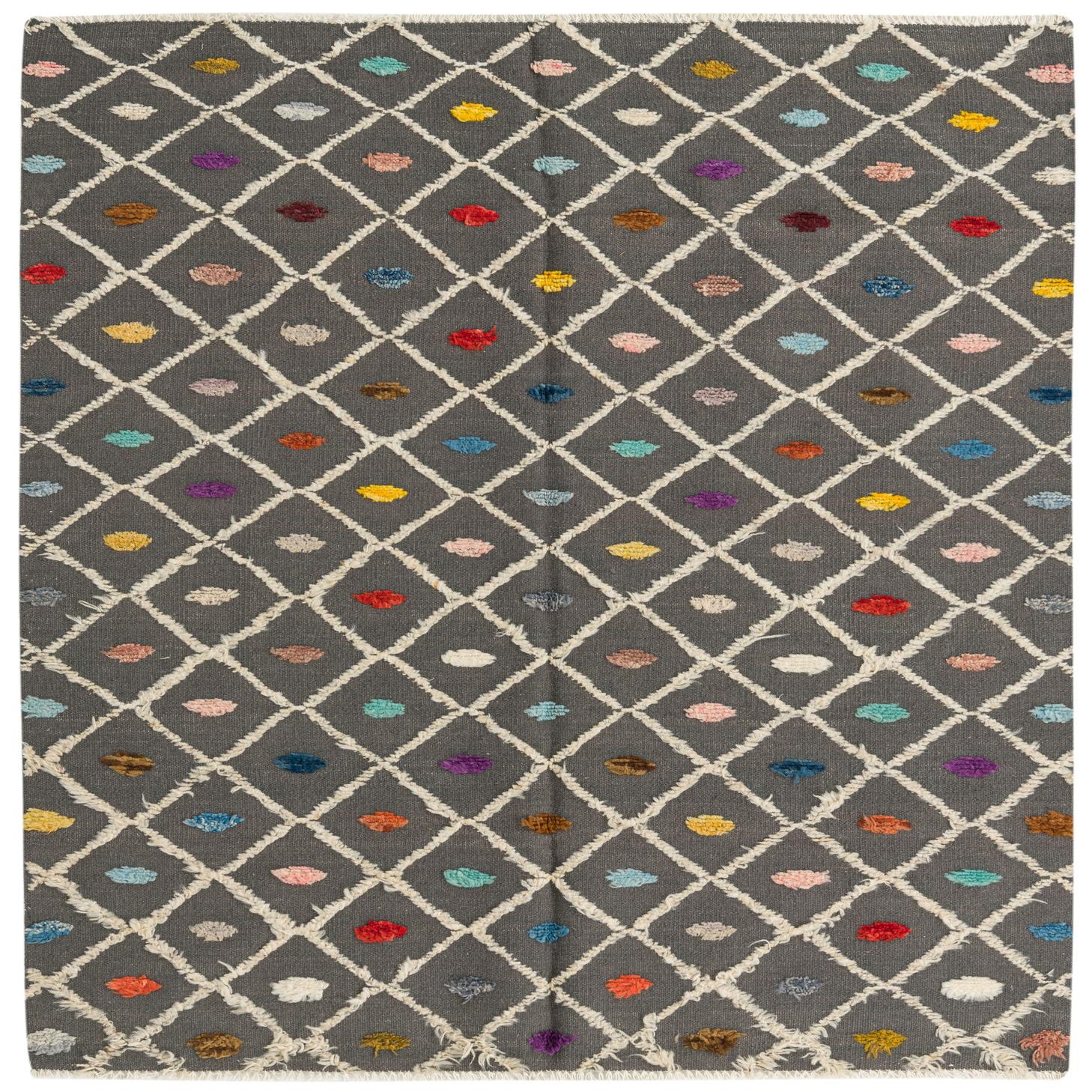 A 5x8 rectangular Darya rug in gray wool with a modern diamond pattern and colorful abstract dots.