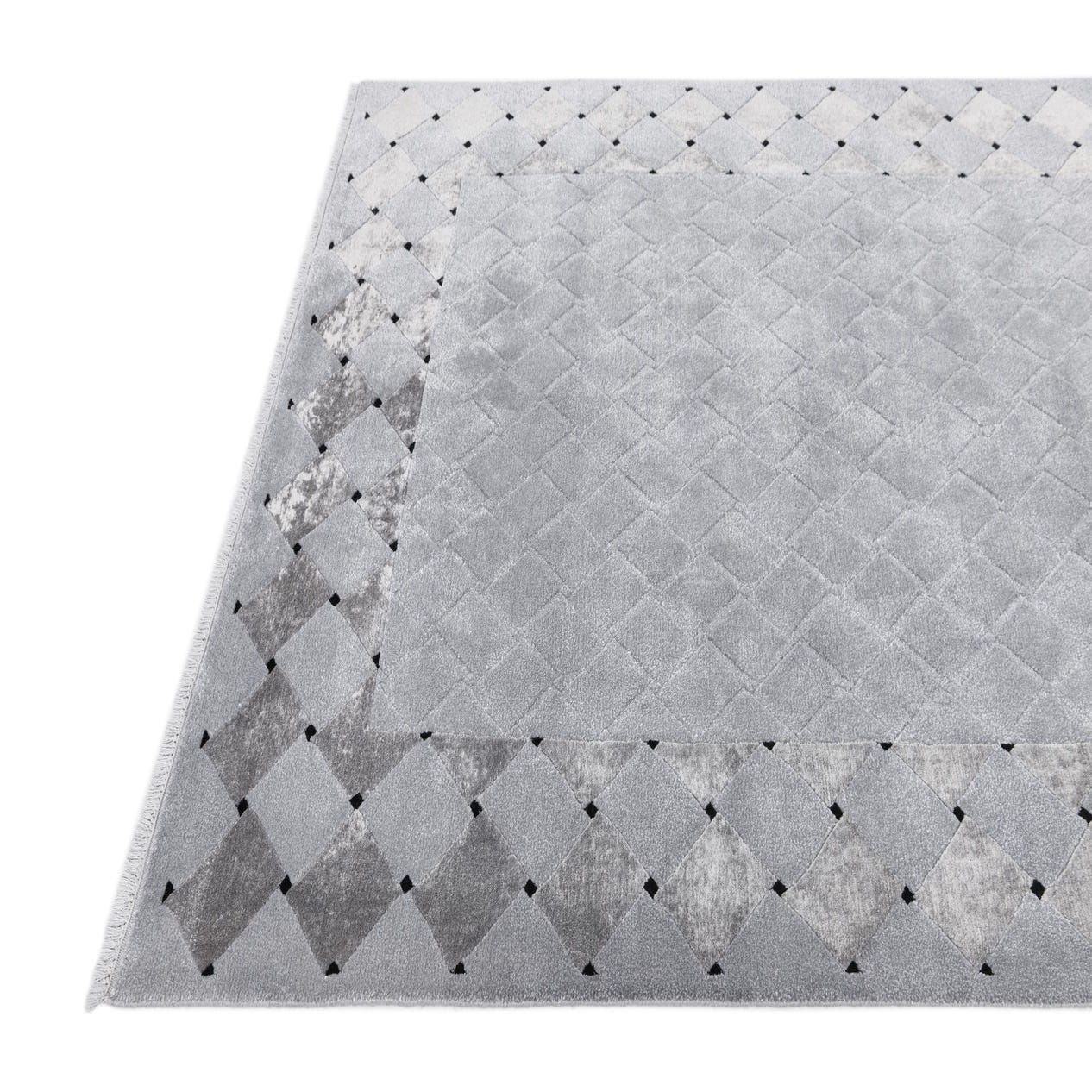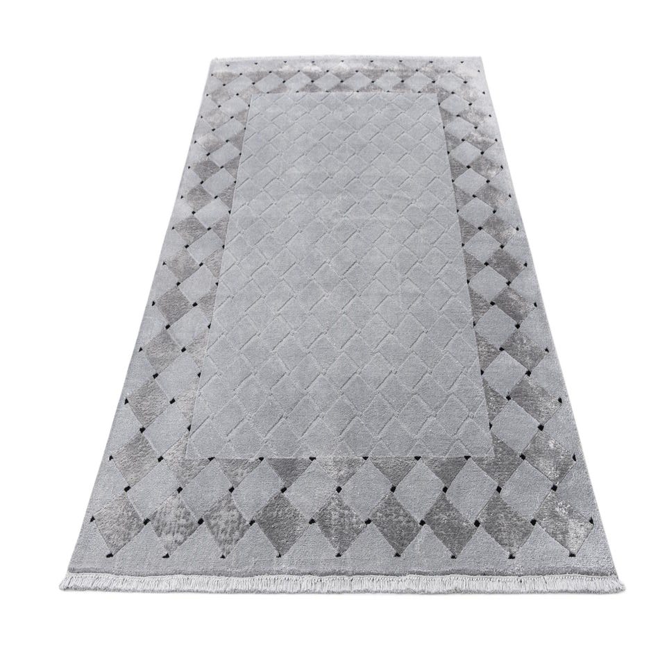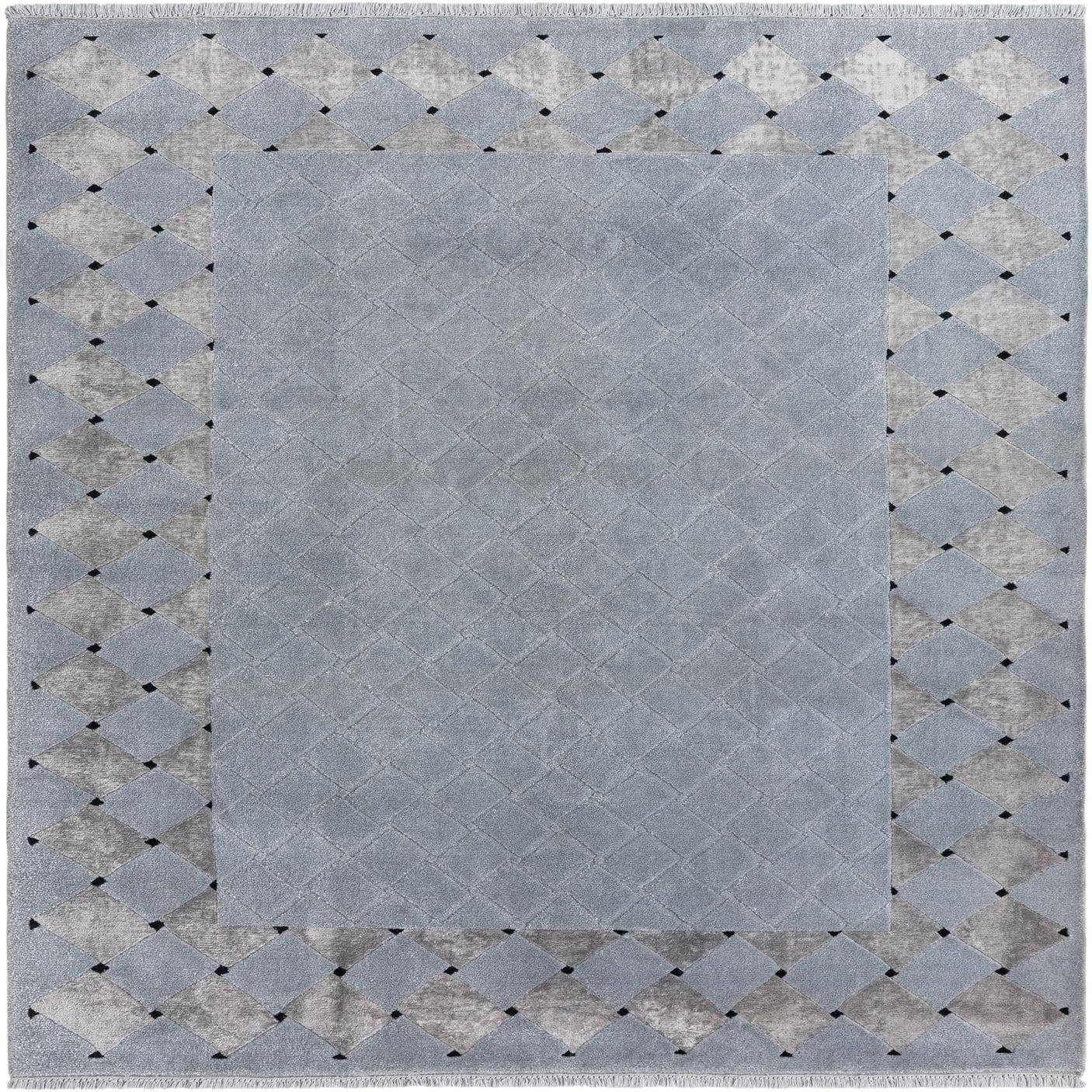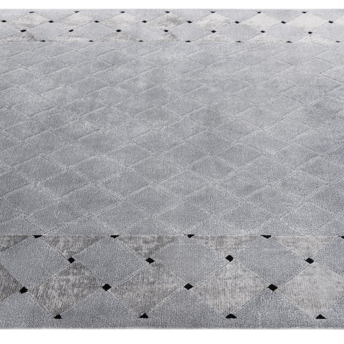 A 5x8 rectangular Darya rug with a modern oriental pattern in shades of gray and silver, featuring a central diamond pattern and a contrasting border with small black squares.