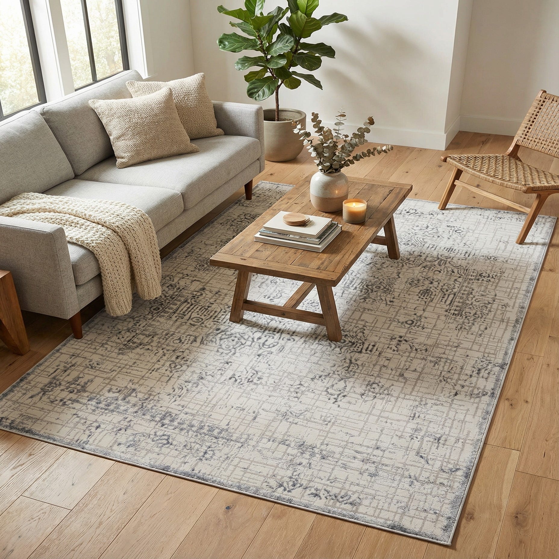 This neutral palette and gently distressed pattern work well in contemporary and transitional interiors—place it under a low coffee table in a living room to soften modern furnishings, or use it to add subtle pattern and warmth beneath a bed in a serene bedroom. It also pairs nicely with clean-lined wood furniture, light leathers, or layered textiles for a comfortable, calm look in a home office or dining area.