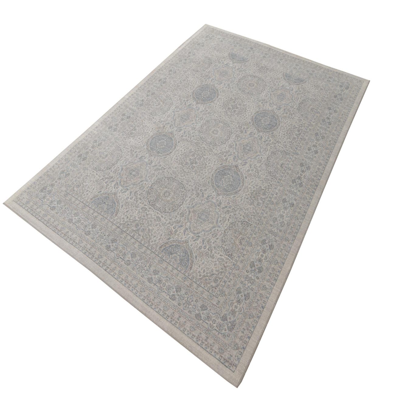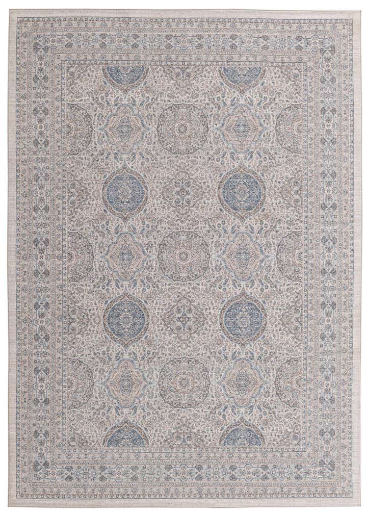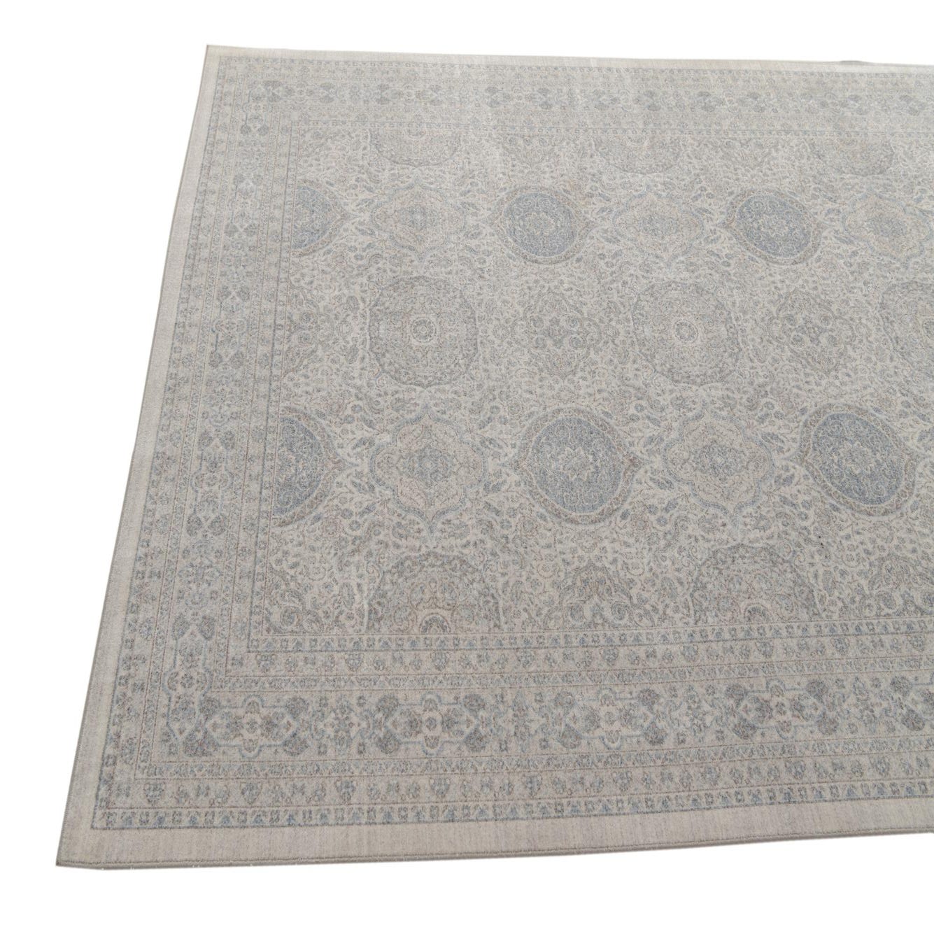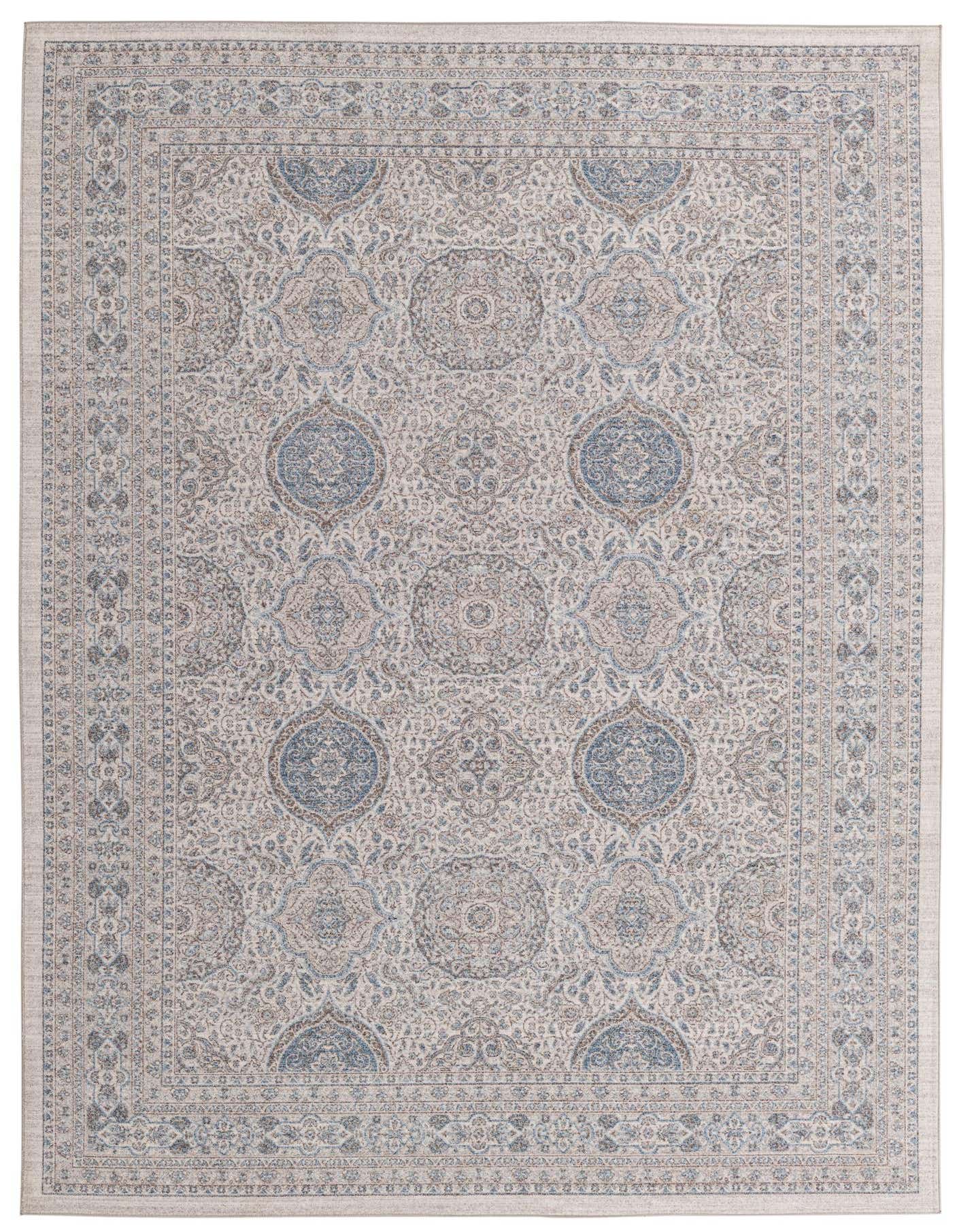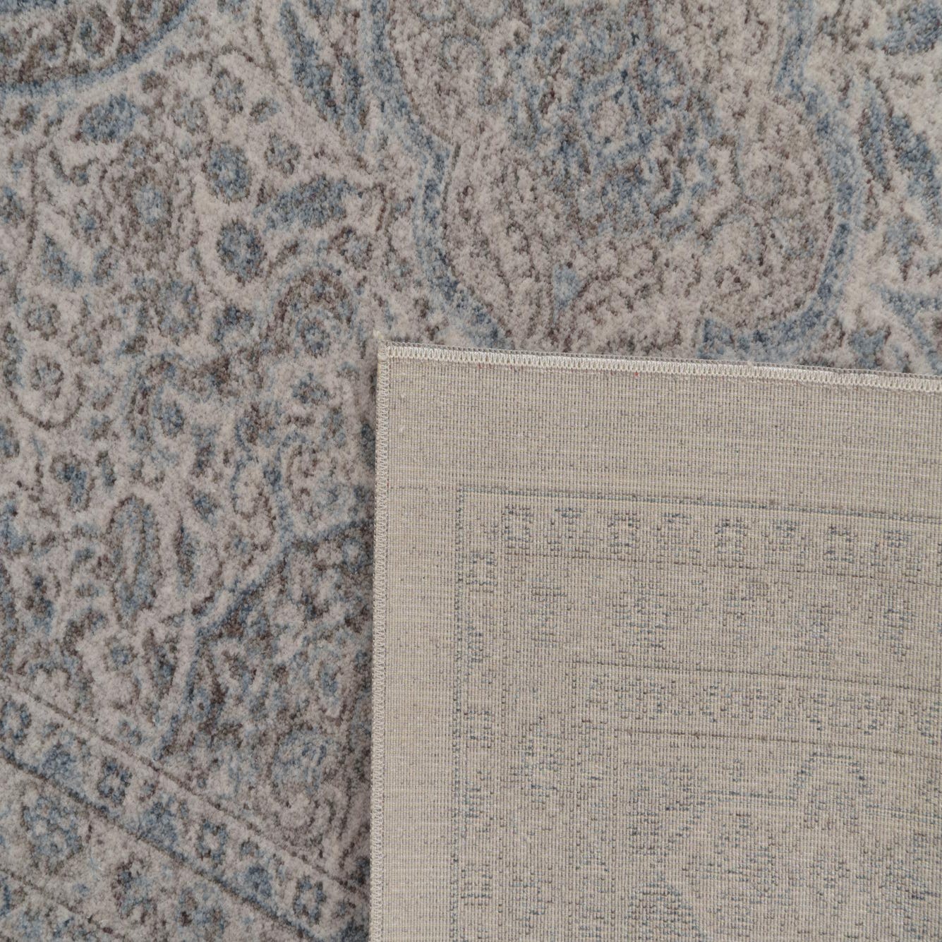 Primary color is Gray. Colors in this rug include: Gray, Ivory, Navy Blue, Light Blue.