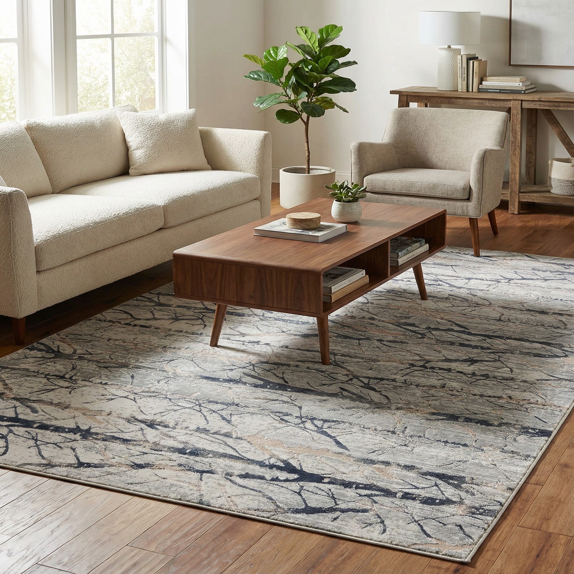 Use this rug to anchor a neutral living room seating area or place it beneath a coffee table to introduce quiet pattern without competing with other elements. It also fits well under a bed to soften the bedside step, or layered in an entry or home office to lend a calming, nature-inspired touch. Pair with warm wood furniture, ivory linens, and matte metal accents for a contemporary Scandinavian, coastal, or modern transitional look.