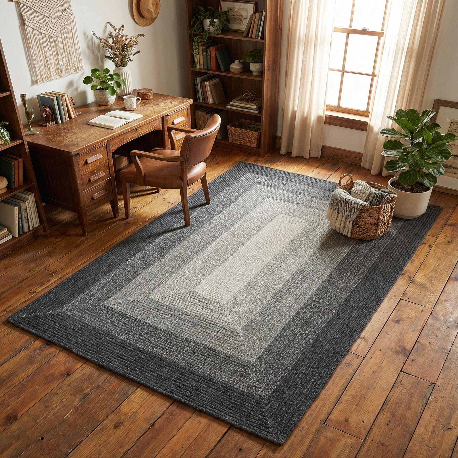 The neutral gradient and classic braided construction work well in a range of interiors. Use it to anchor a living room seating area beneath a sofa and coffee table, place it at the foot of a bed to add warmth to a bedroom, or set it in a reading nook or home office to bring layered texture to wood or leather furnishings. Its versatile gray palette pairs easily with minimalist, modern farmhouse, or transitional decor.