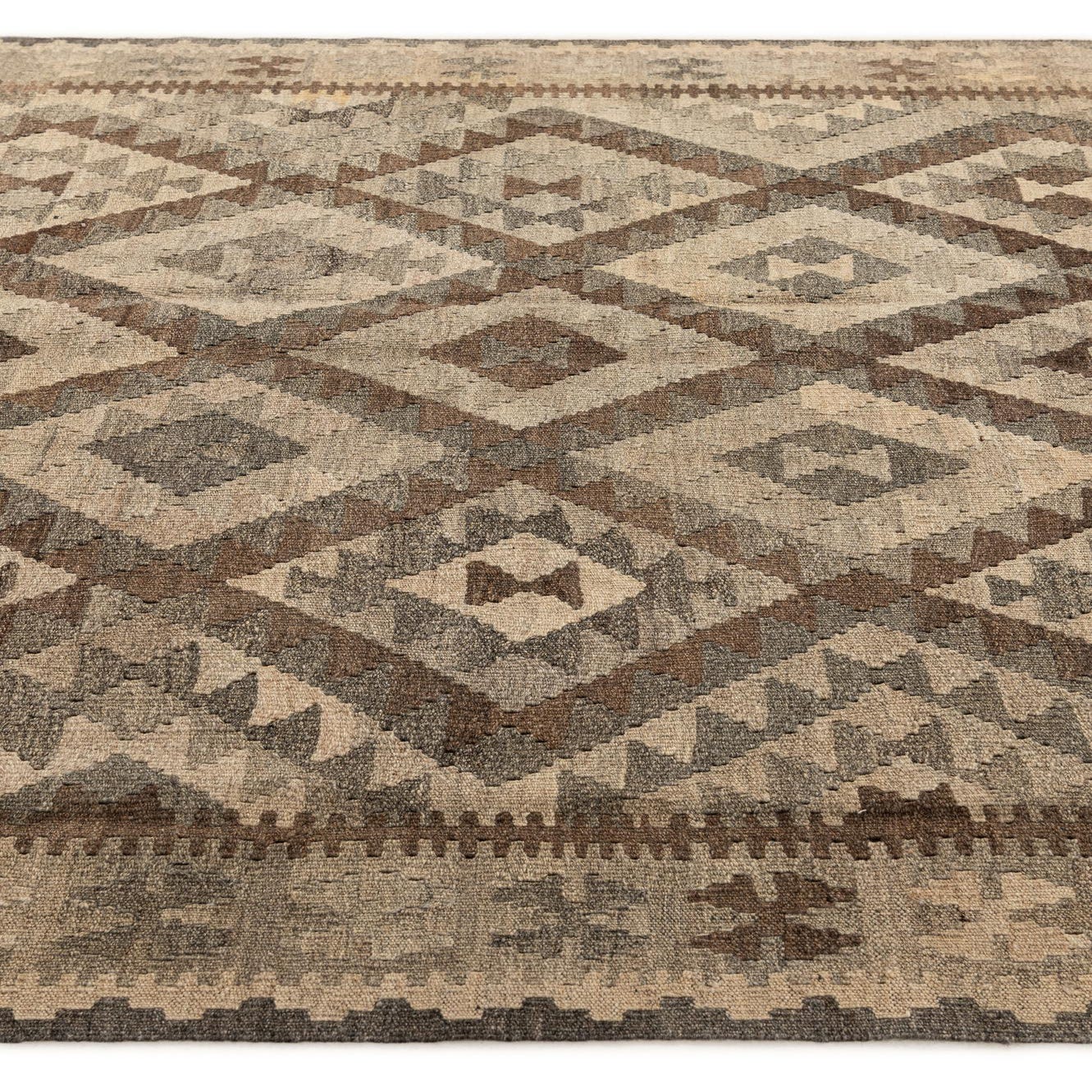 A 5x8 rectangular Kilim Maymana rug featuring a tribal geometric pattern in shades of gray and silver, with a flatweave texture.