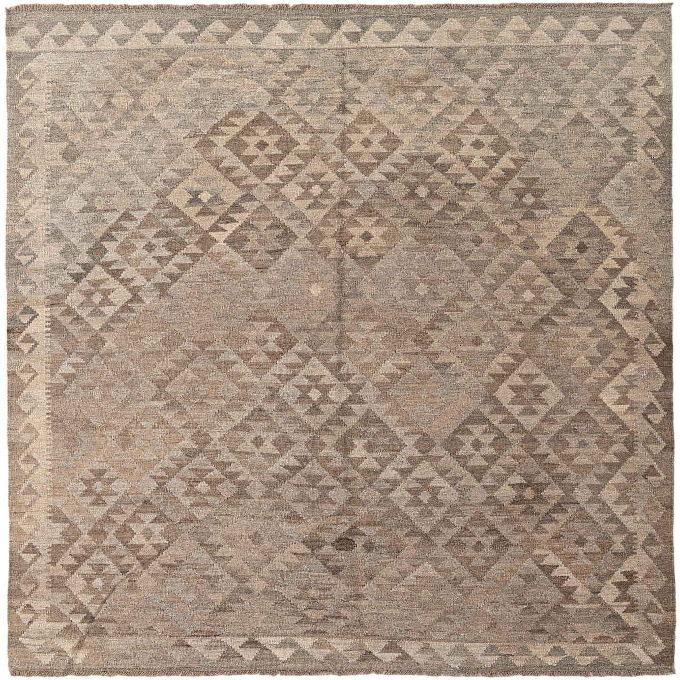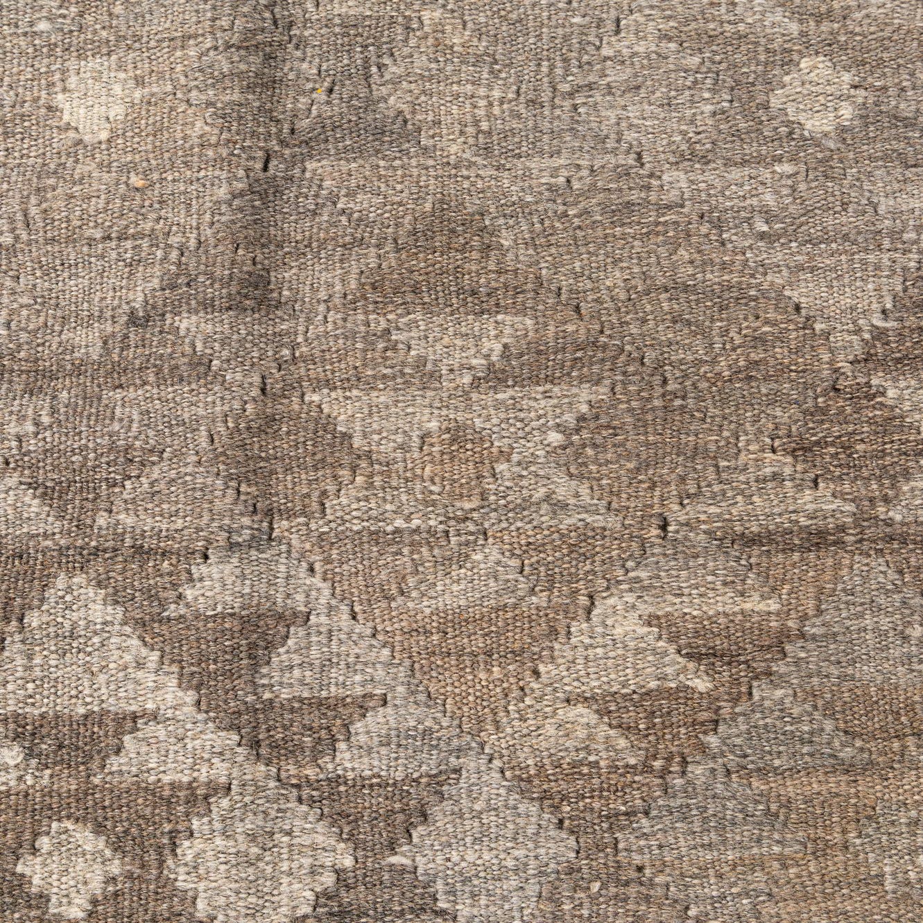 A 5x8 rectangular Kilim Maymana rug featuring a tribal geometric pattern in varying shades of gray and silver, suitable for a living room.