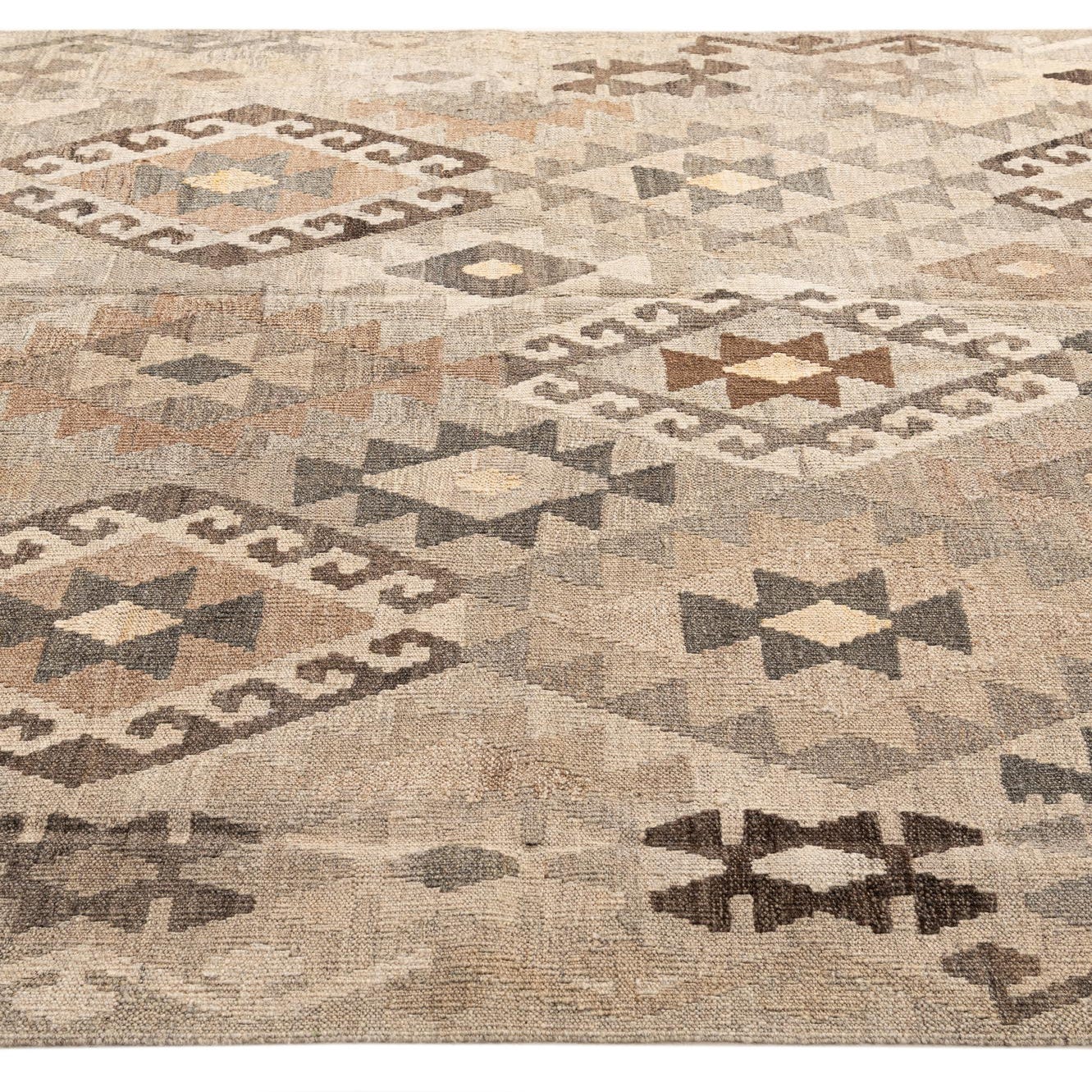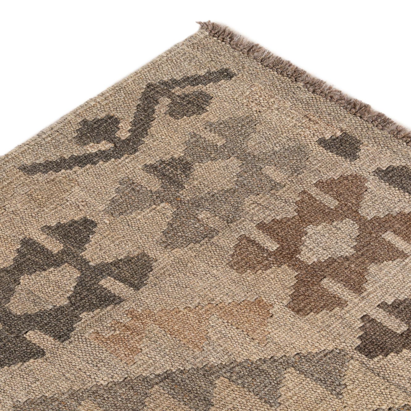 A 5x8 rectangular Kilim Maymana wool rug featuring a tribal geometric pattern in various shades of gray, silver, and brown.