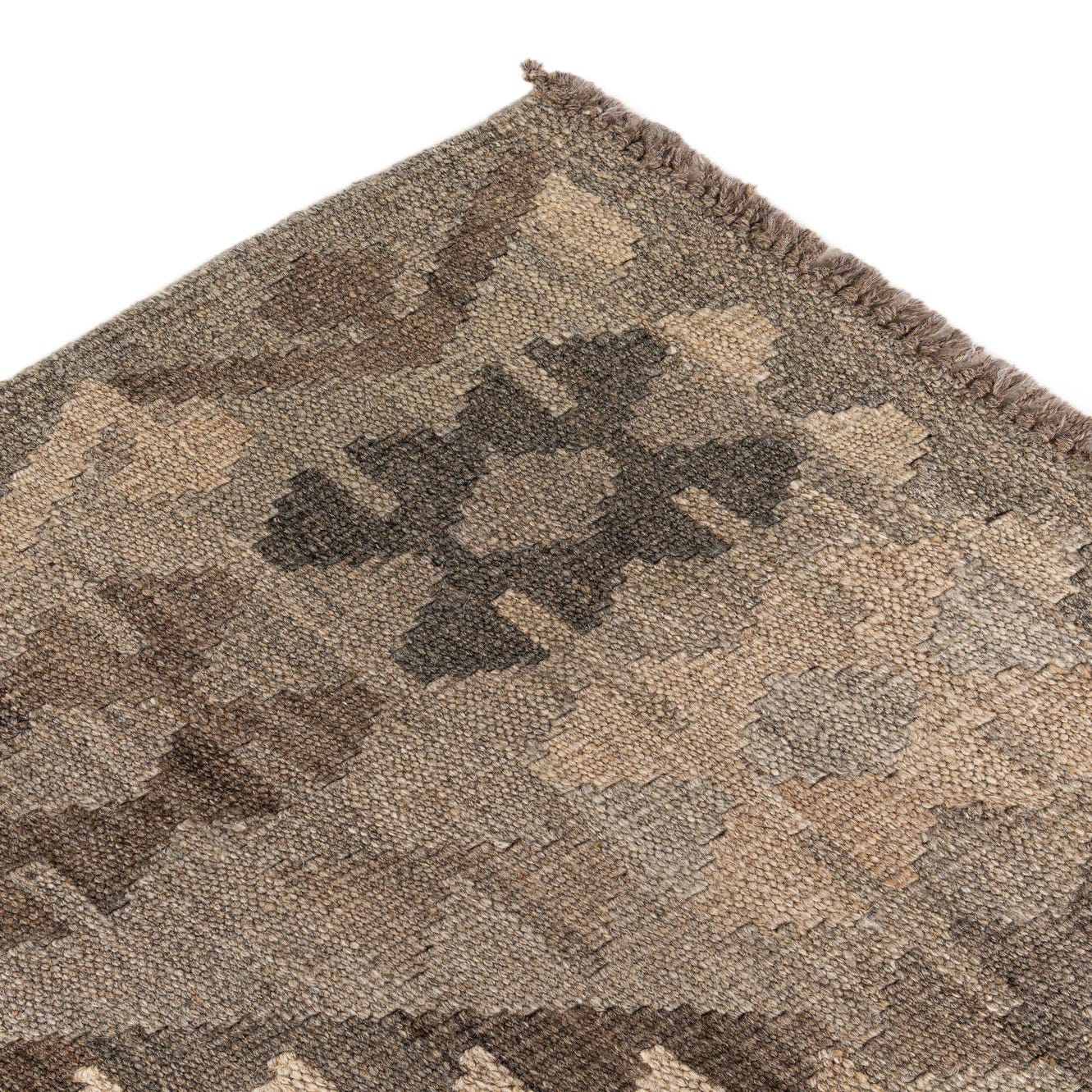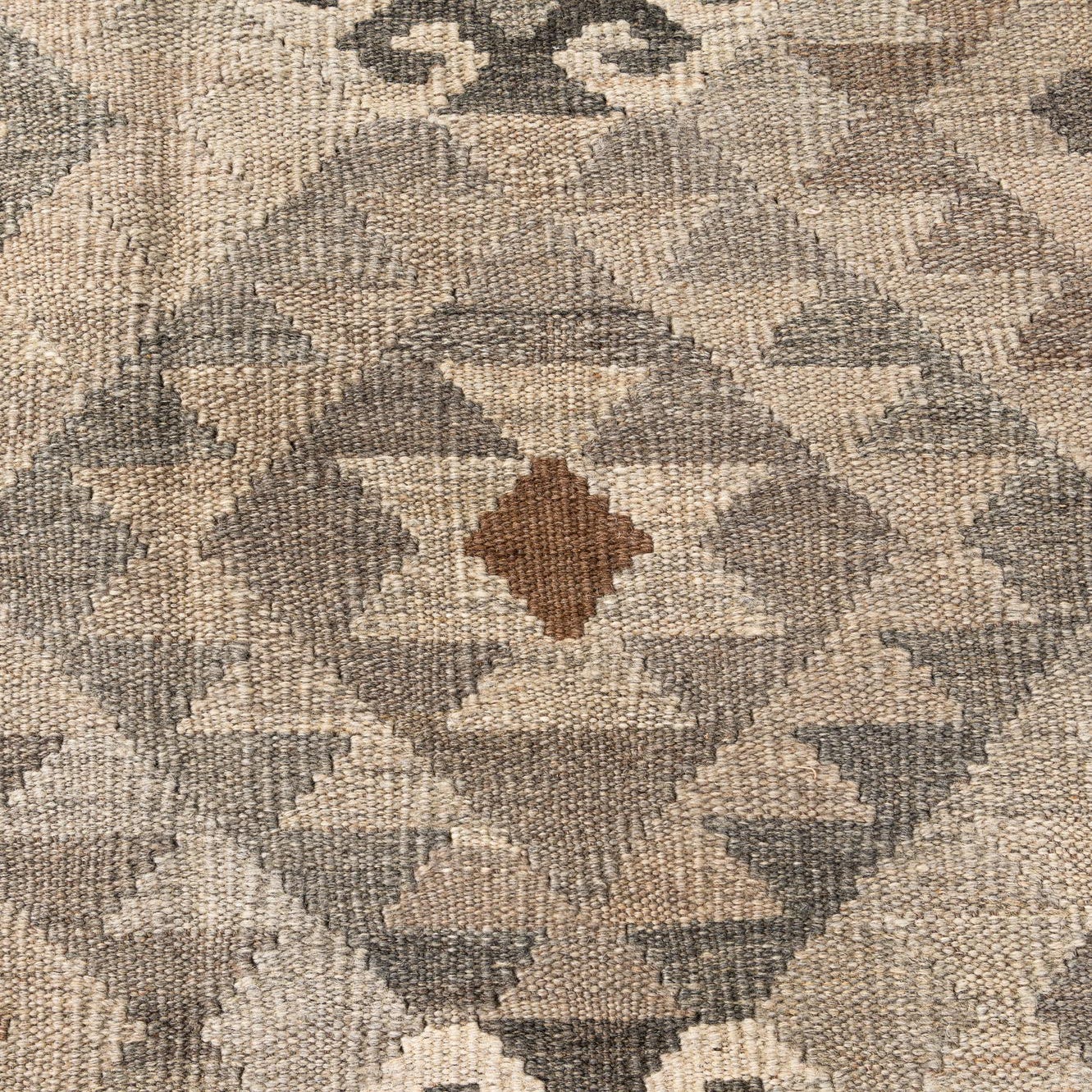 A 5x8 rectangular Kilim Maymana rug featuring a tribal geometric pattern in various shades of gray and silver.