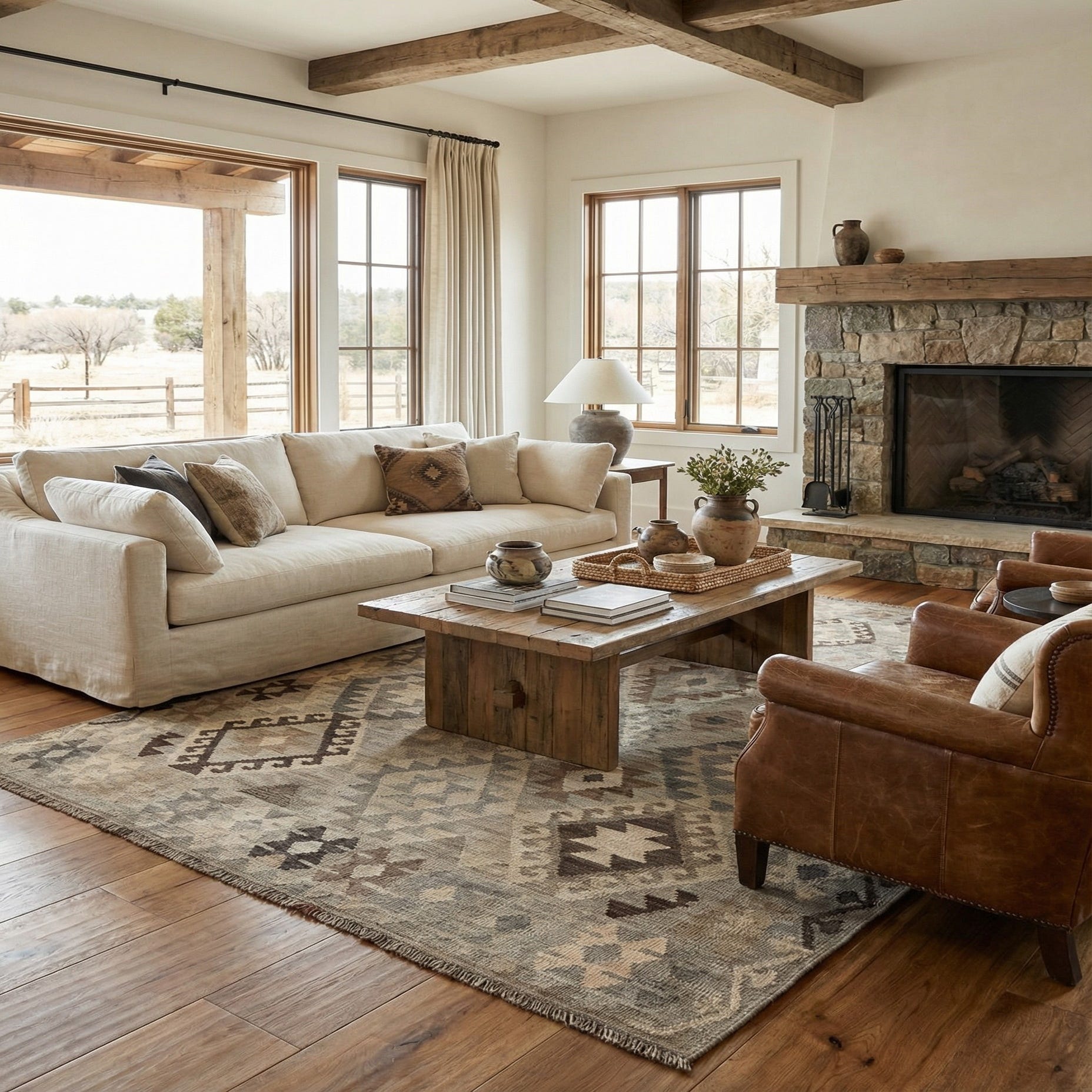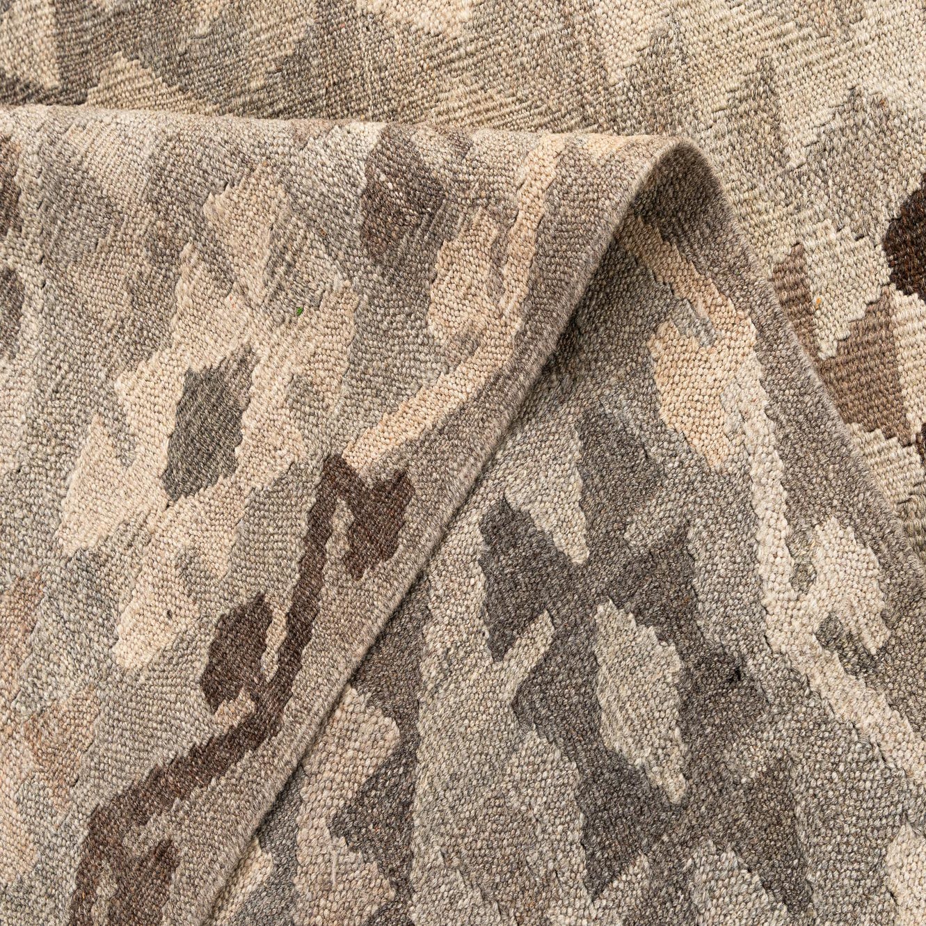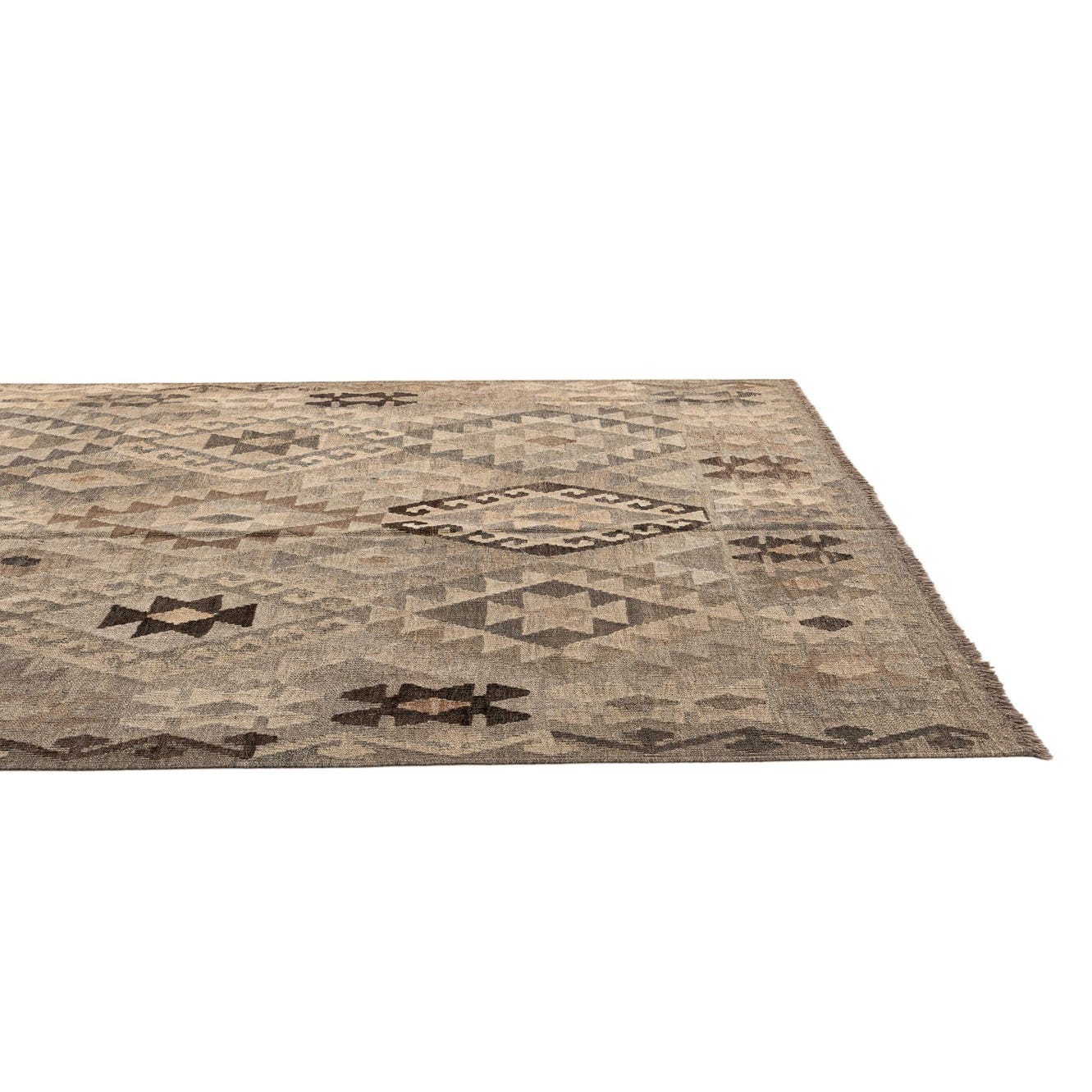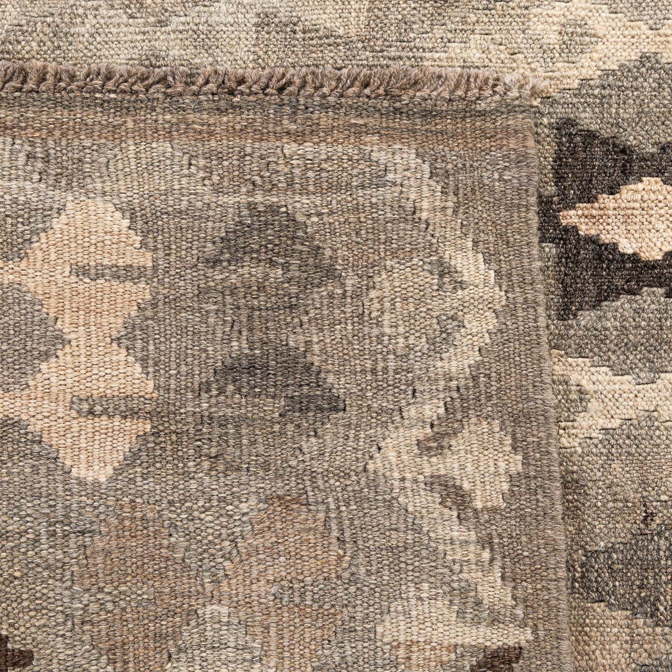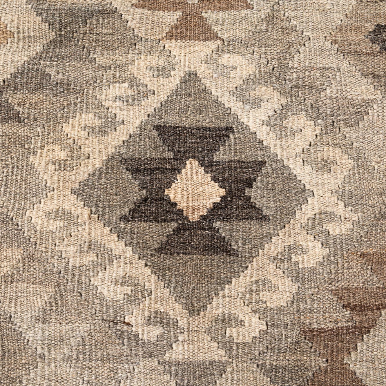 A 5x8 rectangular Kilim Maymana rug featuring a tribal geometric pattern in various shades of gray, silver, and brown, suitable for a living room.
