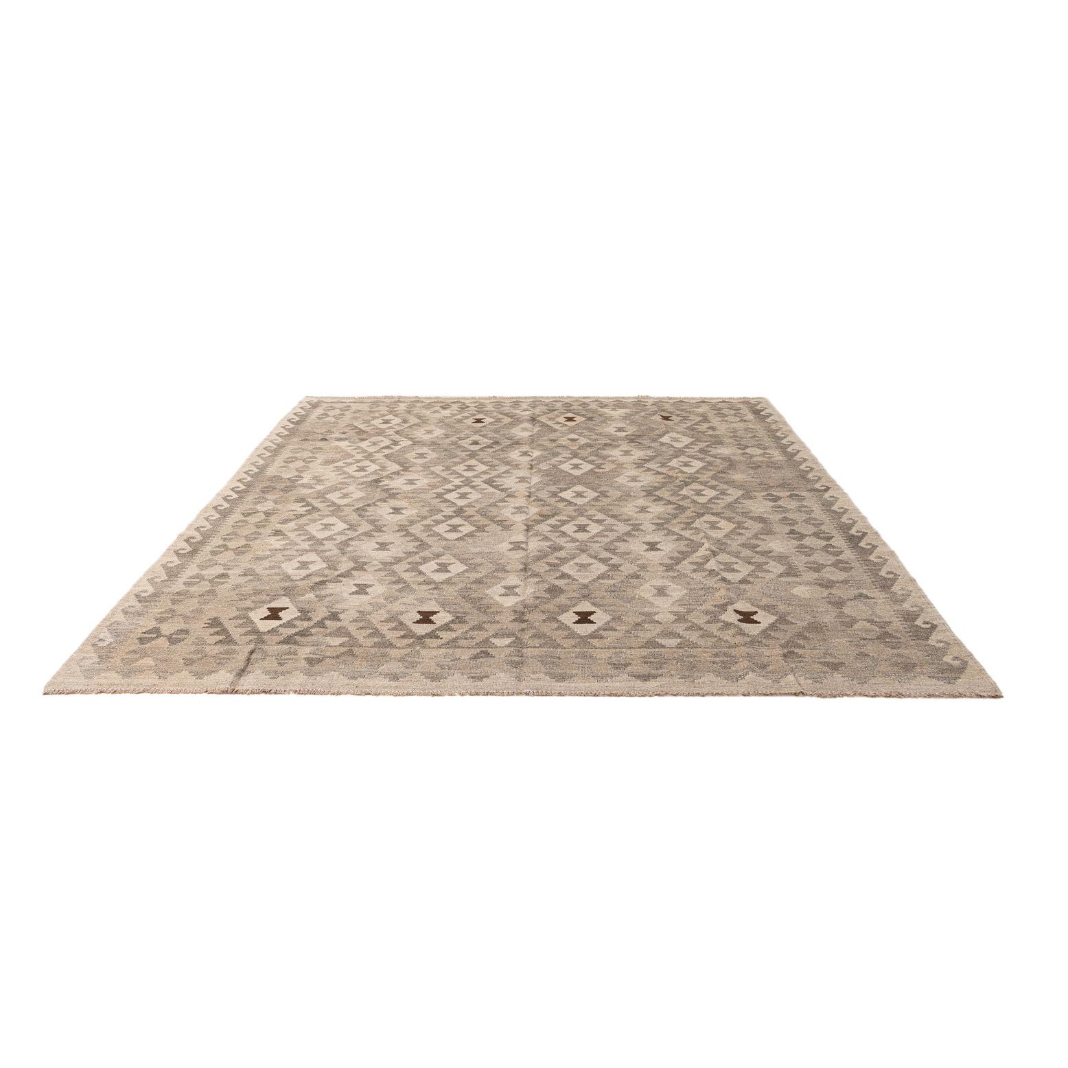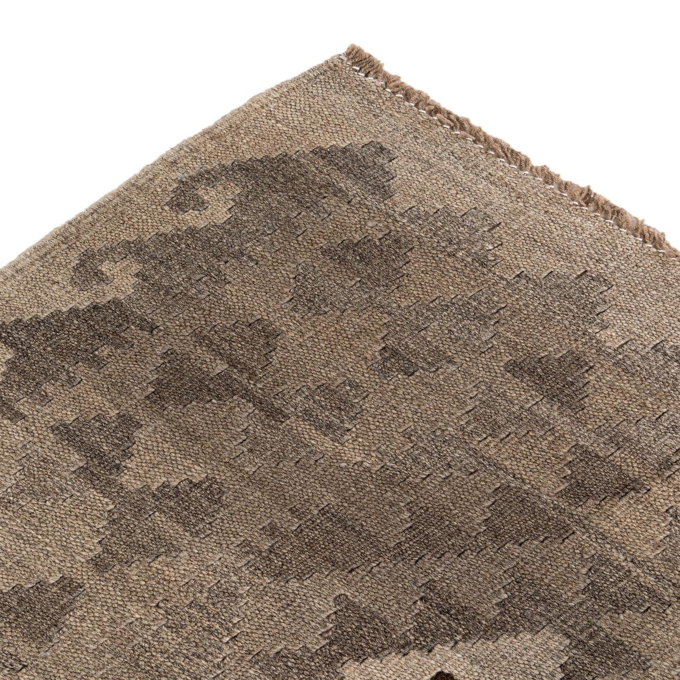 A 5x8 rectangular Kilim Maymana rug in shades of gray and silver, featuring a tribal geometric diamond pattern and a flatweave texture.