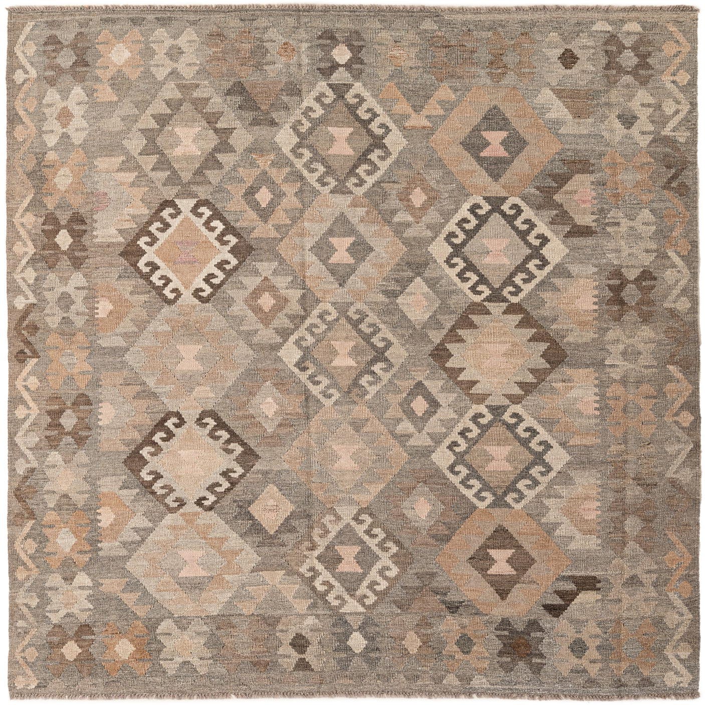 A 5x8 rectangular Kilim Maymana rug featuring a tribal geometric pattern in various shades of gray, silver, and beige.