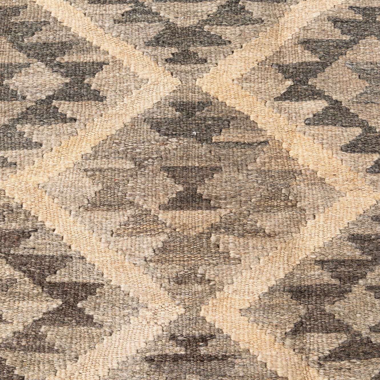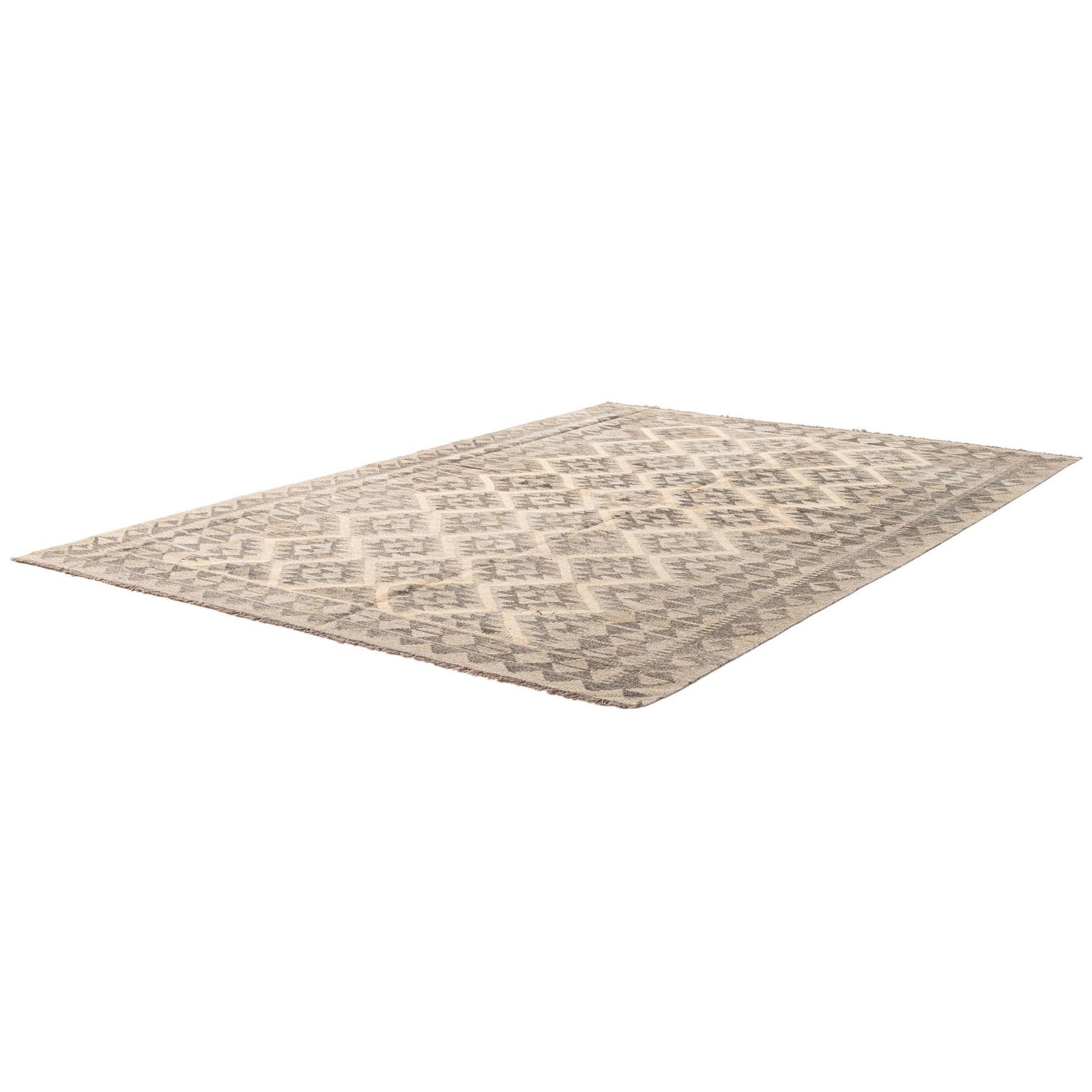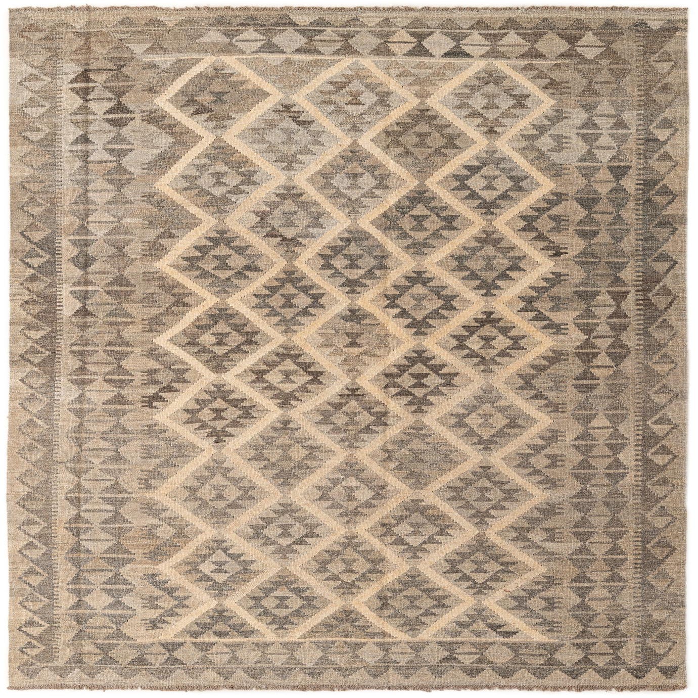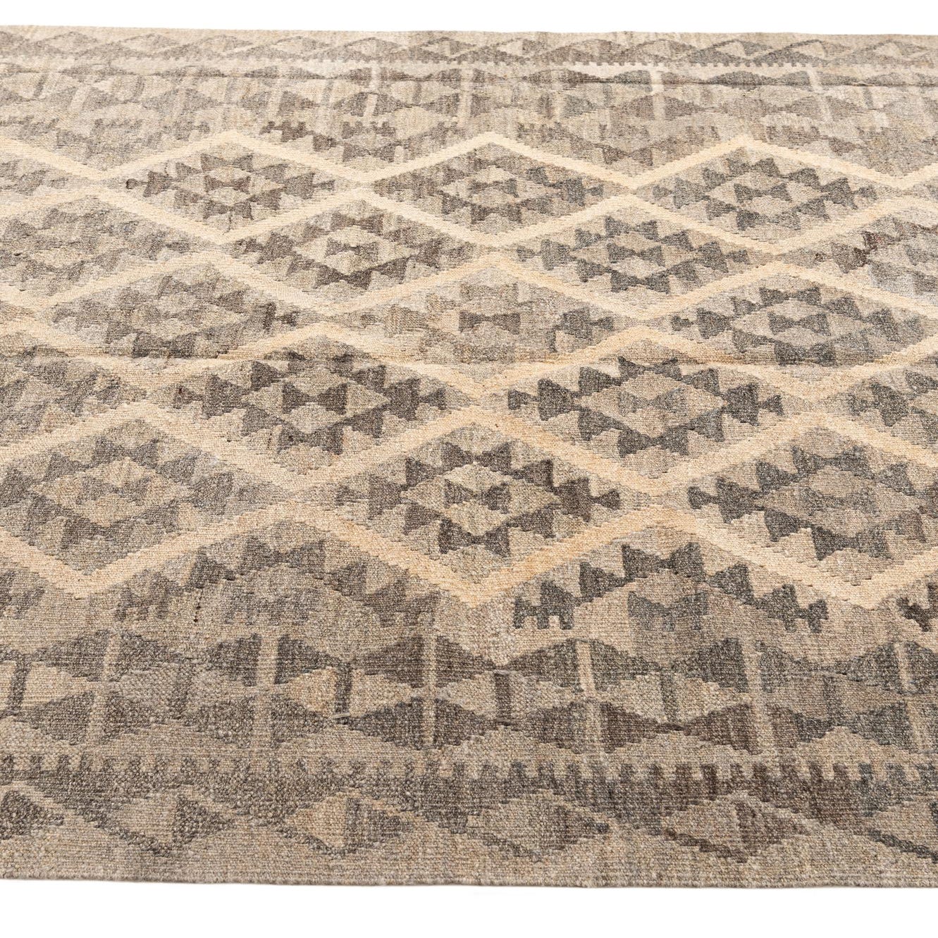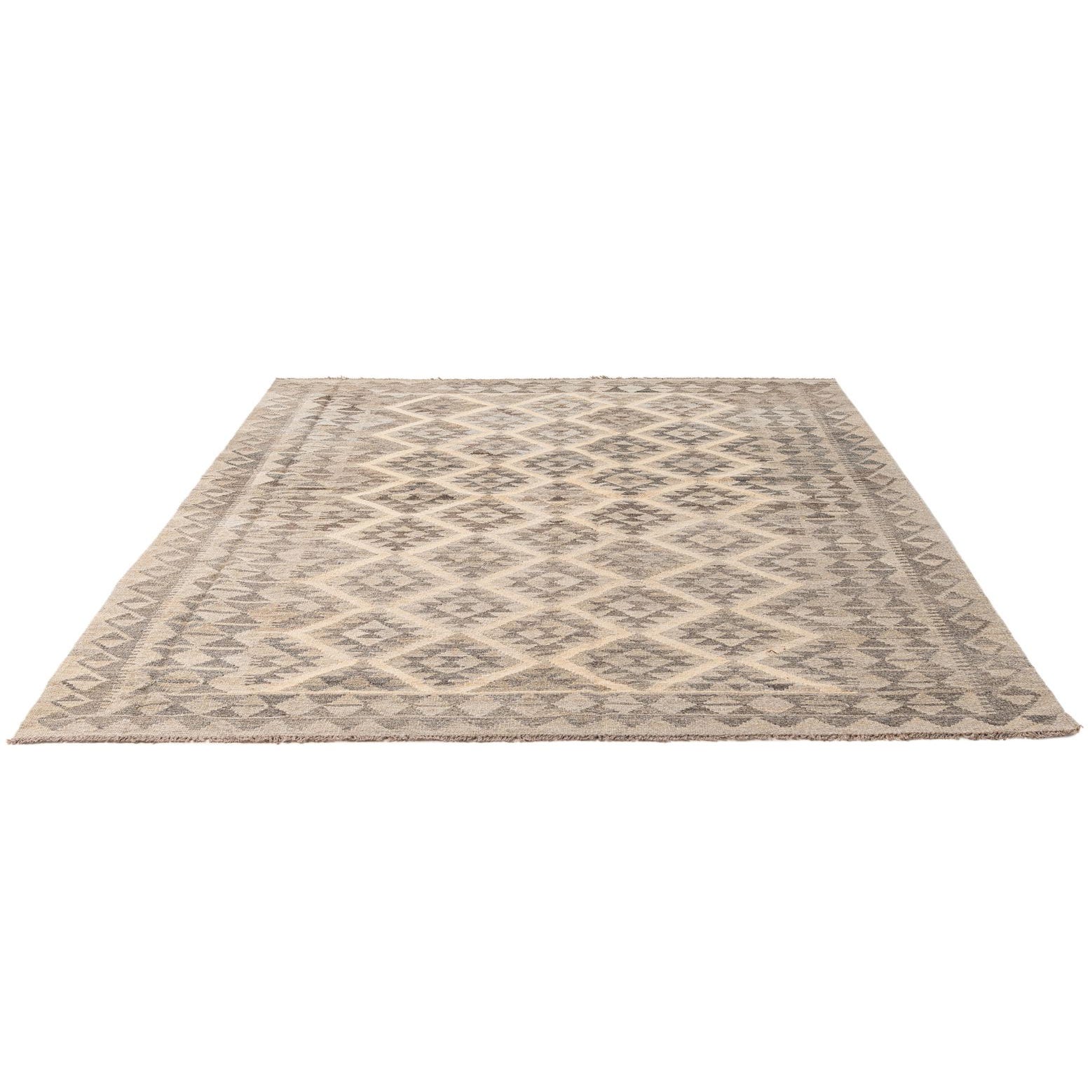 A 5x8 rectangular Kilim Maymana rug featuring a tribal geometric diamond pattern in varying shades of gray and silver.