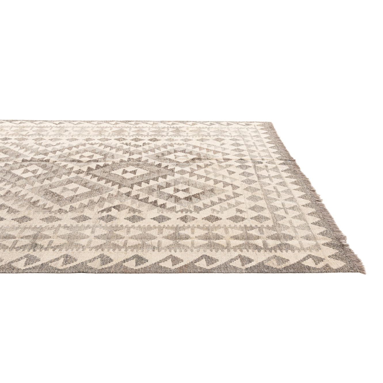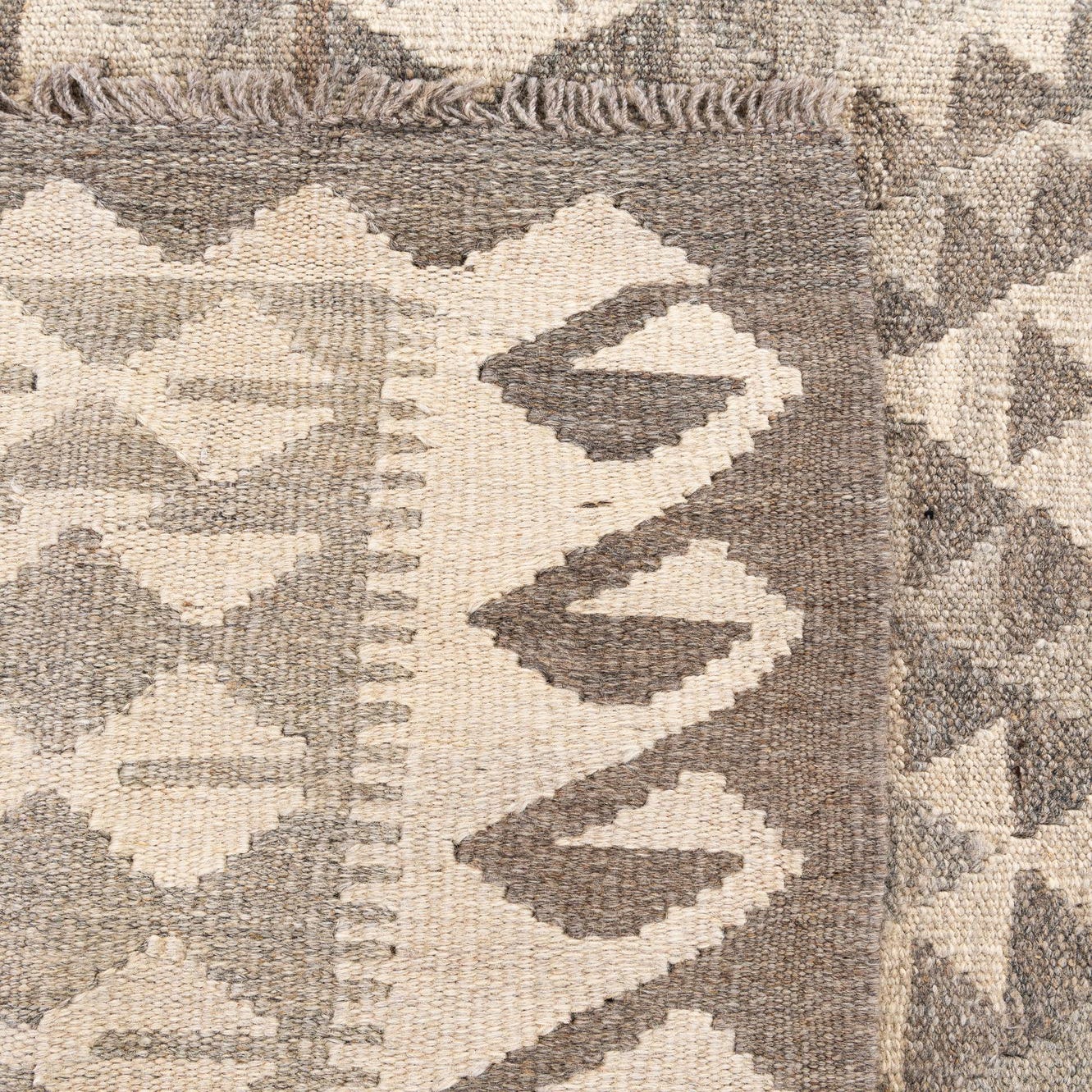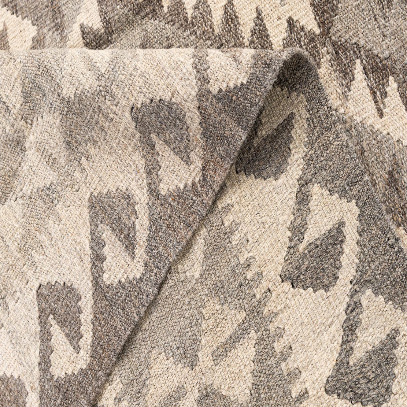 A 5x8 rectangular Kilim Maymana rug featuring a tribal geometric pattern in various shades of gray and silver.