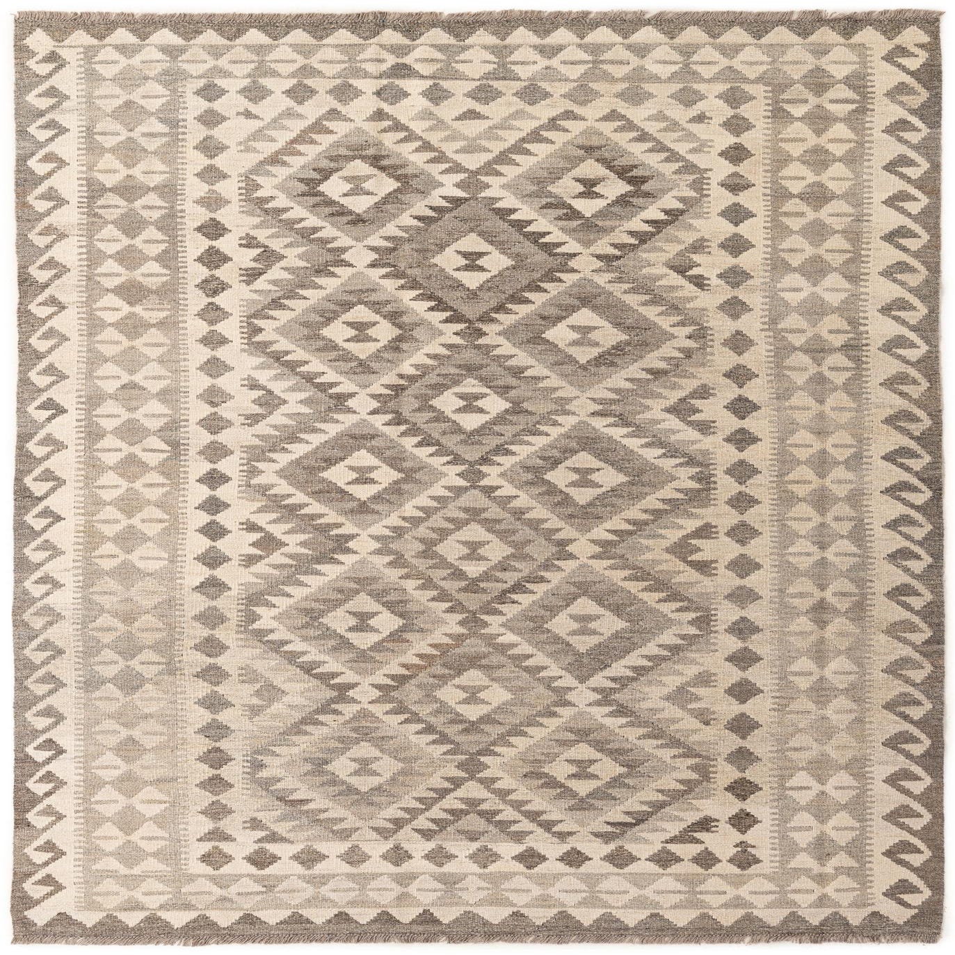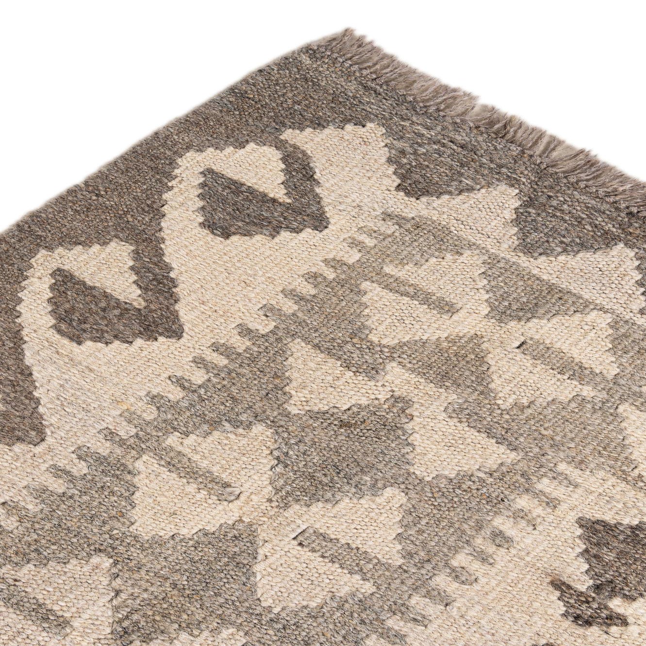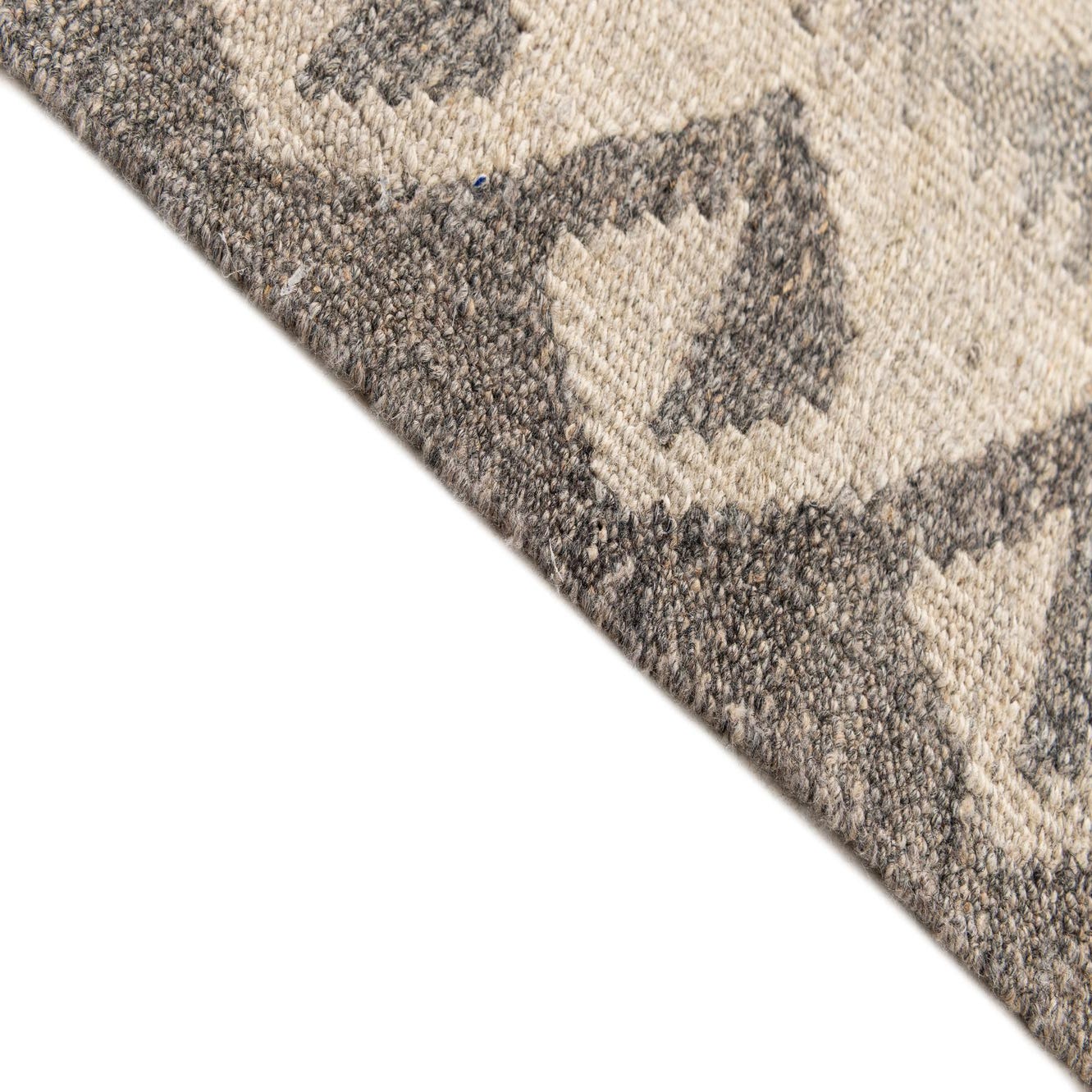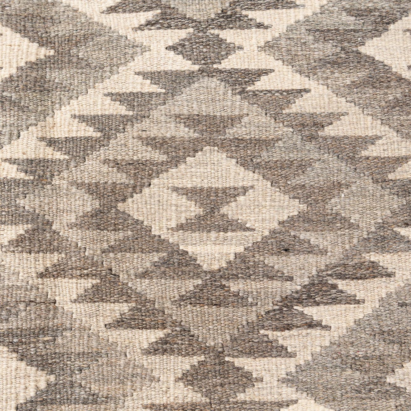 A 5x8 rectangular Kilim Maymana rug featuring a tribal geometric pattern in various shades of gray and silver.