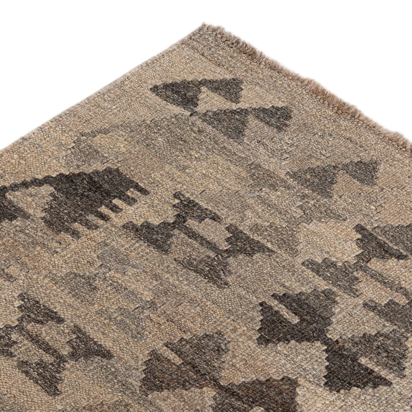 A 5x8 rectangular Kilim Maymana rug featuring tribal geometric patterns in shades of gray and silver, made from flatweave wool.