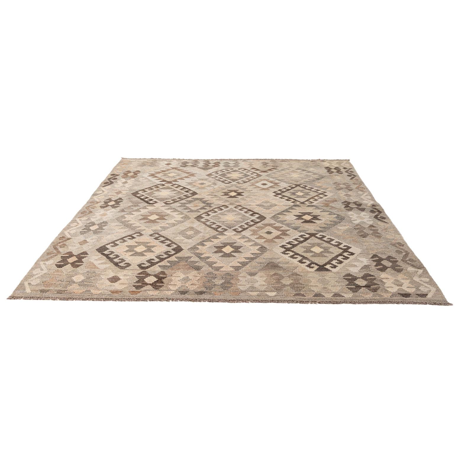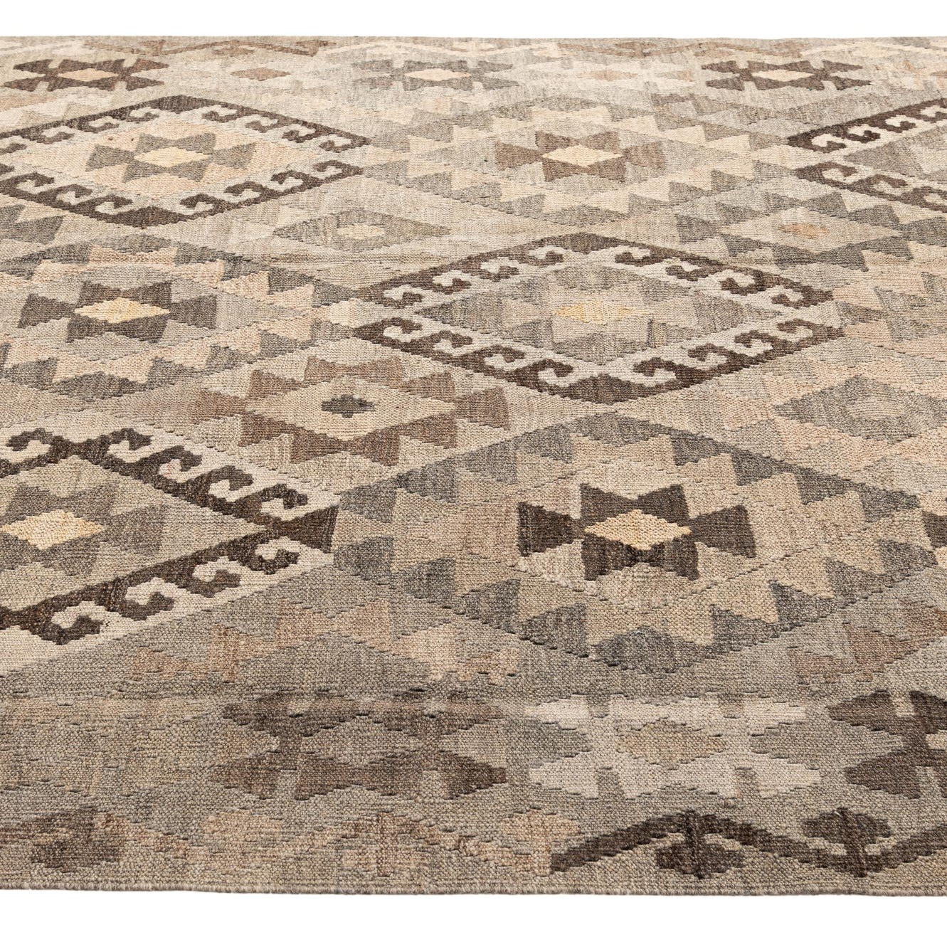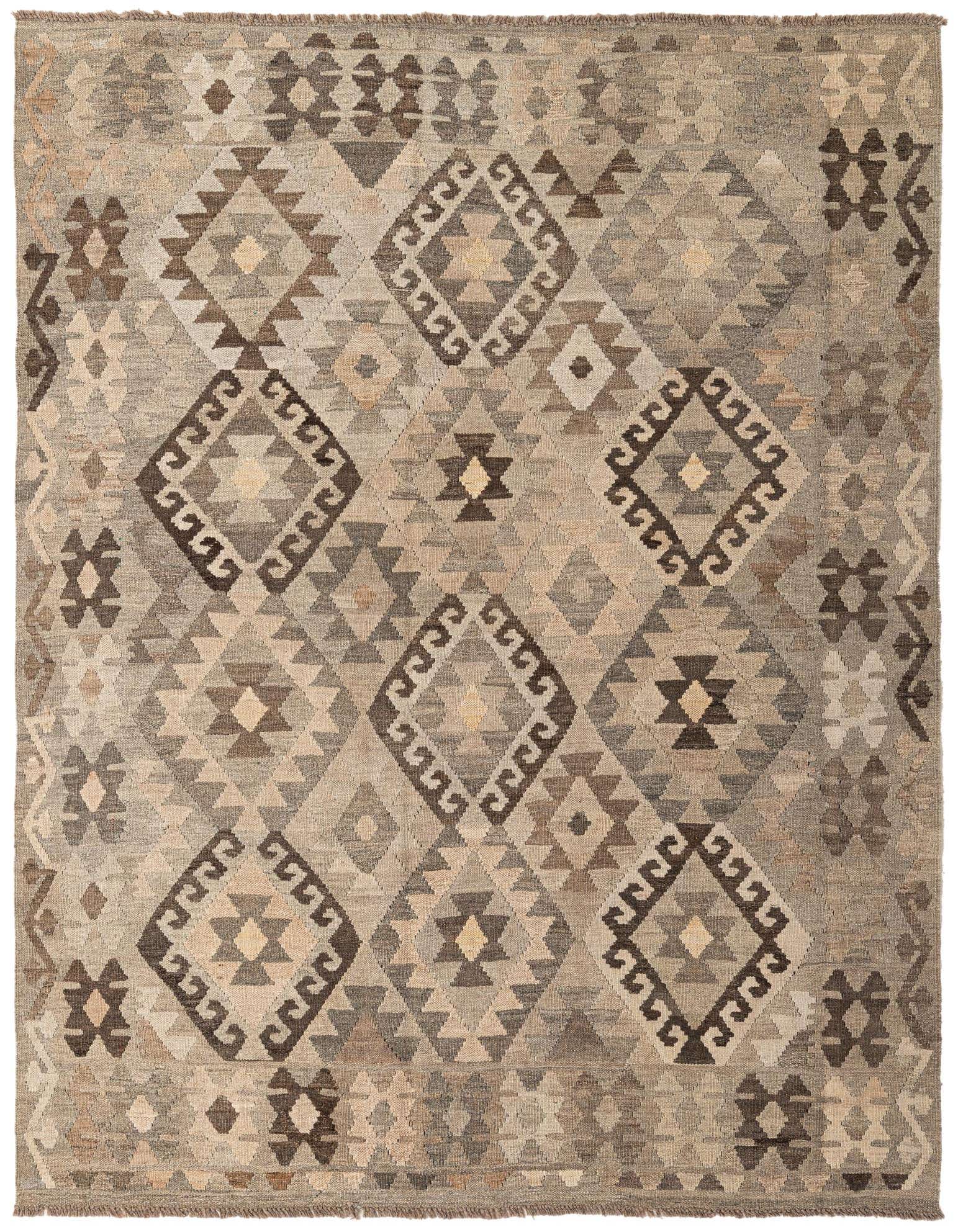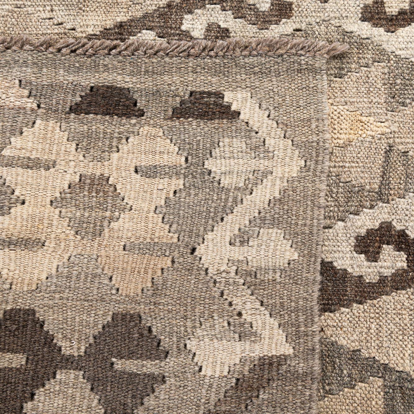 A 5x8 rectangular Kilim Maymana rug with a tribal geometric pattern in shades of gray, silver, and brown.