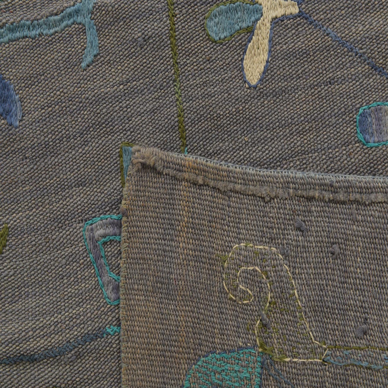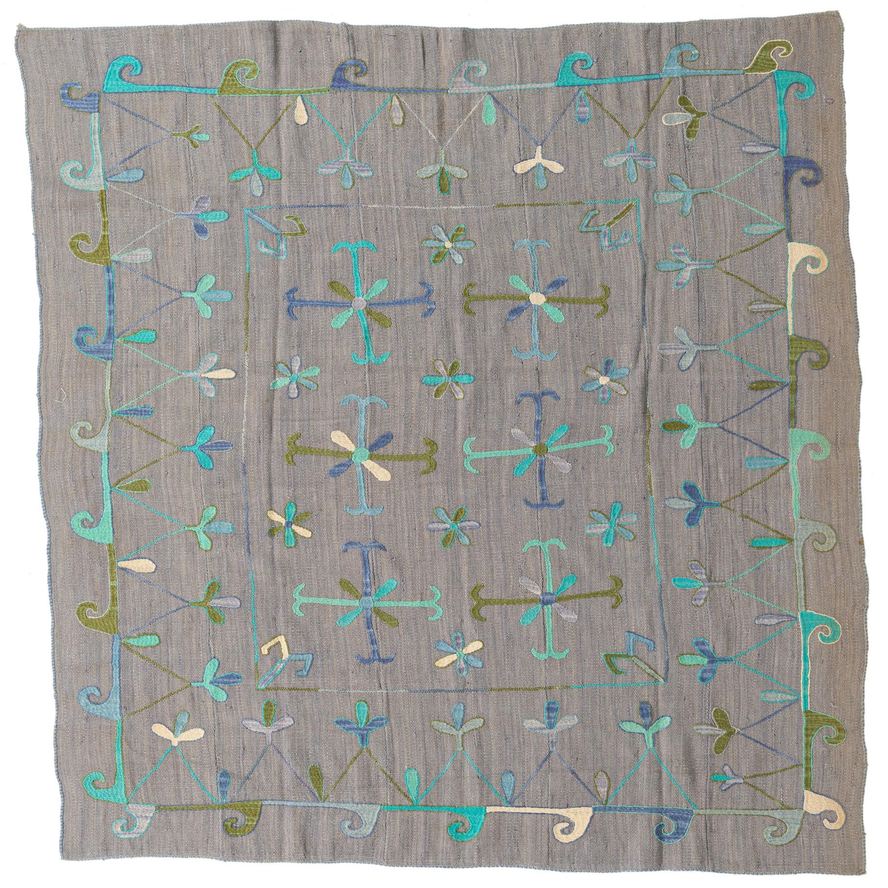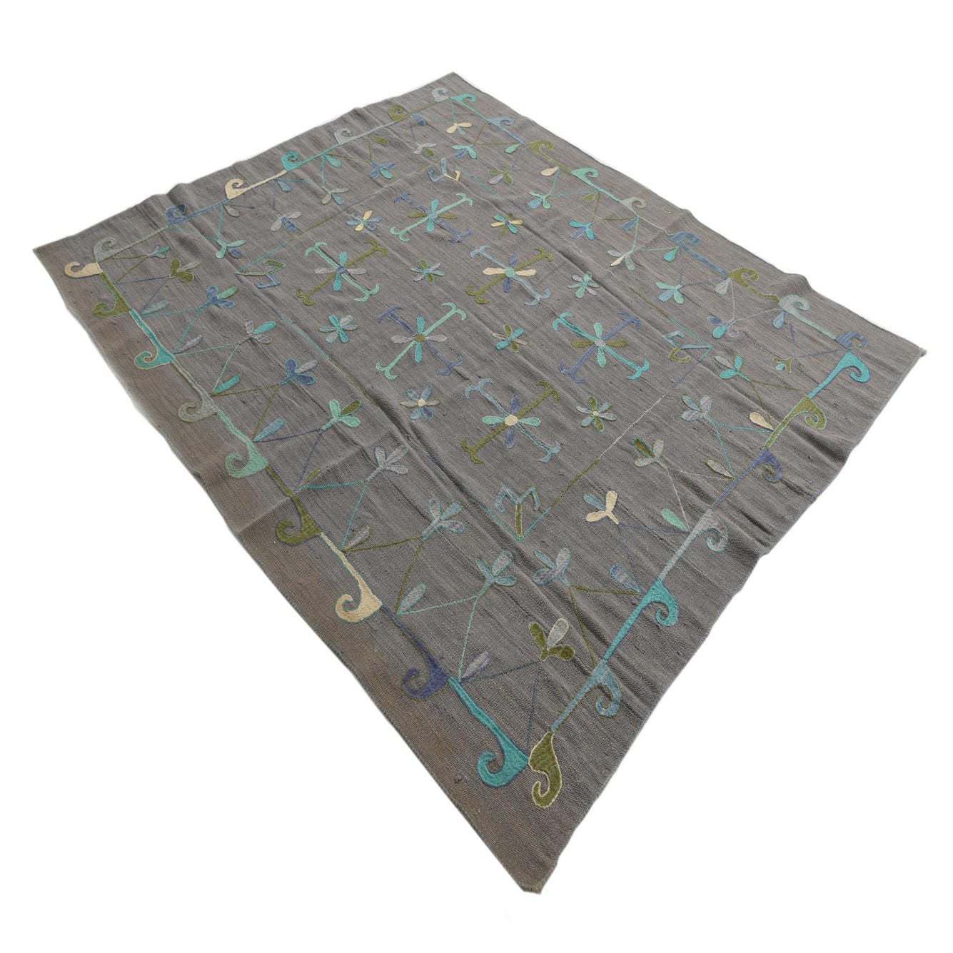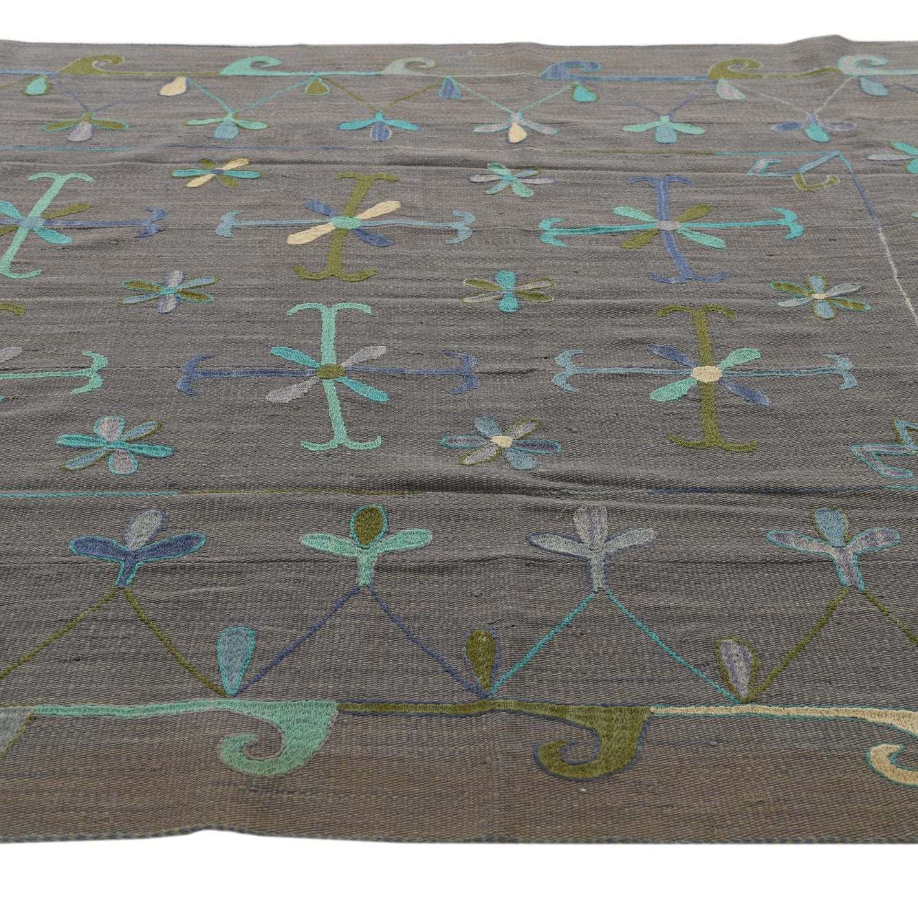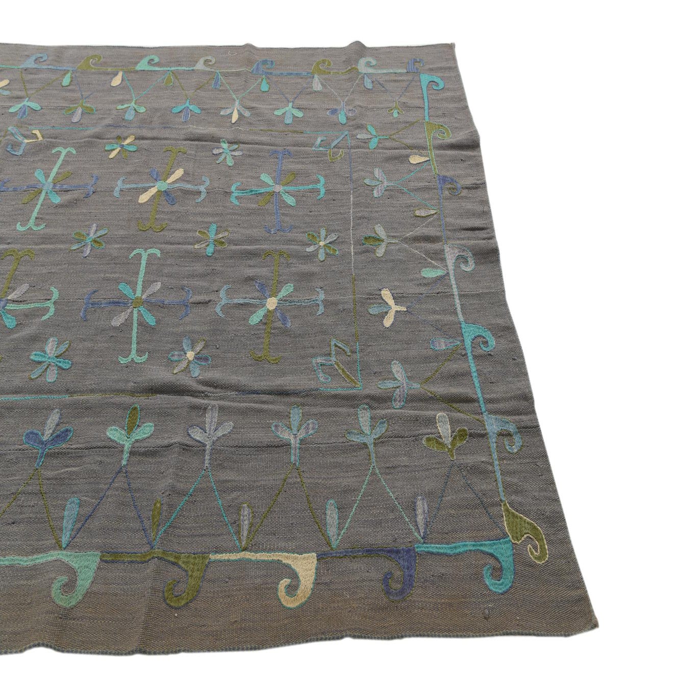 The Kilim Suzani collection presents a 5x8 rug hand woven from 100% wool, characterized by its durable and fine construction. This particular rug boasts a gray background, overlaid with a vibrant, folk-inspired pattern that includes turquoise, ivory, olive, and blue hues. The design features a lattice of geometric shapes and stylized floral elements, creating a playful yet structured appearance that adds a sense of movement and cultural flair.