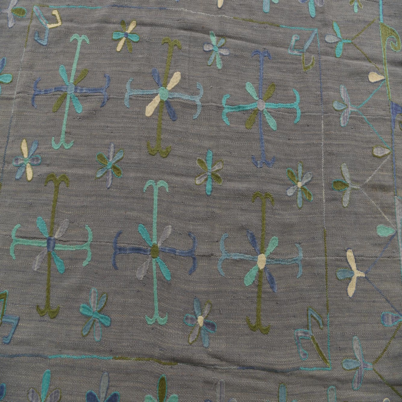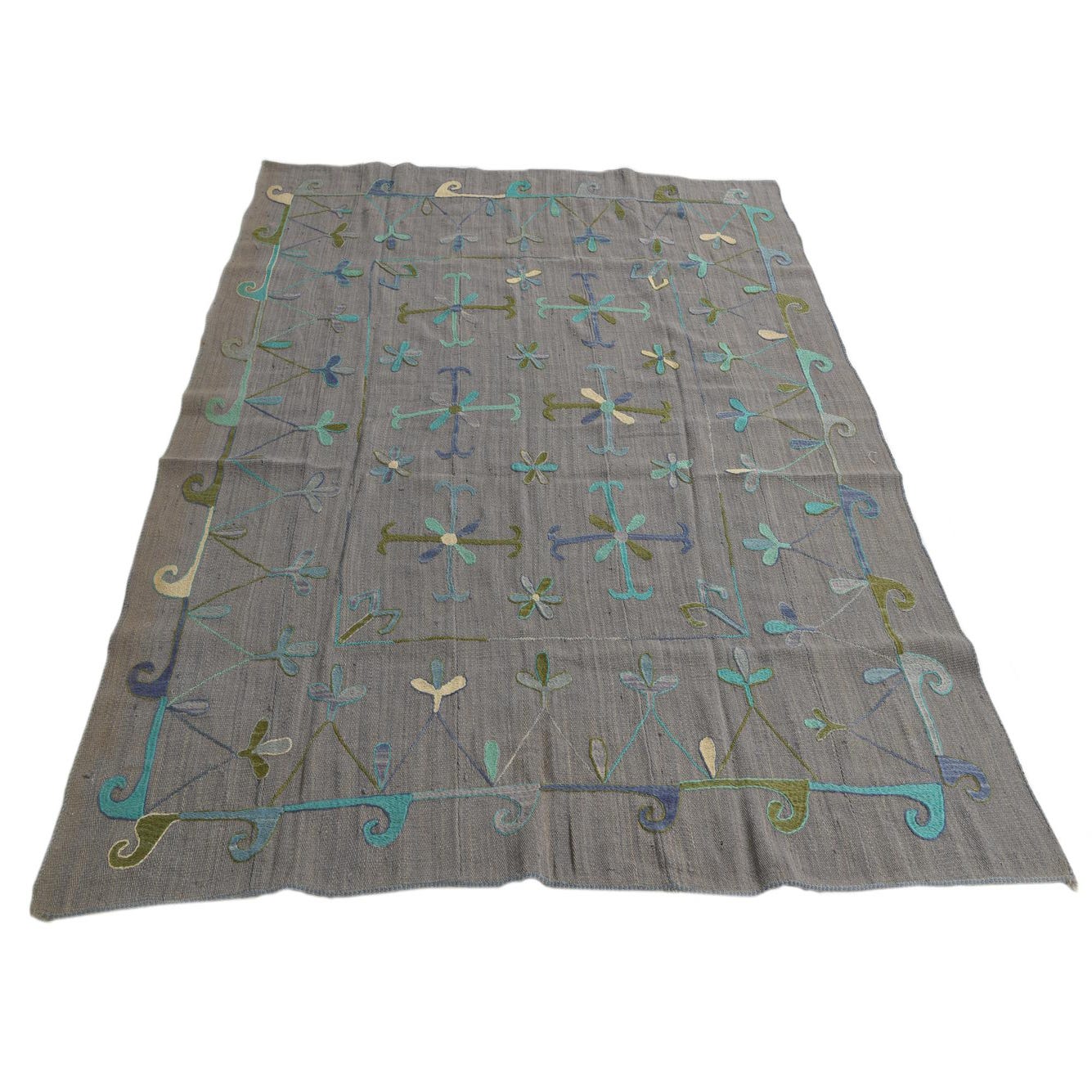 A 5x8 rectangular gray flatweave wool rug with a colorful tribal Suzani pattern in blues, greens, and white.