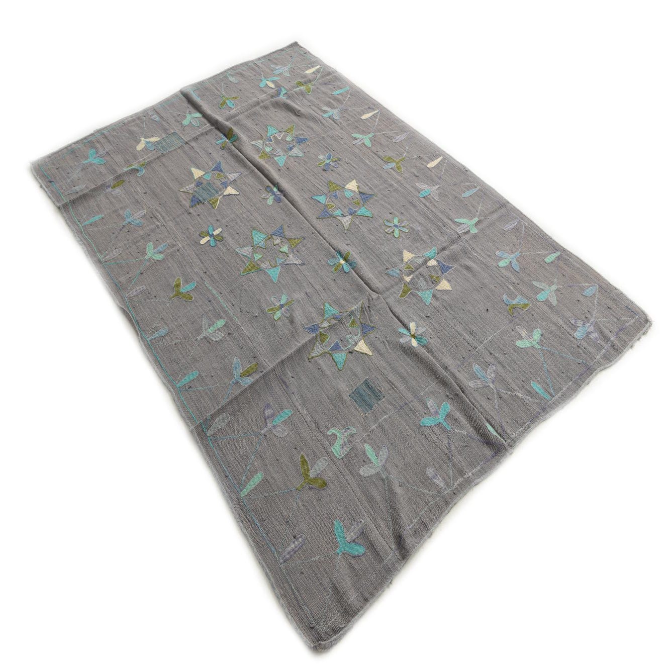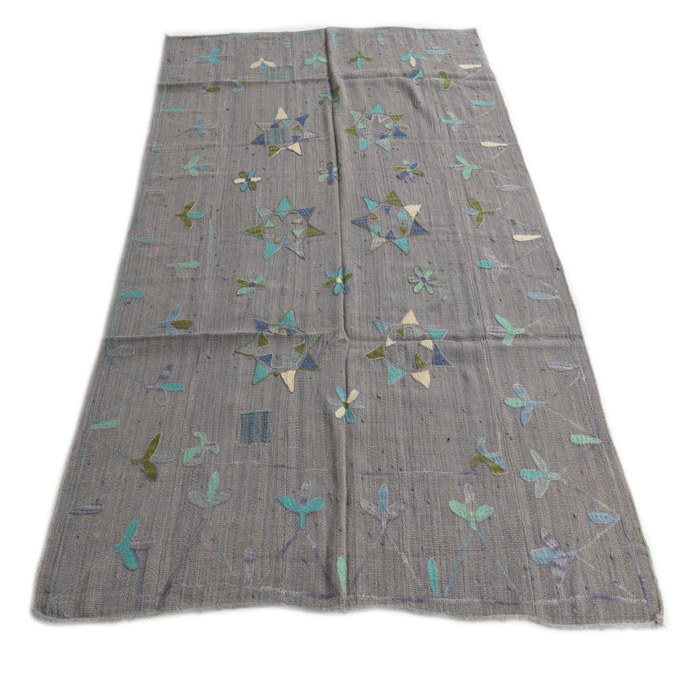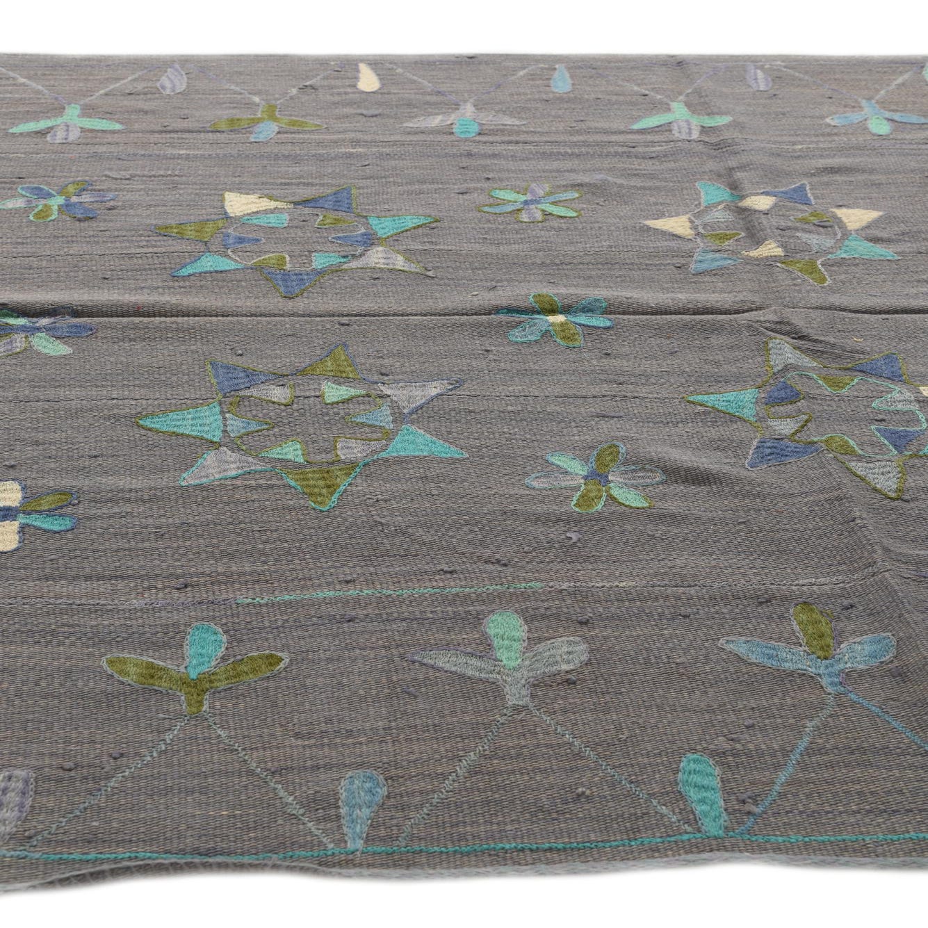 A 5x8 rectangular gray Kilim Suzani rug with a flatweave texture, featuring colorful tribal star and floral patterns in blues, greens, and white.