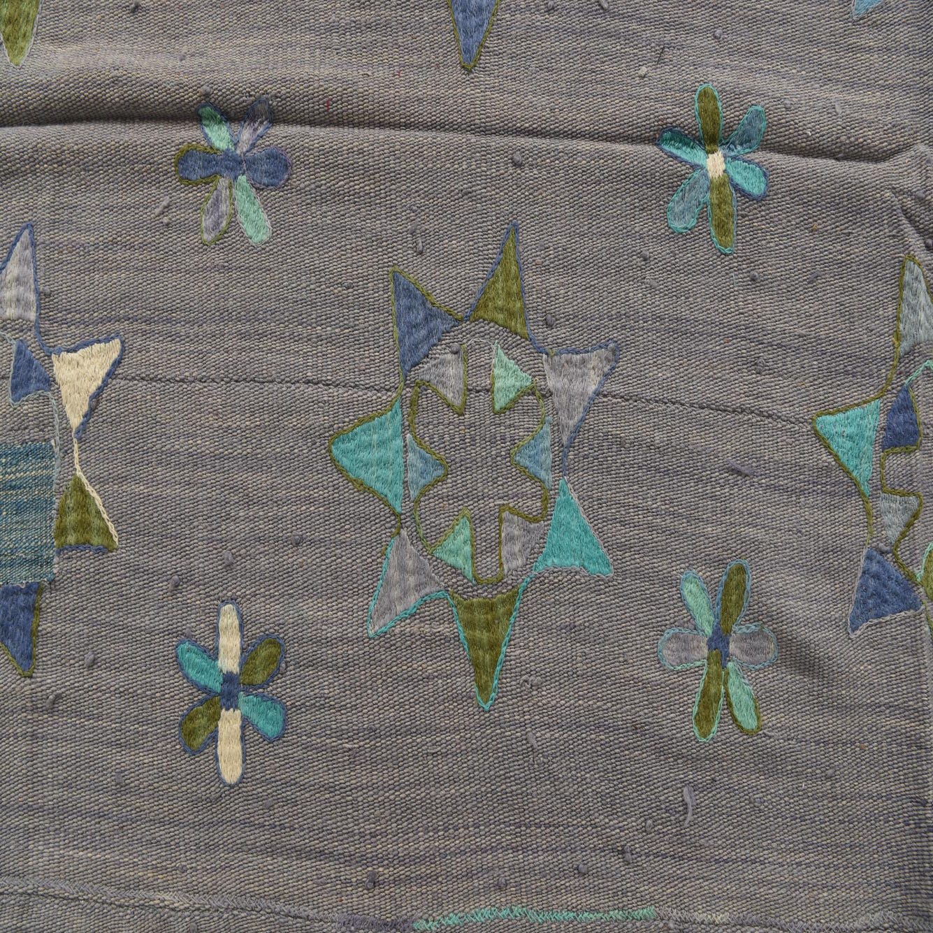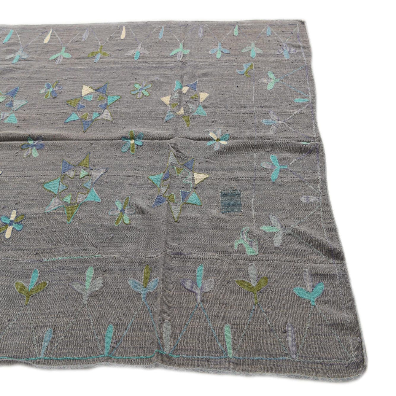 The Kilim Suzani collection presents a hand-woven 5x8 rug that artfully blends traditional craftsmanship with contemporary design. This rug features a versatile gray background that is complemented by a vibrant overlay of geometric and floral patterns. The color palette includes tones of blue, green, ivory, and teal, which come together to create a harmonious and visually engaging composition. The texture of 100% wool lends both durability and a soft, comfortable feel underfoot.