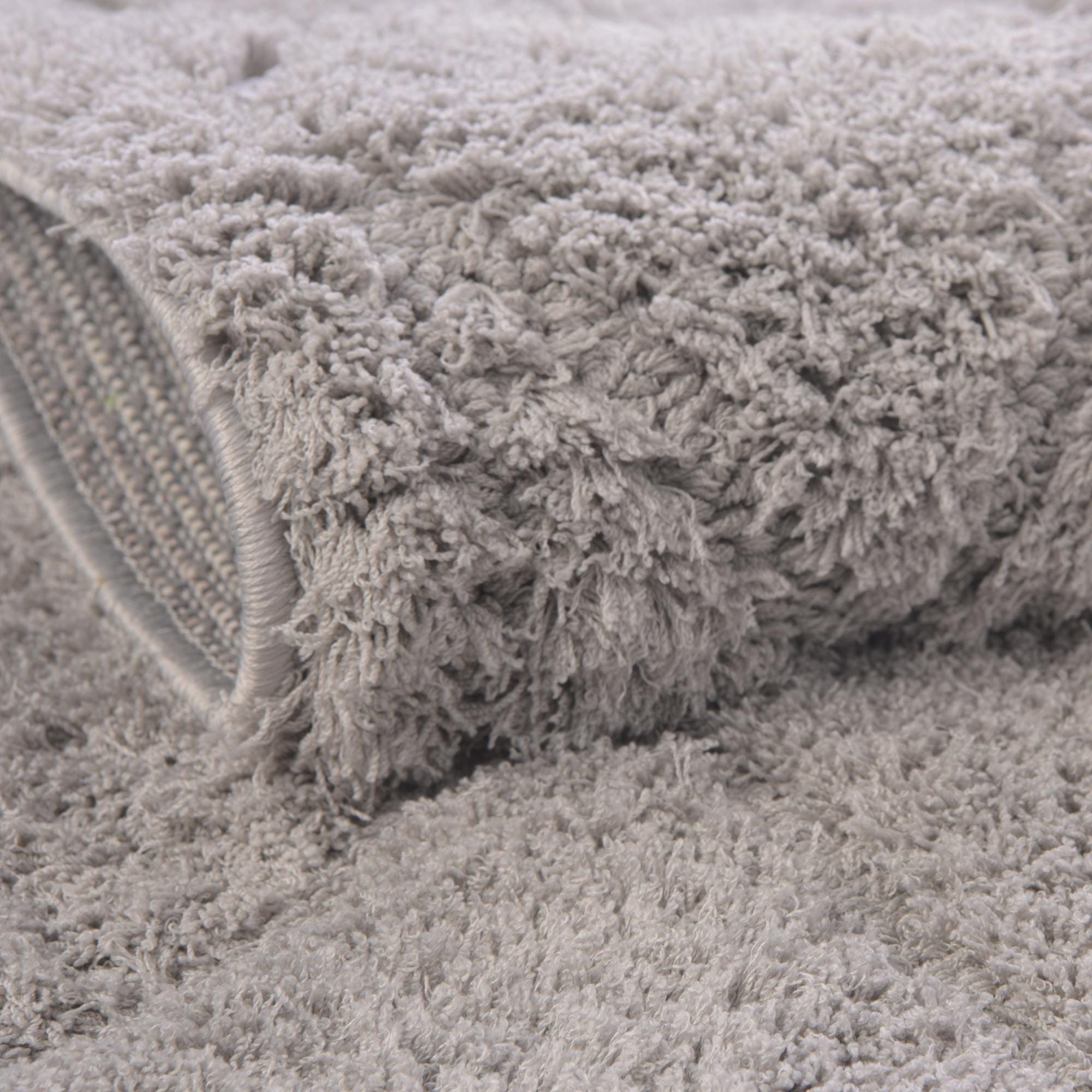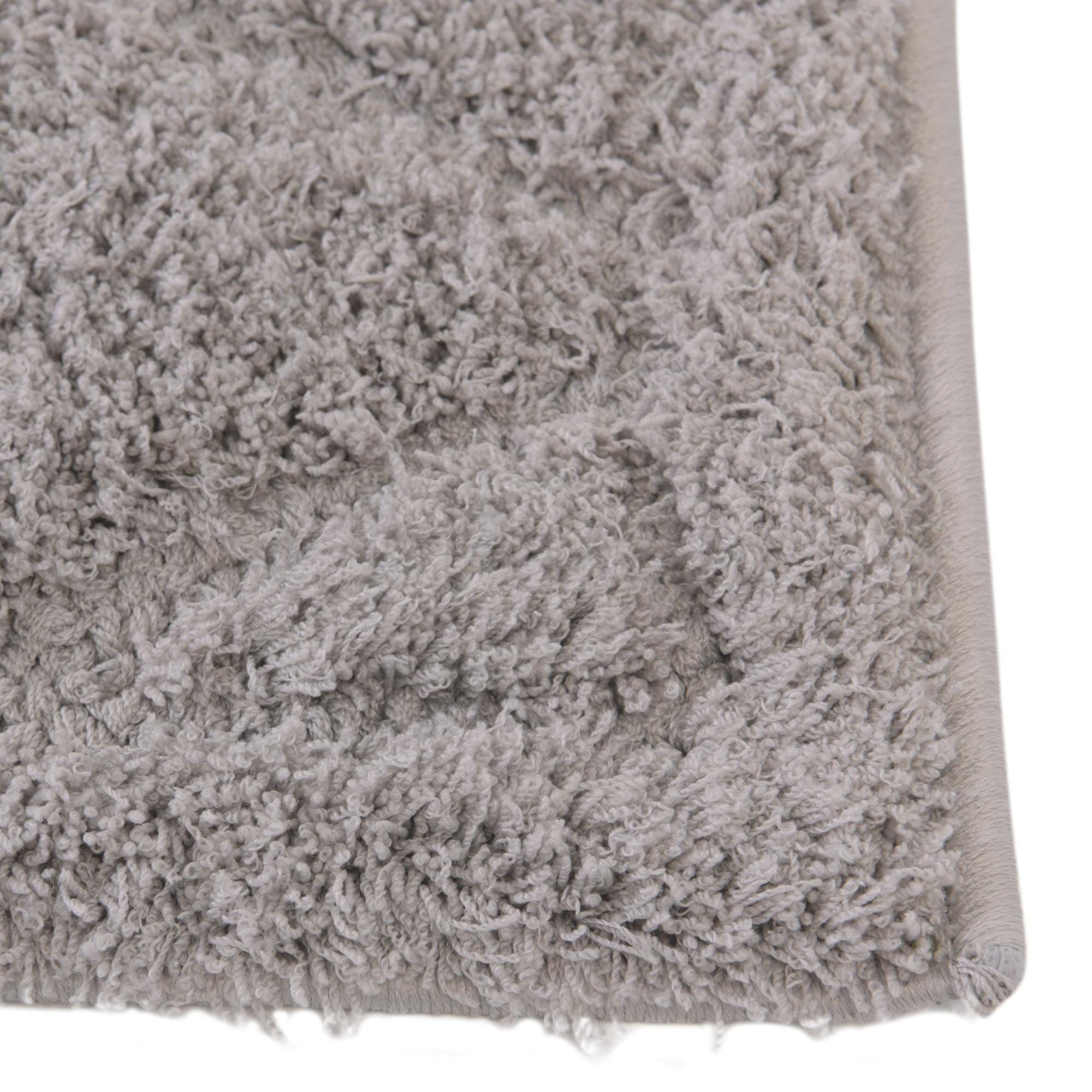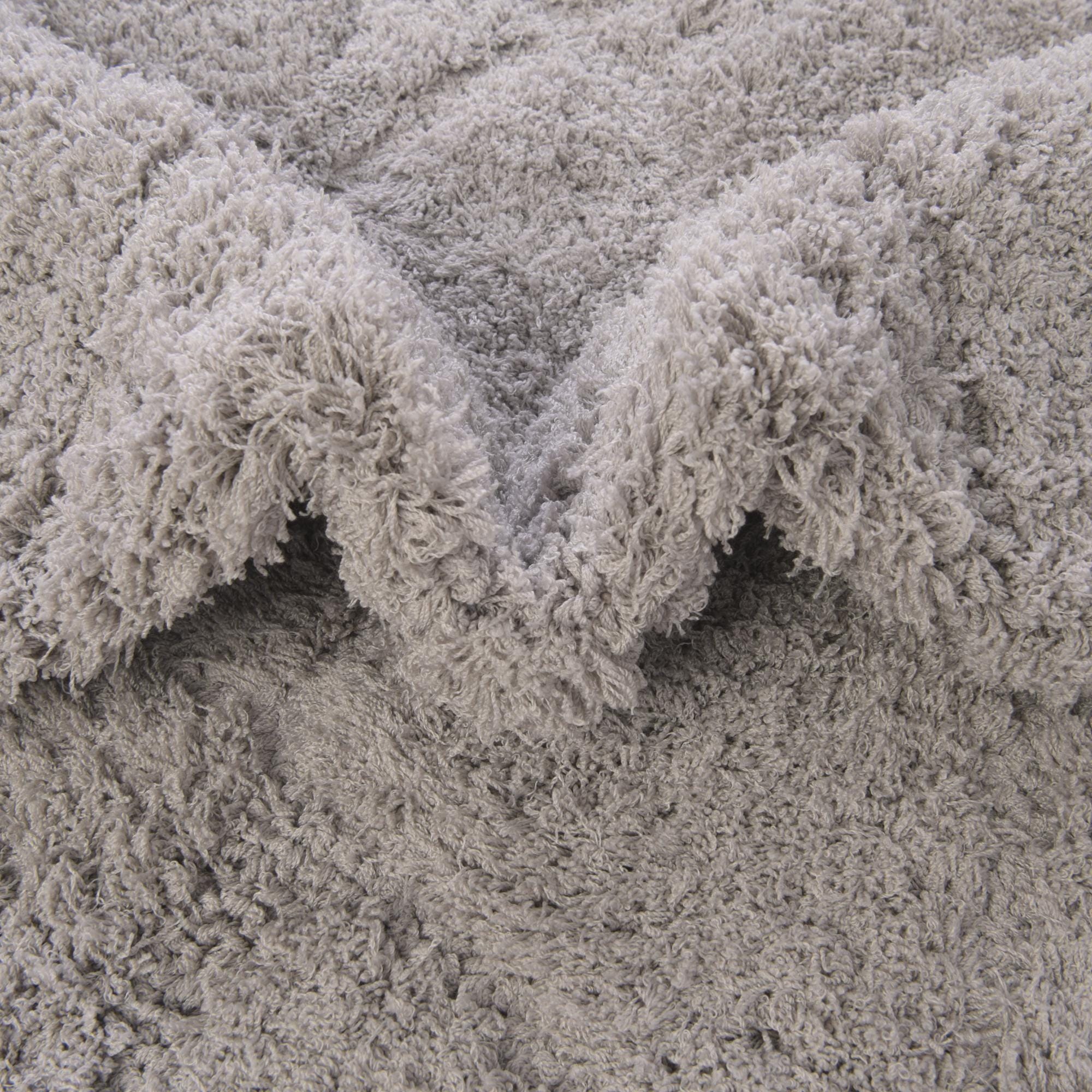 A soft, dense shag in a calm gray creates a low-contrast diamond lattice across the surface. The pattern is formed by subtle changes in pile height, so the diamonds sit slightly raised against the plush field and catch light for added depth without high contrast. Machine made from 100% polypropylene, the construction delivers a consistent, cushiony hand and a textured, tactile feel underfoot.