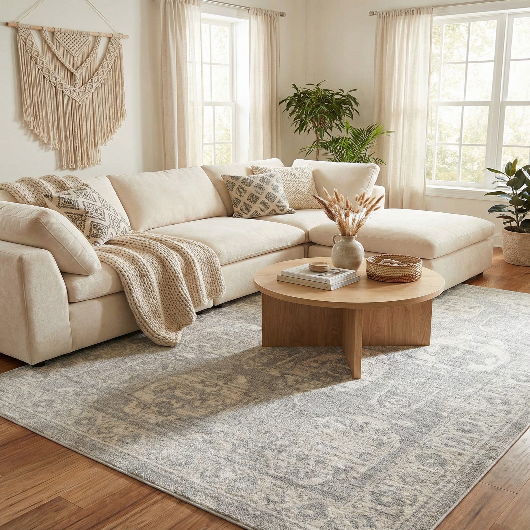This rug works well in a variety of settings: place it beneath a sofa and coffee table to ground a transitional living room, layer it under a bed in a serene, neutral bedroom, or center it in a dining area with lightwood chairs for a soft, modern farmhouse feel. Its quiet palette and understated pattern pair easily with mixed metals, textured linens, and minimalist furnishings to create a calm, cohesive space.