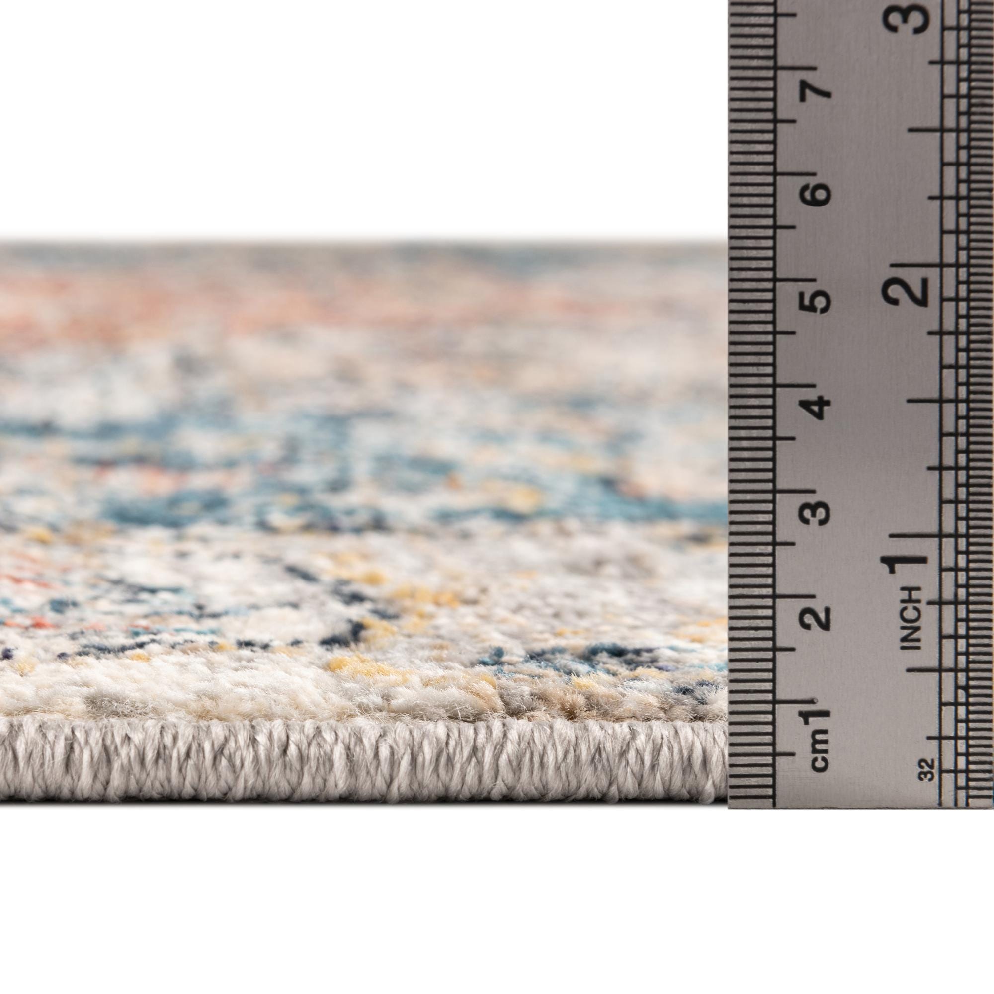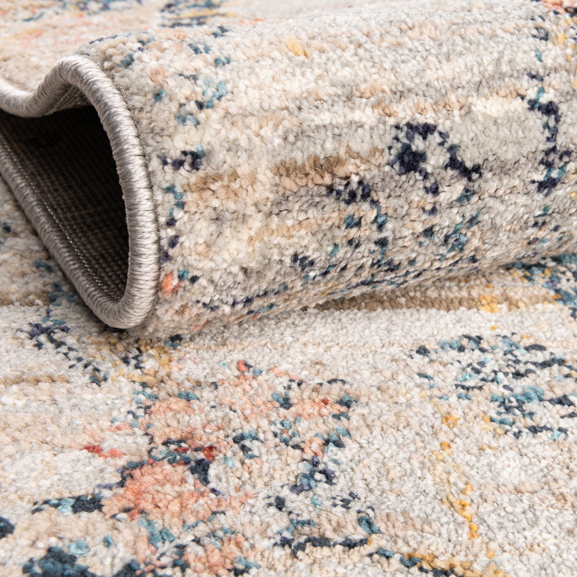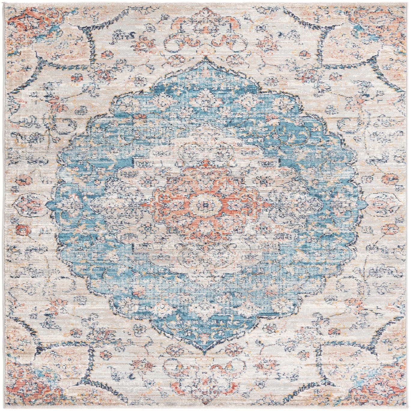 Primary color is Gray. Colors in this rug include: Gray, Blue, Navy Blue, Ivory, Light Blue, Salmon.
