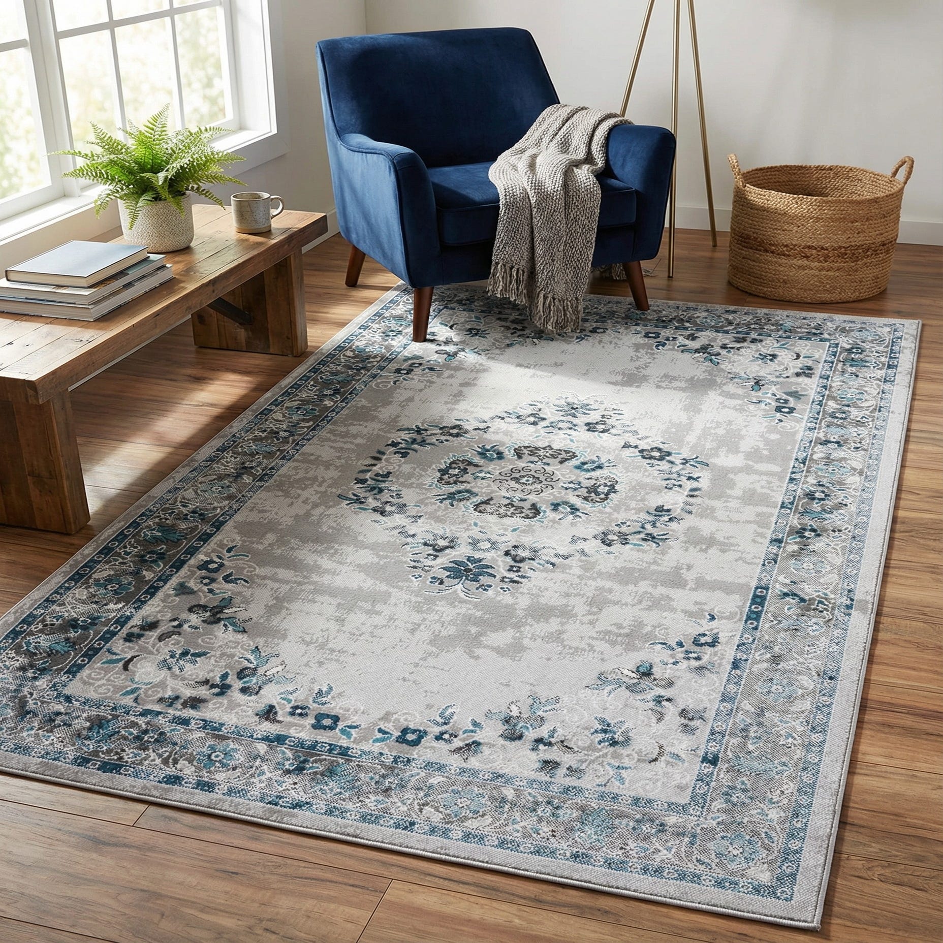 This piece works well as an anchor in a living room beneath a sofa and coffee table, or layered in a bedroom to frame the bed and bedside seating. The cool gray and blue palette pairs naturally with light woods and soft neutrals, and also complements coastal, transitional, or contemporary farmhouse interiors. Use ivory linens, textured throws, or brushed-metal accents to pick up the lighter tones and bring the blue highlights forward.