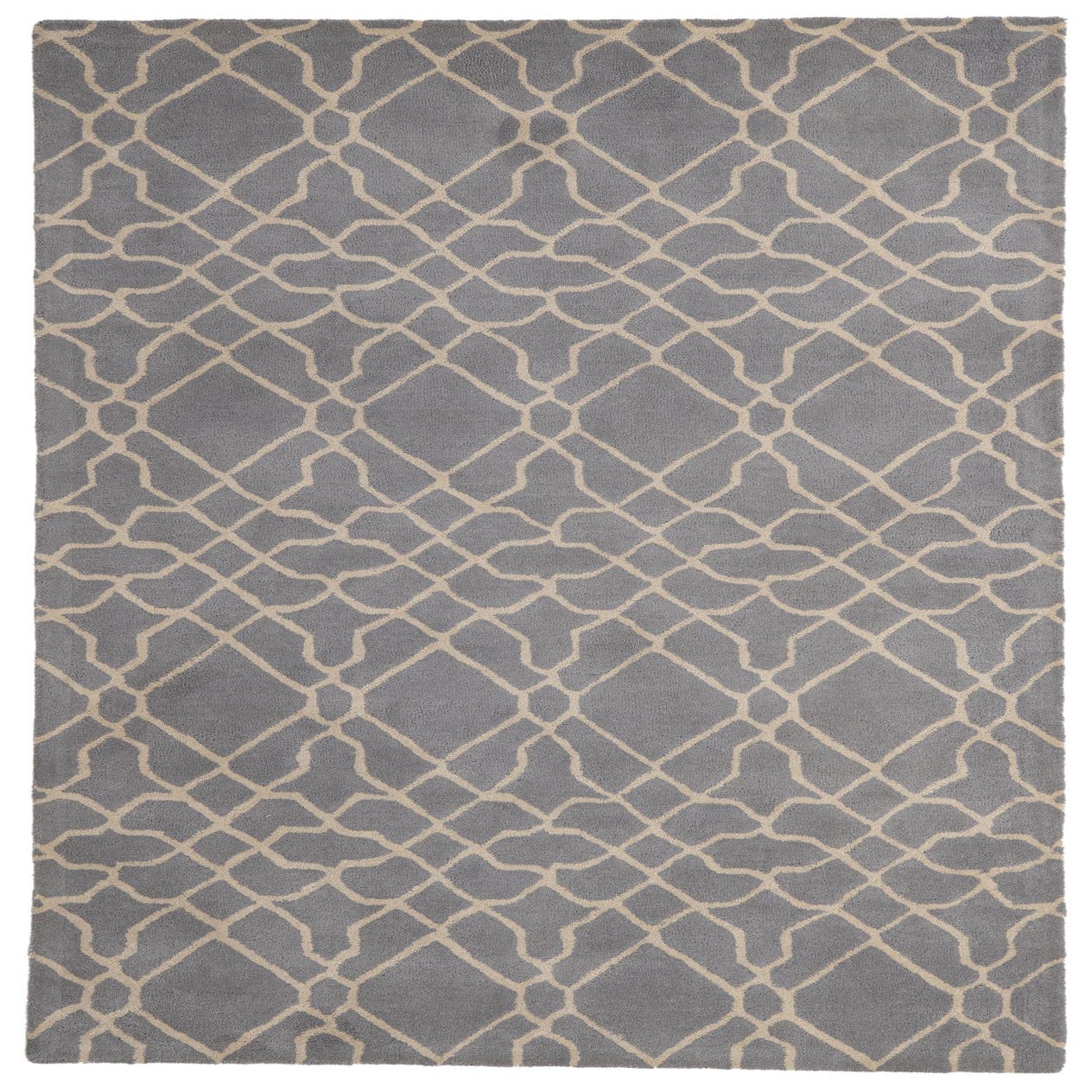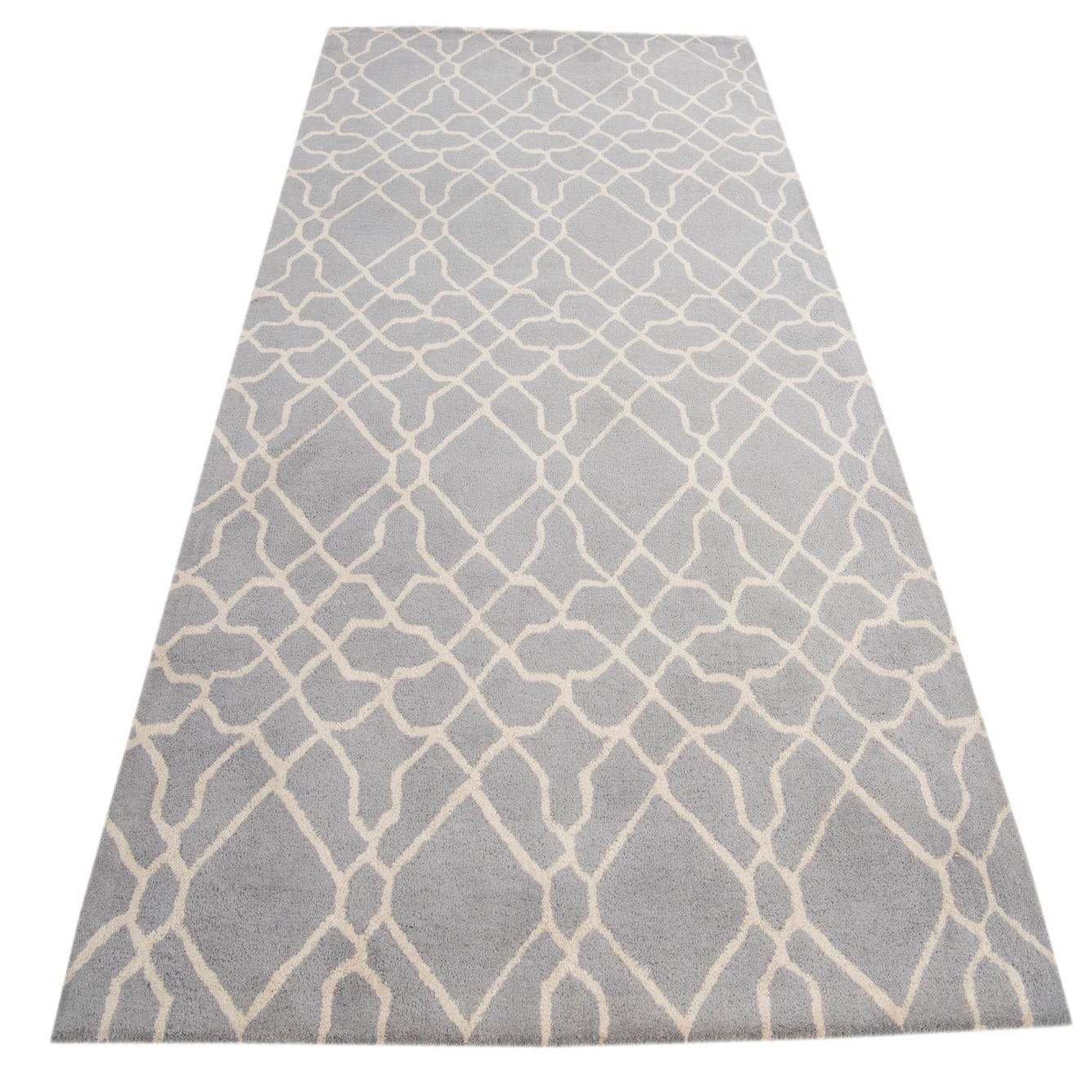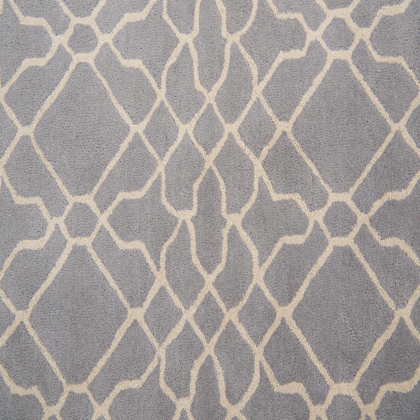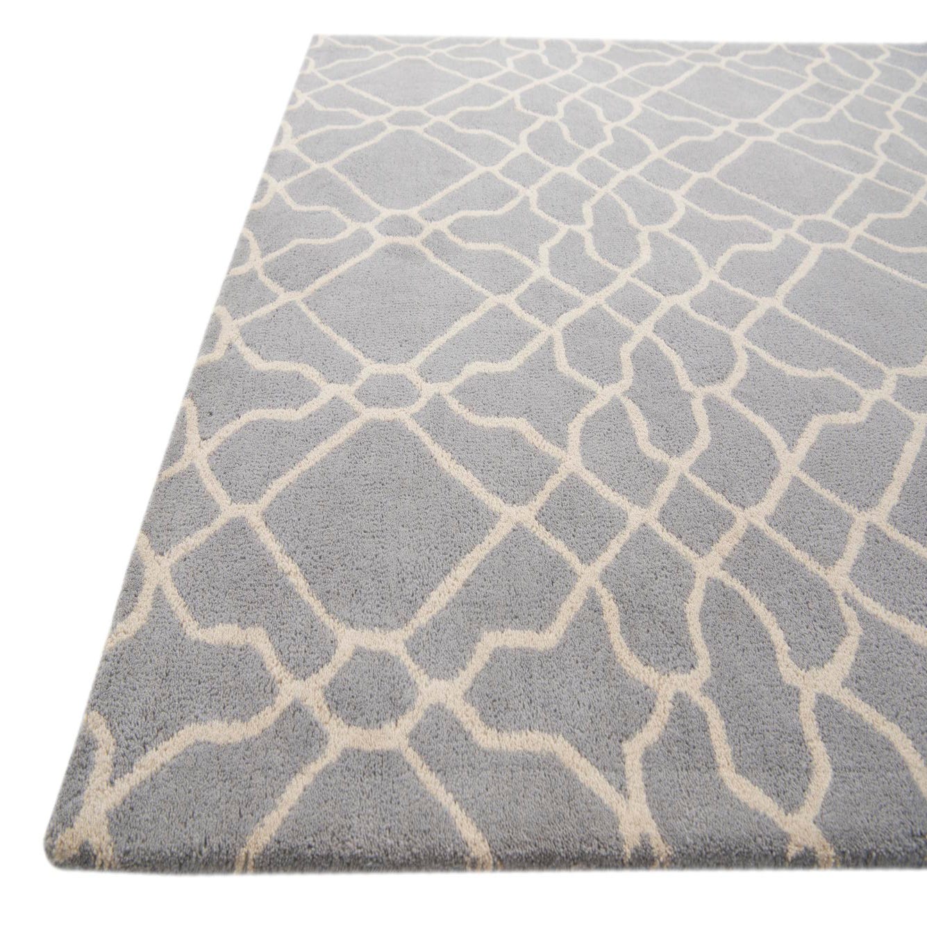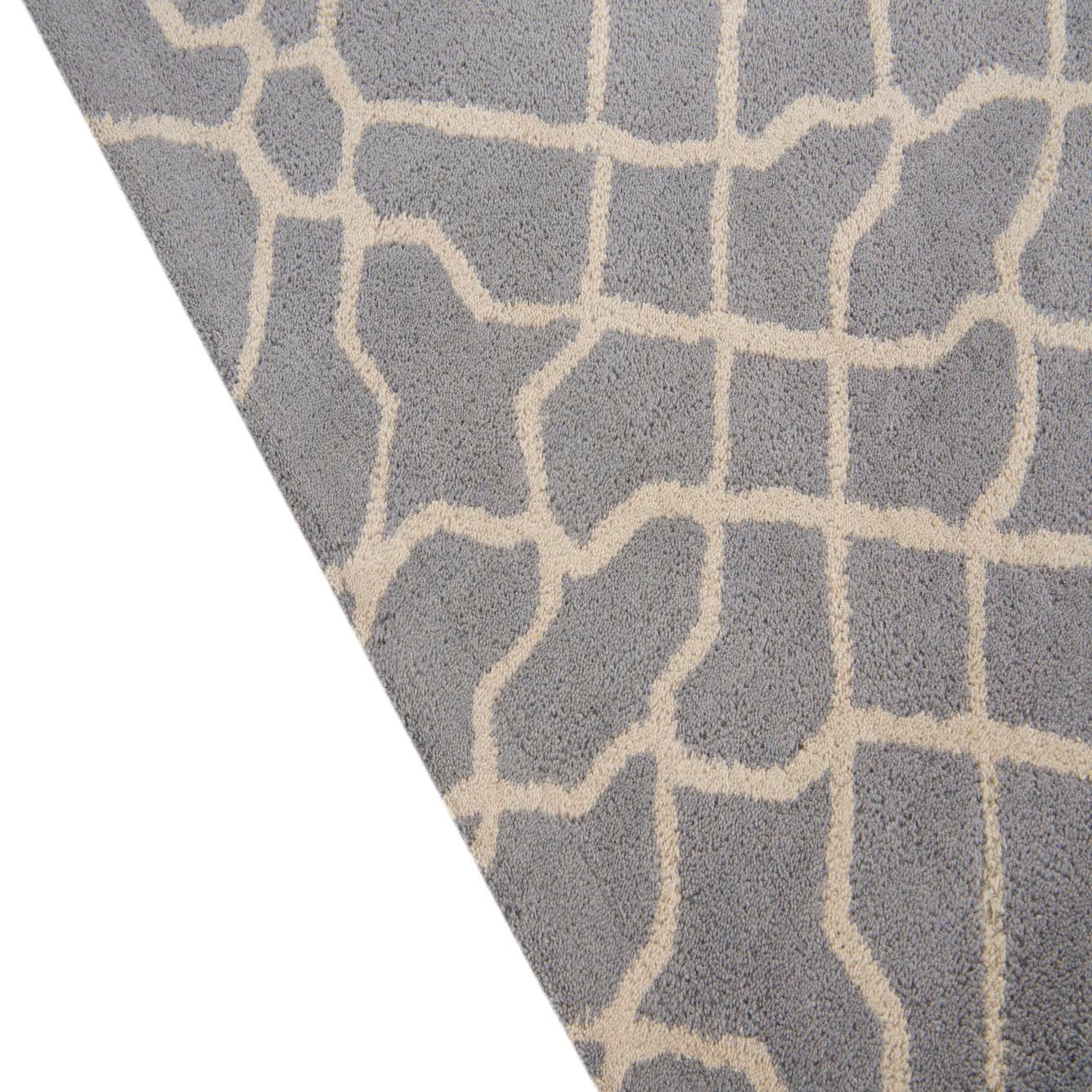 A 5x8 rectangular gray area rug featuring a modern, abstract trellis pattern in light beige, suitable for a living room.