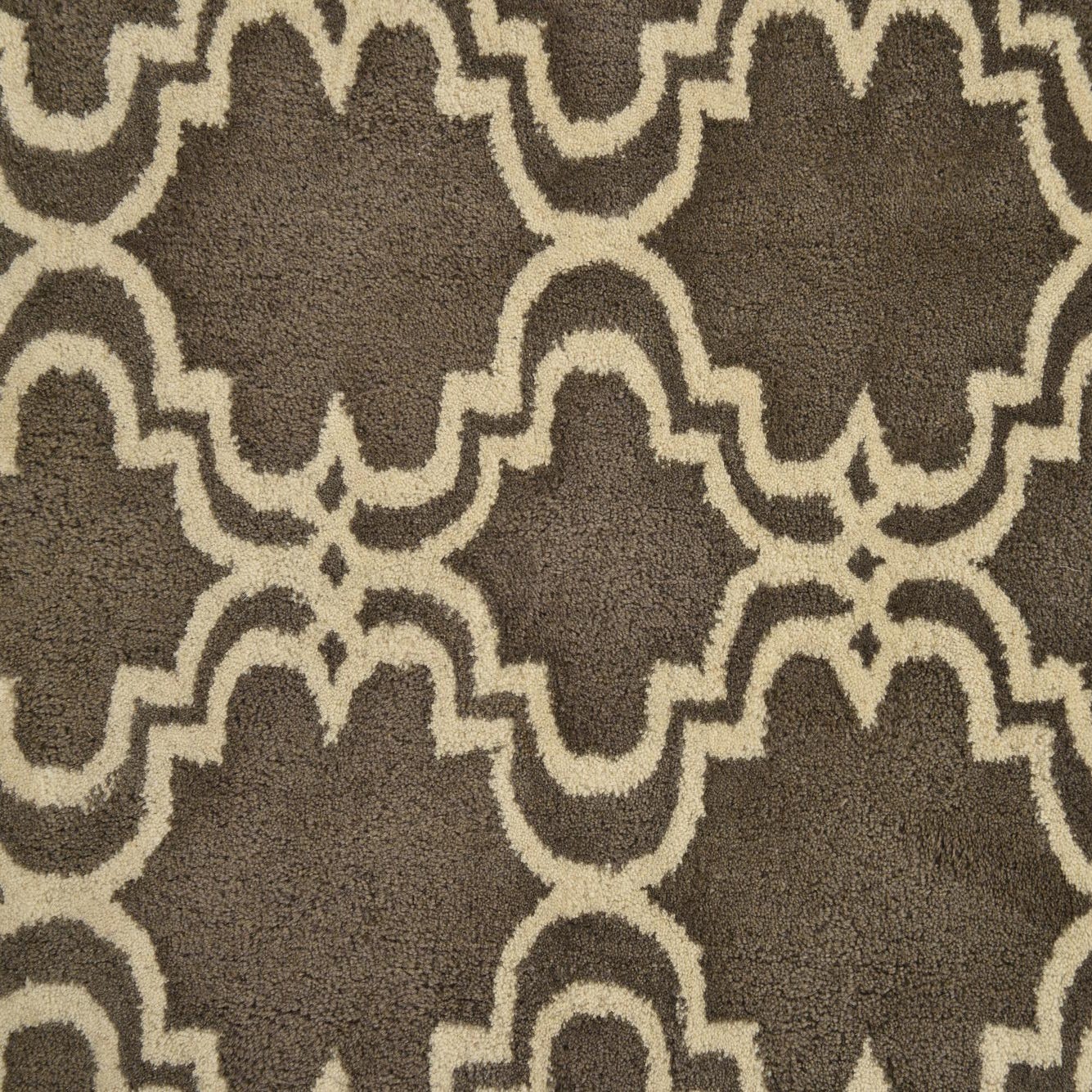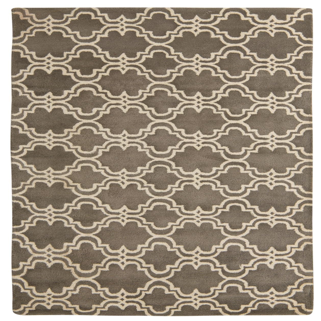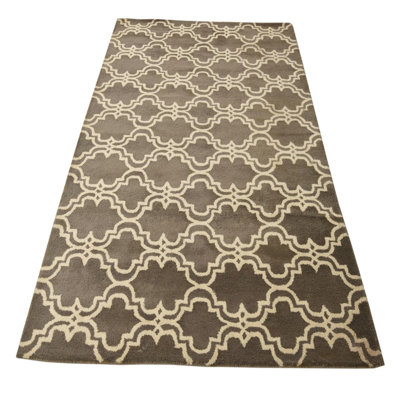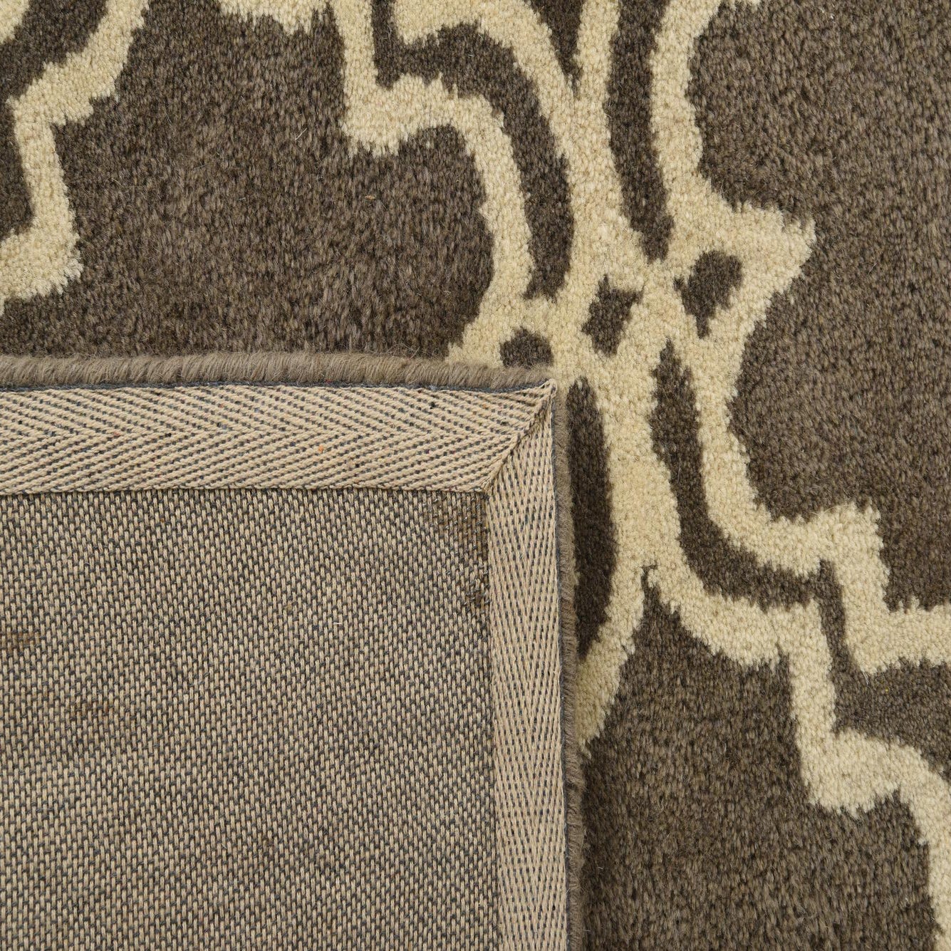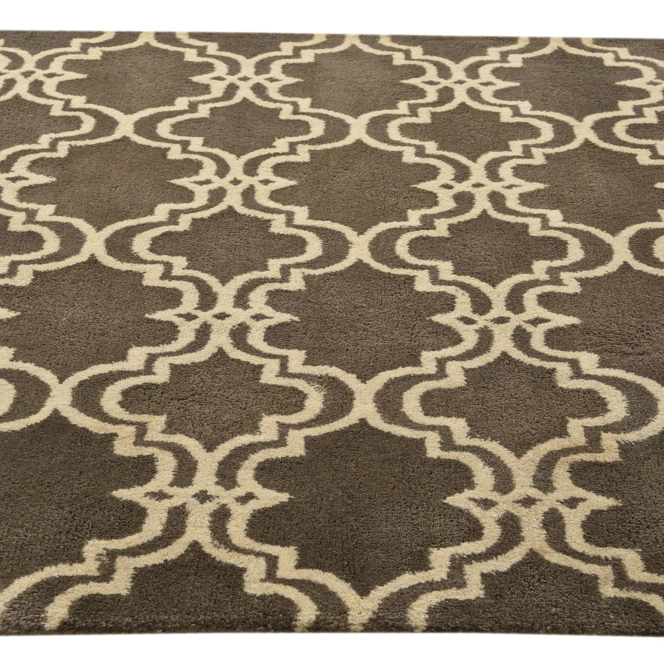 The Luna Collection rug is a sophisticated choice for those looking to add a touch of understated elegance to their space. Hand-tufted from a blend of wool and cotton, this 5x8 rug offers a durable yet plush feel underfoot. The rug showcases a repetitive geometric pattern featuring interconnected trellis designs in ivory set against a tranquil gray background.