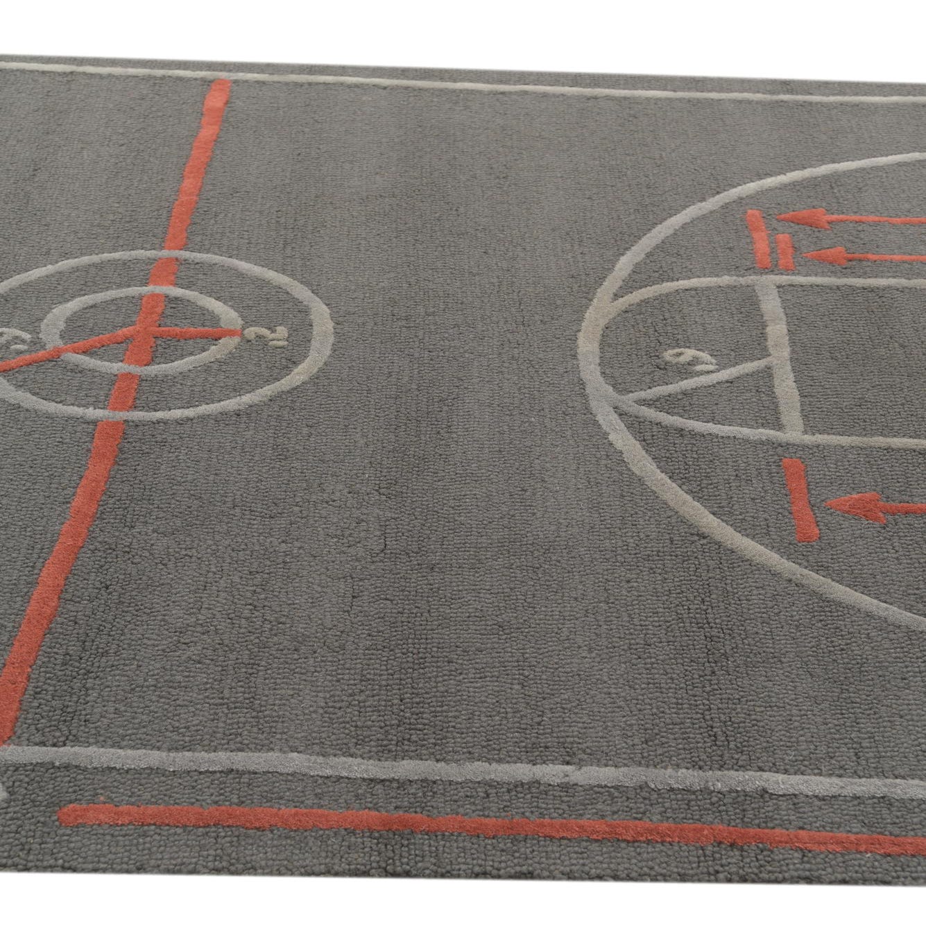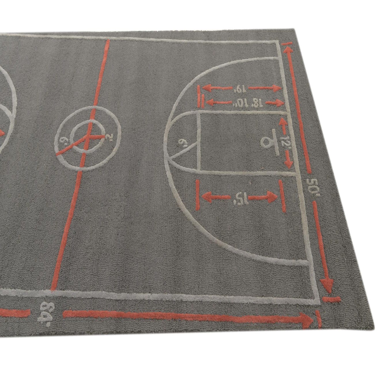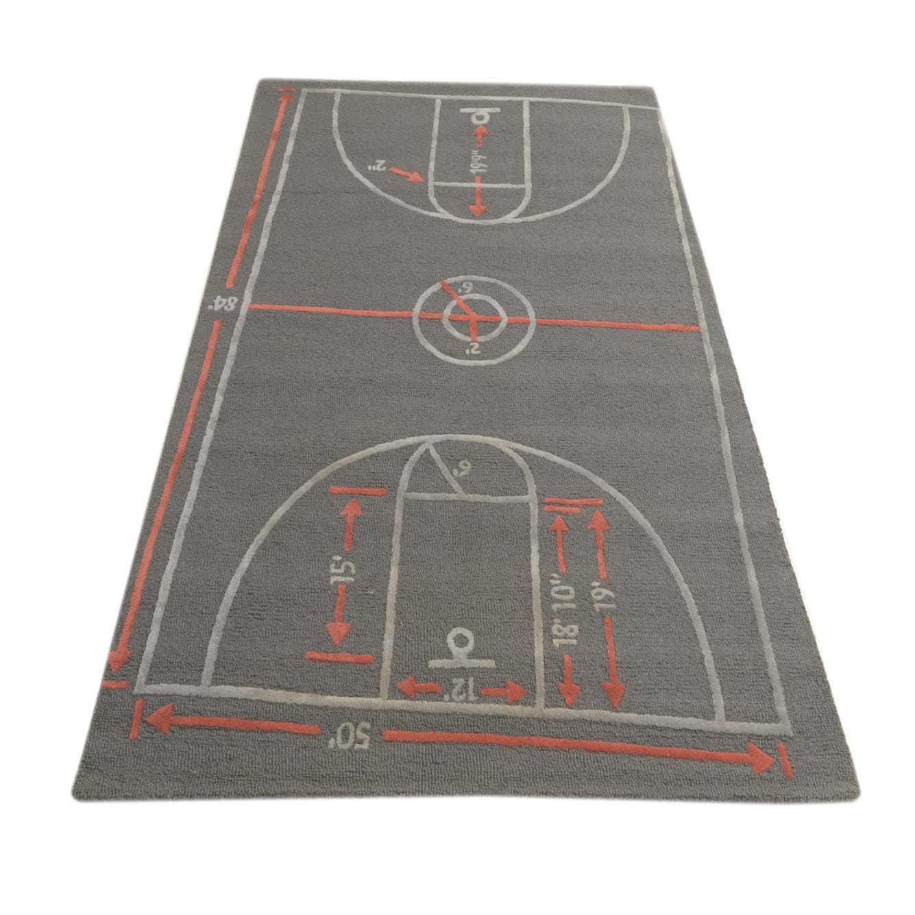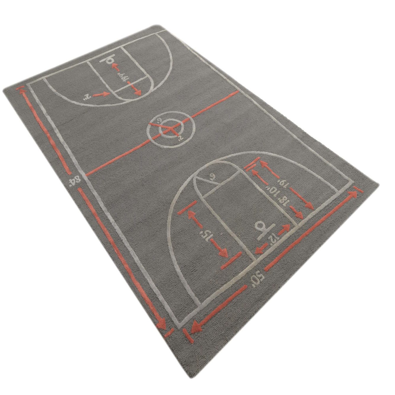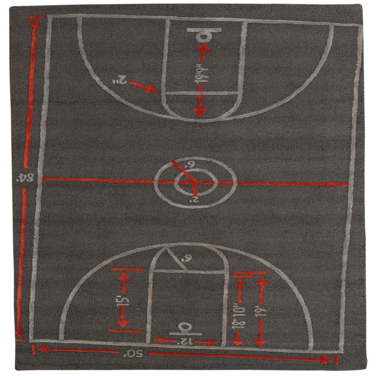 A 5x8 rectangular gray area rug with a modern, abstract basketball court design in white and red, perfect for a living room or bedroom.