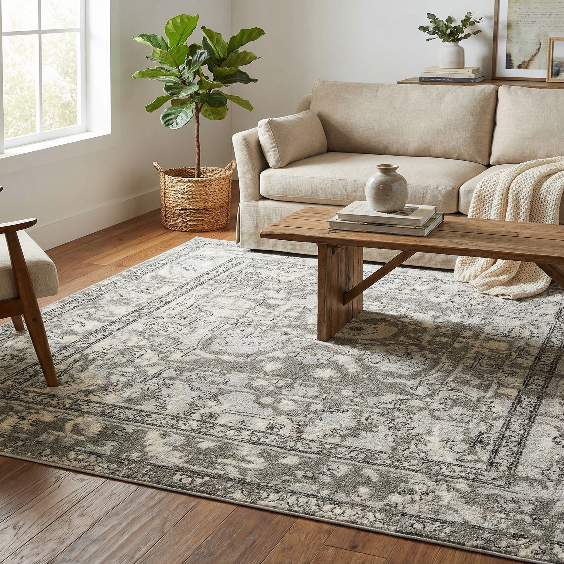 Machine-made of 100% polypropylene, this rug presents a vintage-inspired medallion and border layout with a softly distressed finish. The background color is gray, while silver and ivory accents pick out floral motifs and fine filigree for a layered, dimensional look. The low-profile pile feels smooth and slightly plush beneath your feet; the tight weave gives an even texture with a gentle sheen from the silver tones.