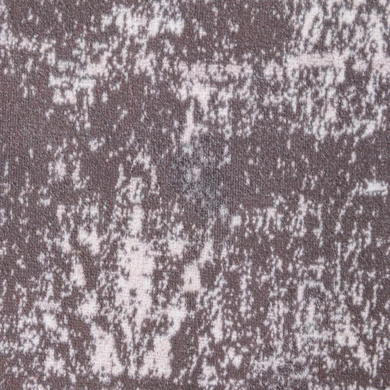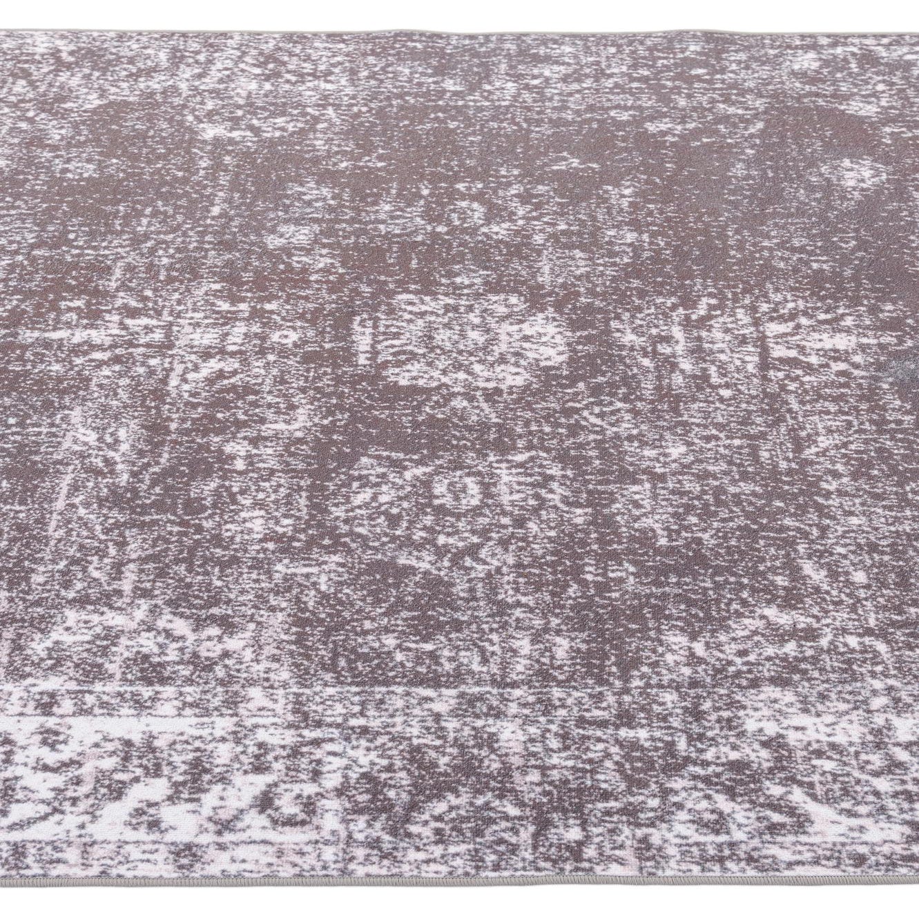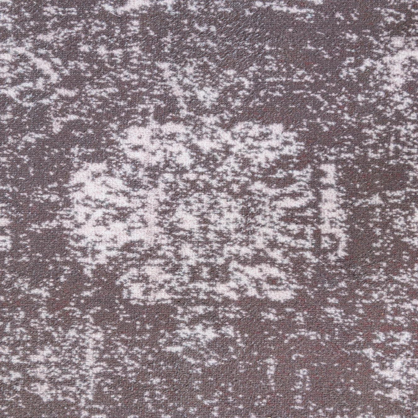 Machine-made of 100% polypropylene, this rug presents a low-pile, softly textured surface that feels smooth underfoot with a subtle, cushioned give. The gray background provides a cool, neutral field while ivory highlights create a distressed, vintage-inspired pattern with ghosted motifs and a faint border. The overall effect is worn and layered rather than uniform, giving depth and visual interest without heavy texture.