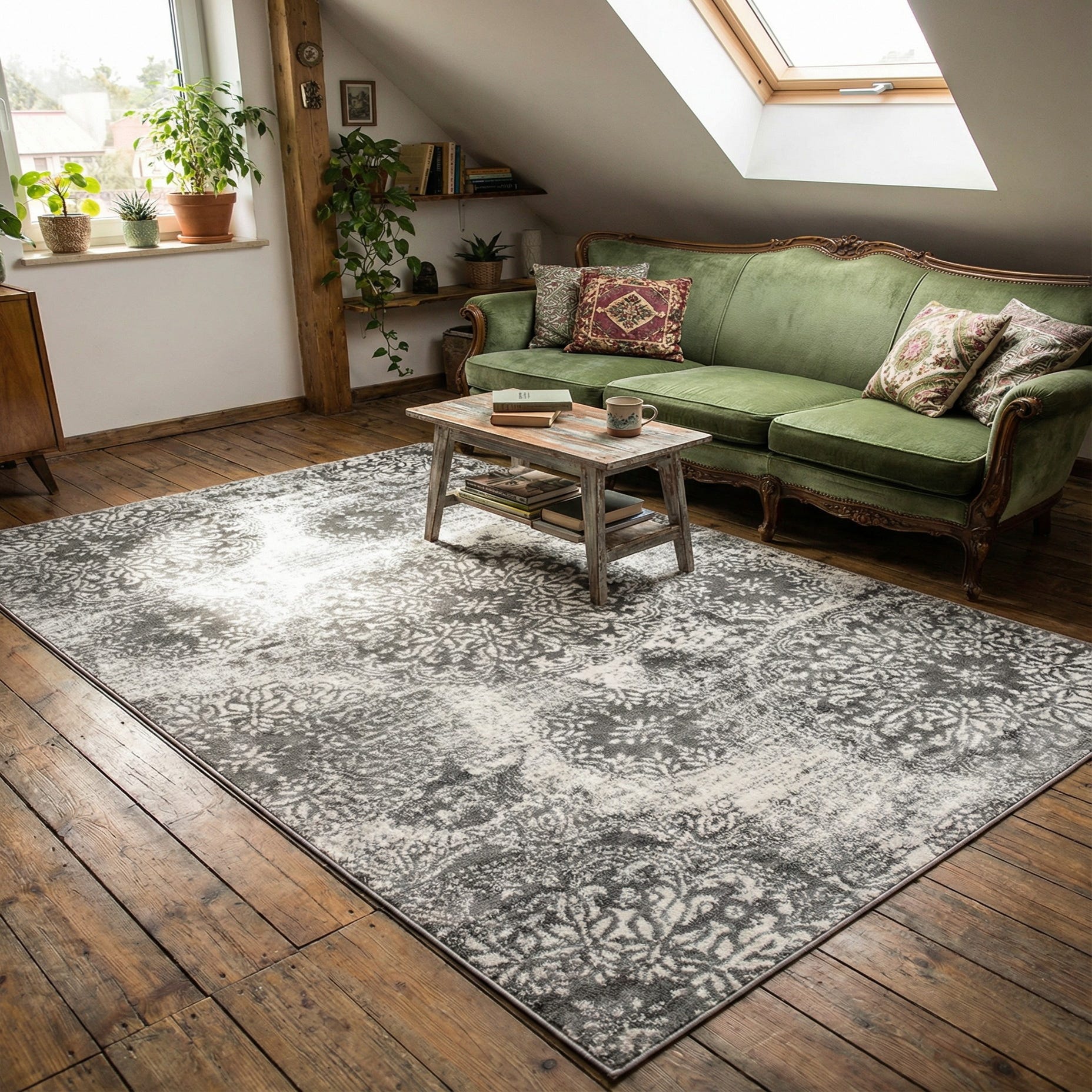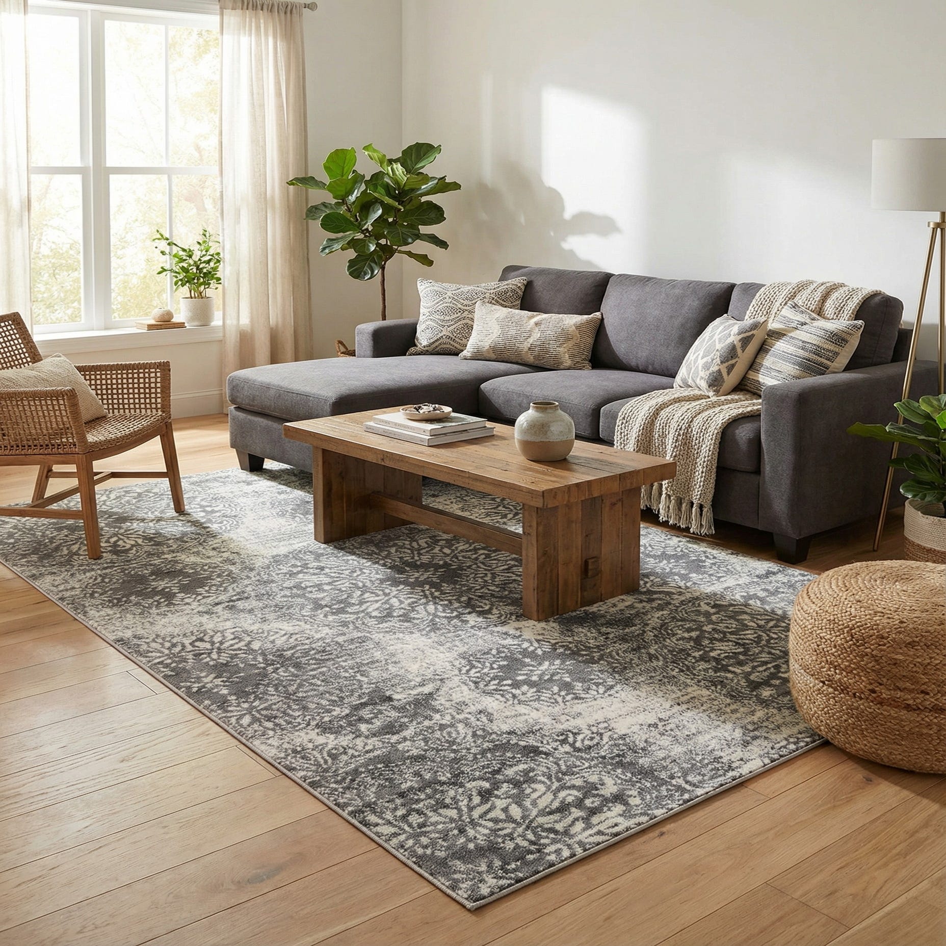 This rug pairs easily with transitional, modern farmhouse, and contemporary interiors—place it beneath a sofa to anchor a seating area, let it soften a bedroom with light linens, or use it in an entryway or home office to add subtle pattern and texture. It complements cool color schemes and light- to medium-toned woods, and it can act as a calm counterpoint to bolder furniture or accessories when you want pattern without high contrast.