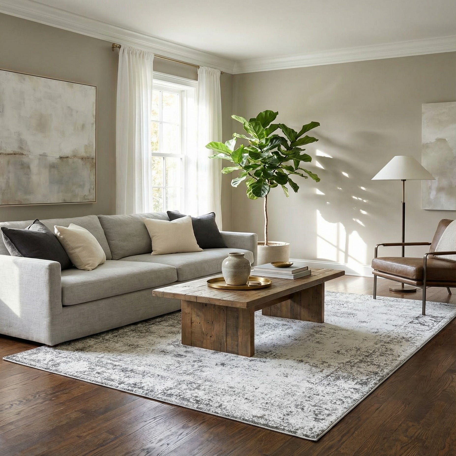 This rug fits well in modern and transitional interiors that favor neutral palettes — pair it with a light-colored sofa and warm wood tones for a relaxed living room, tuck it beneath a bed to add quiet texture to a serene bedroom, or use it to anchor seating in a home office or den. Its restrained, tonal look also complements minimalist and Scandinavian schemes or softens industrial loft spaces when layered with natural materials.