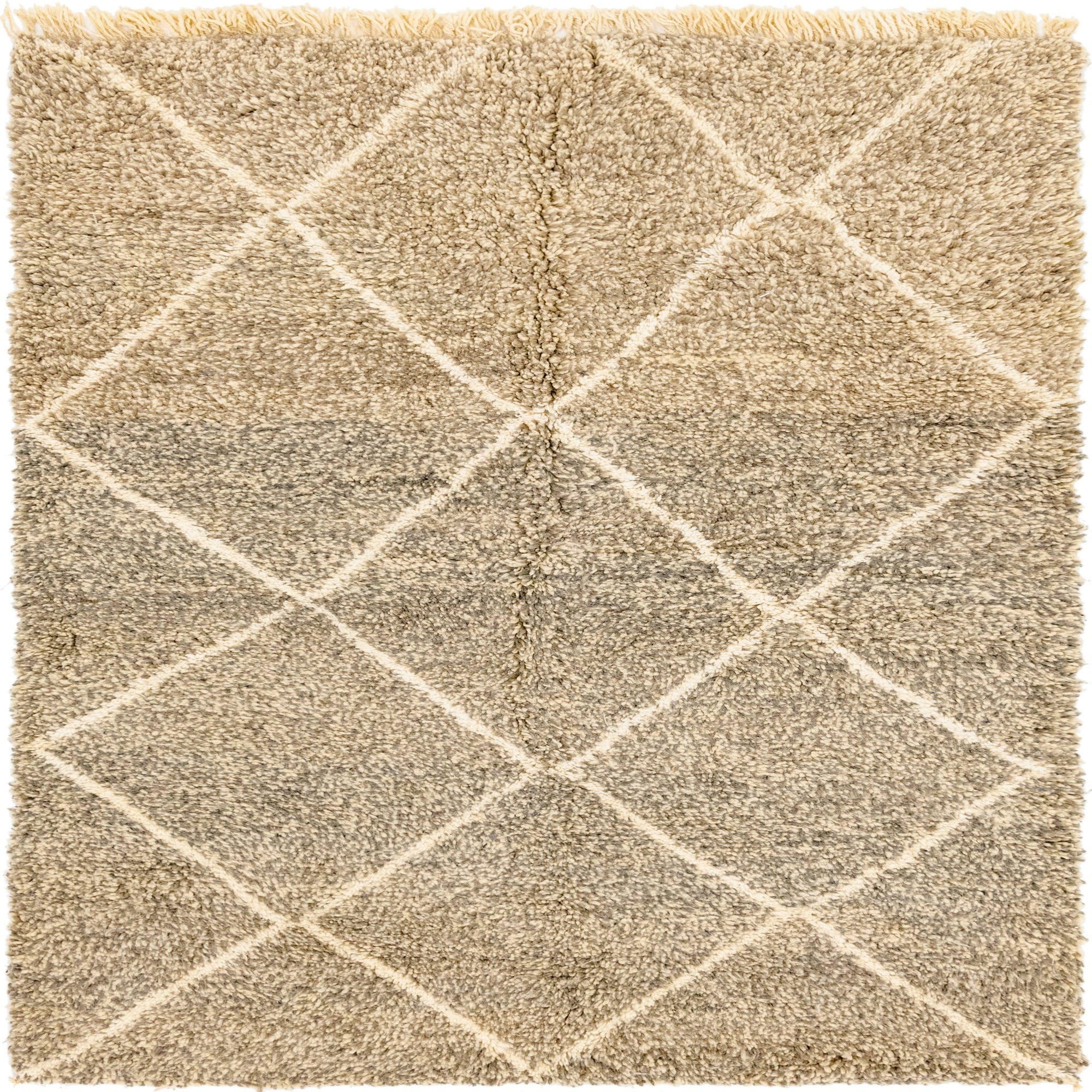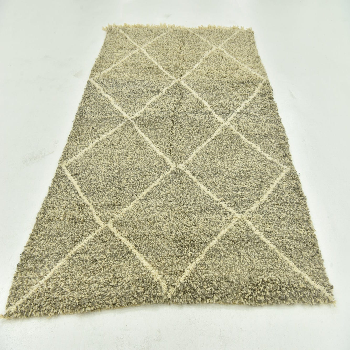 A classic Moroccan diamond trellis in ivory runs across a gray background, with the ivory lines sitting a touch higher than the field to create gentle dimension. The neutral gray and ivory palette works well with modern, Scandinavian, or transitional interiors—layer it beneath a living room seating group to anchor furniture, place it at the side of a bed to soften morning routine, or add it to a home office or reading nook for understated pattern and texture.