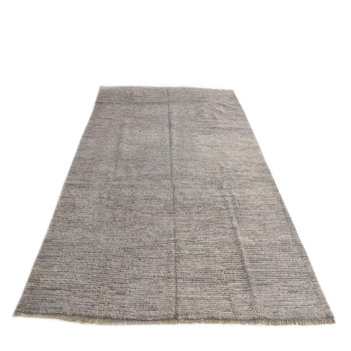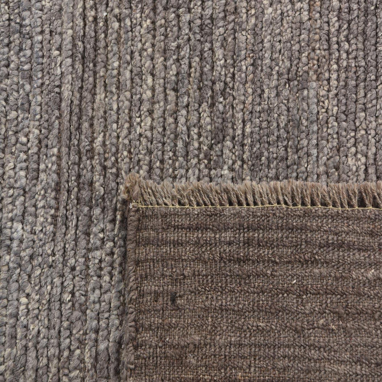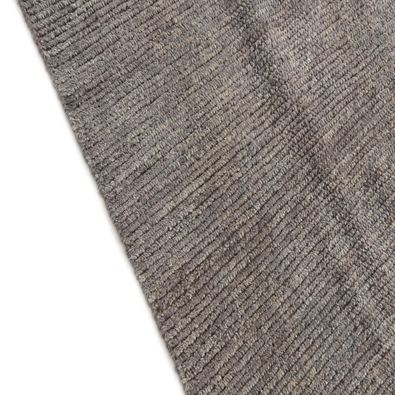 Hand-knotted of 100% wool, this rug presents a calm gray field with subtle tonal variation and a refined linear motif. The surface has a low-profile, ribbed texture created by the hand-knotting, so you can feel gentle ridges underfoot and see soft shifts in shade across the weave. Short, hand-finished edges lend a quiet, artisanal touch that complements the rug’s straightforward, modern character.