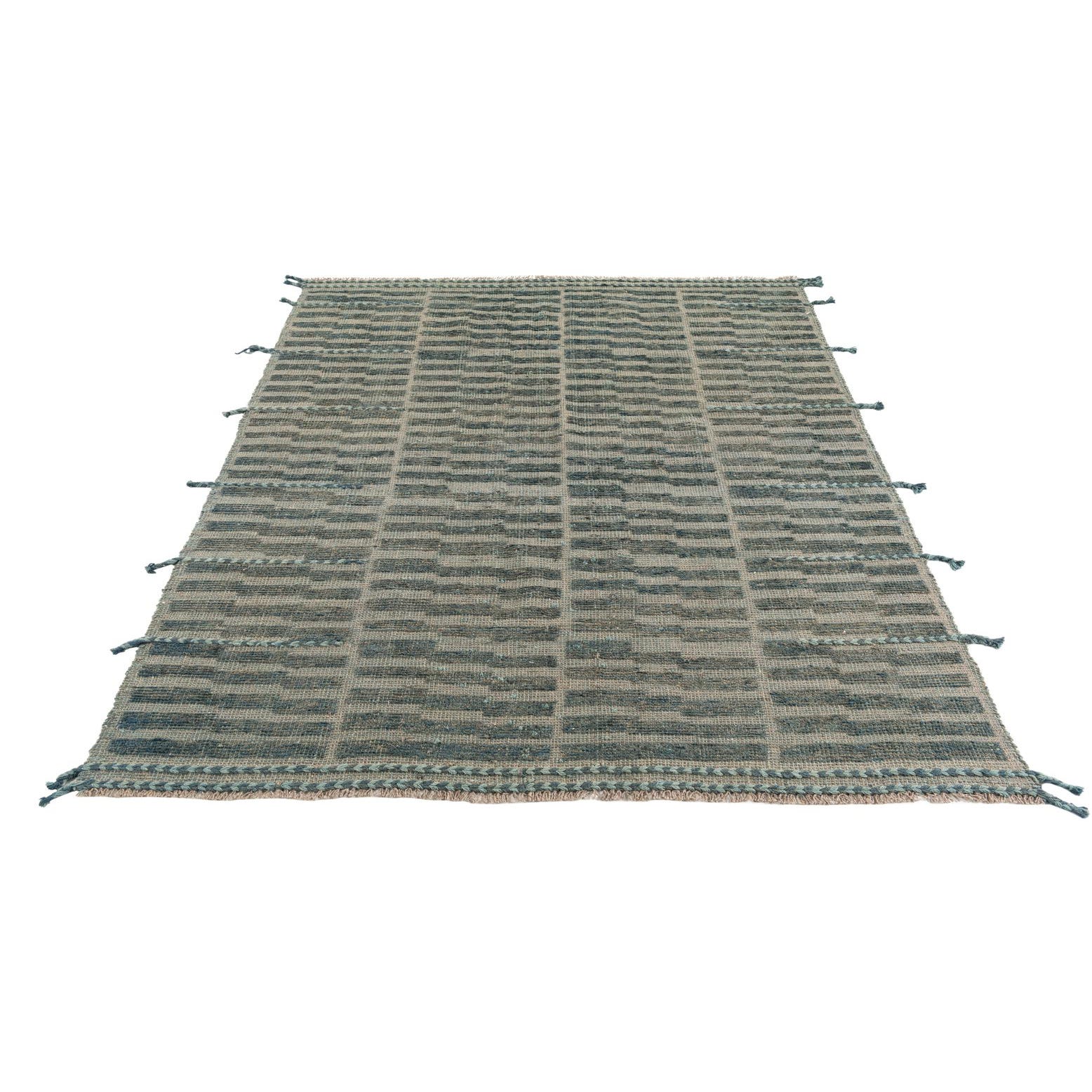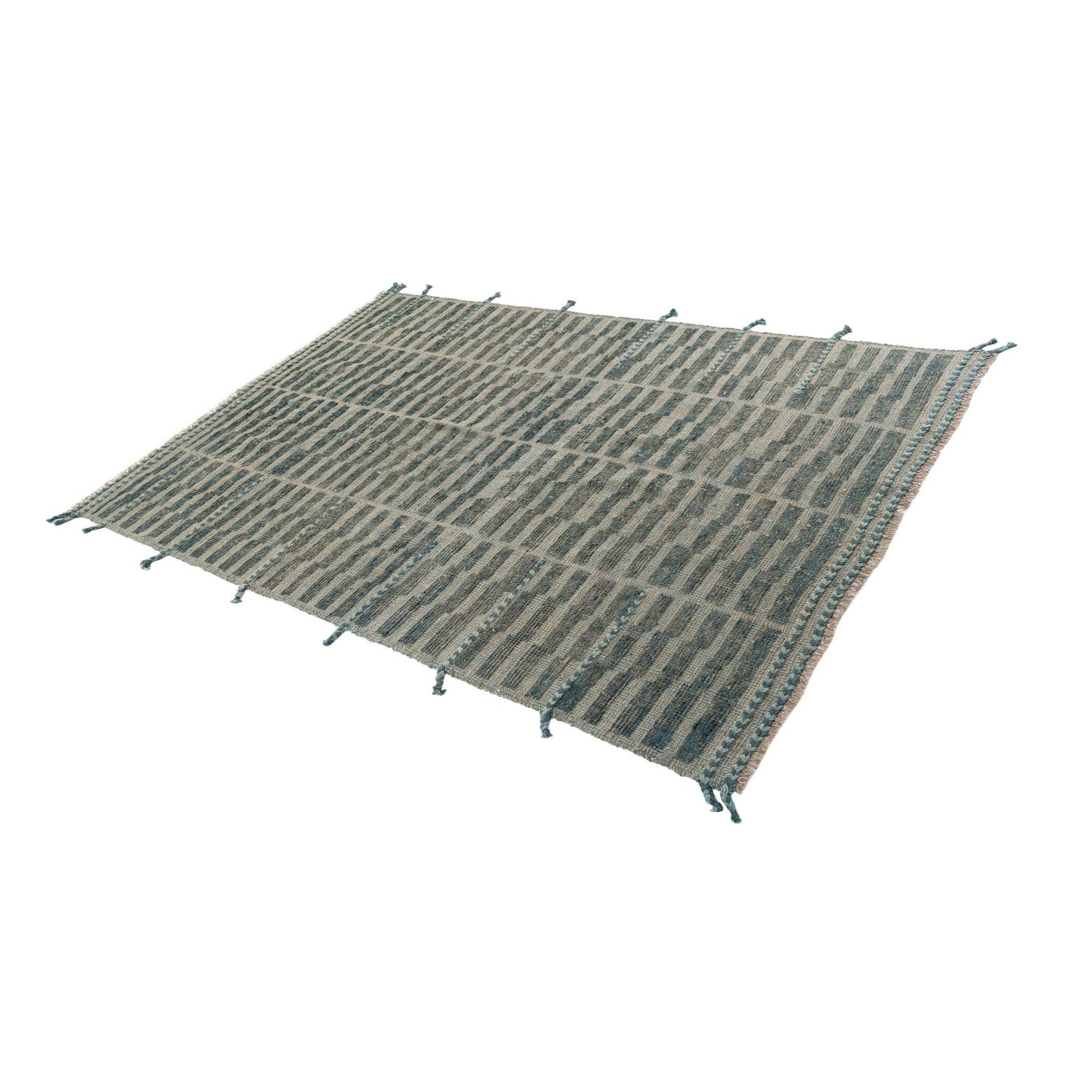 A 5x8 rectangular gray wool shag rug with a modern tribal stripe pattern and decorative tassels.