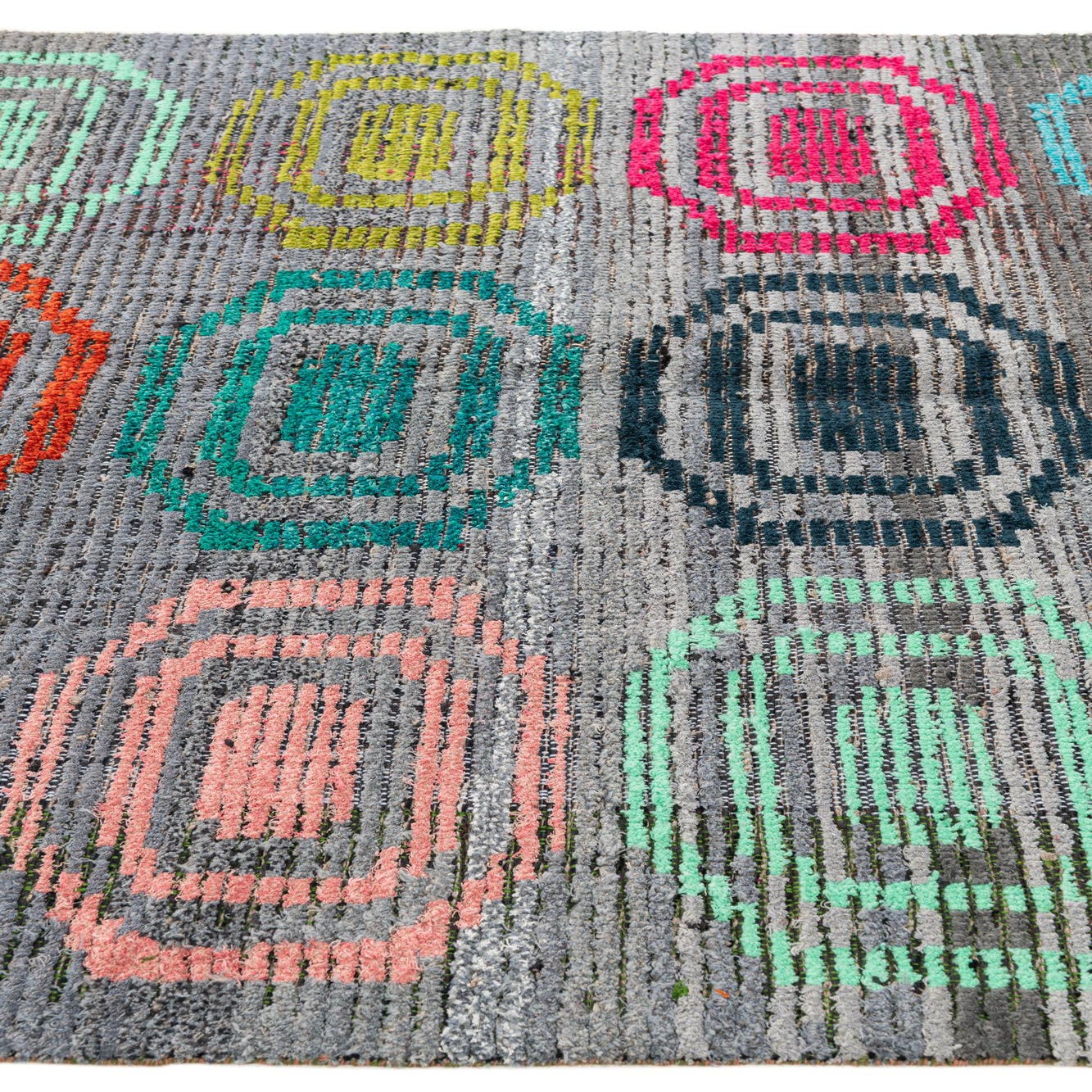 A 5x8 rectangular gray shag rug with a modern tribal pattern of colorful concentric squares in pink, orange, blue, green, and yellow, with multicolored tassels.