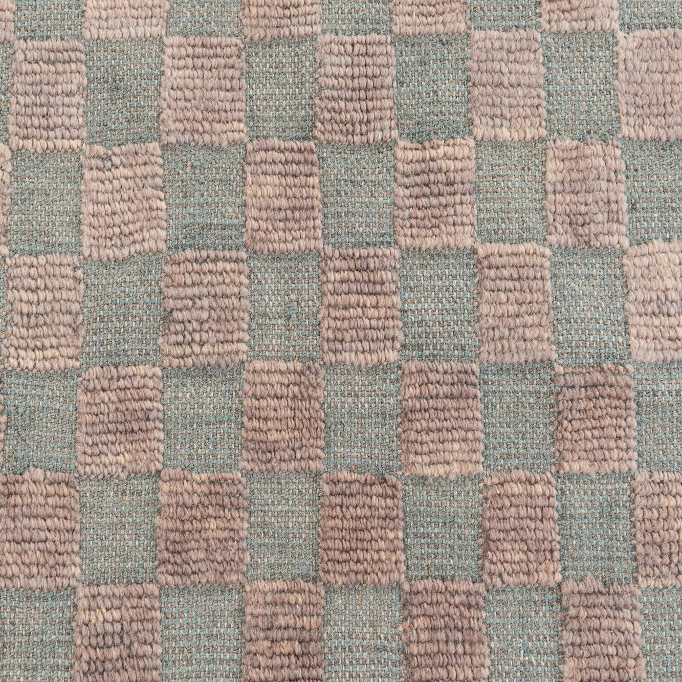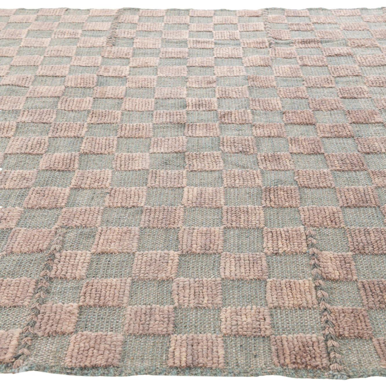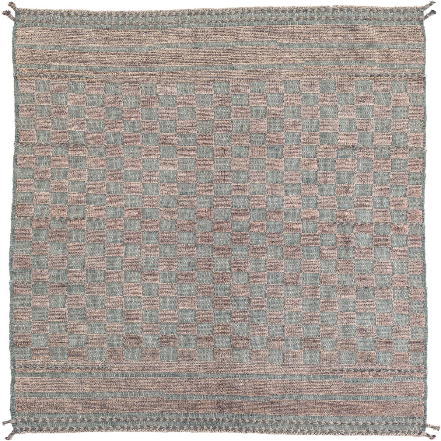 A 5x8 rectangular gray wool shag rug with a modern tribal checkered pattern and decorative border.