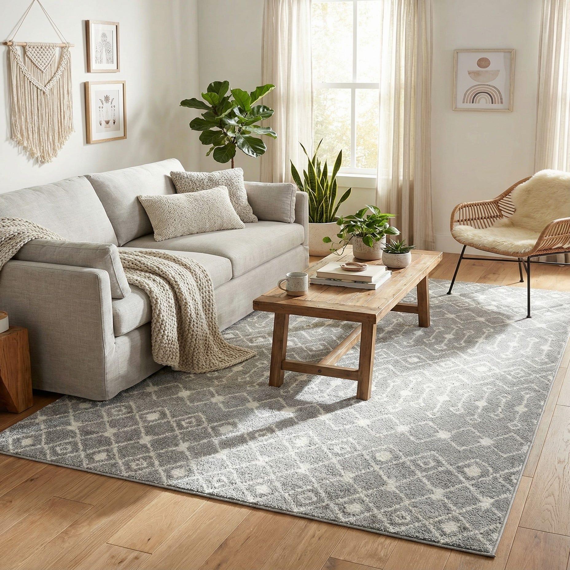 This rug fits easily into a range of interiors — try it under a coffee table in a contemporary living room, layered beneath a bed to add softness to a bedroom, or centered in a casual dining area to ground seating. Its neutral palette works with warm wood tones, cool metals, and linen or leather upholstery, making it a good choice for Scandinavian, transitional, or modern farmhouse schemes. Machine-made construction delivers consistent patterning and a dependable texture for everyday spaces.