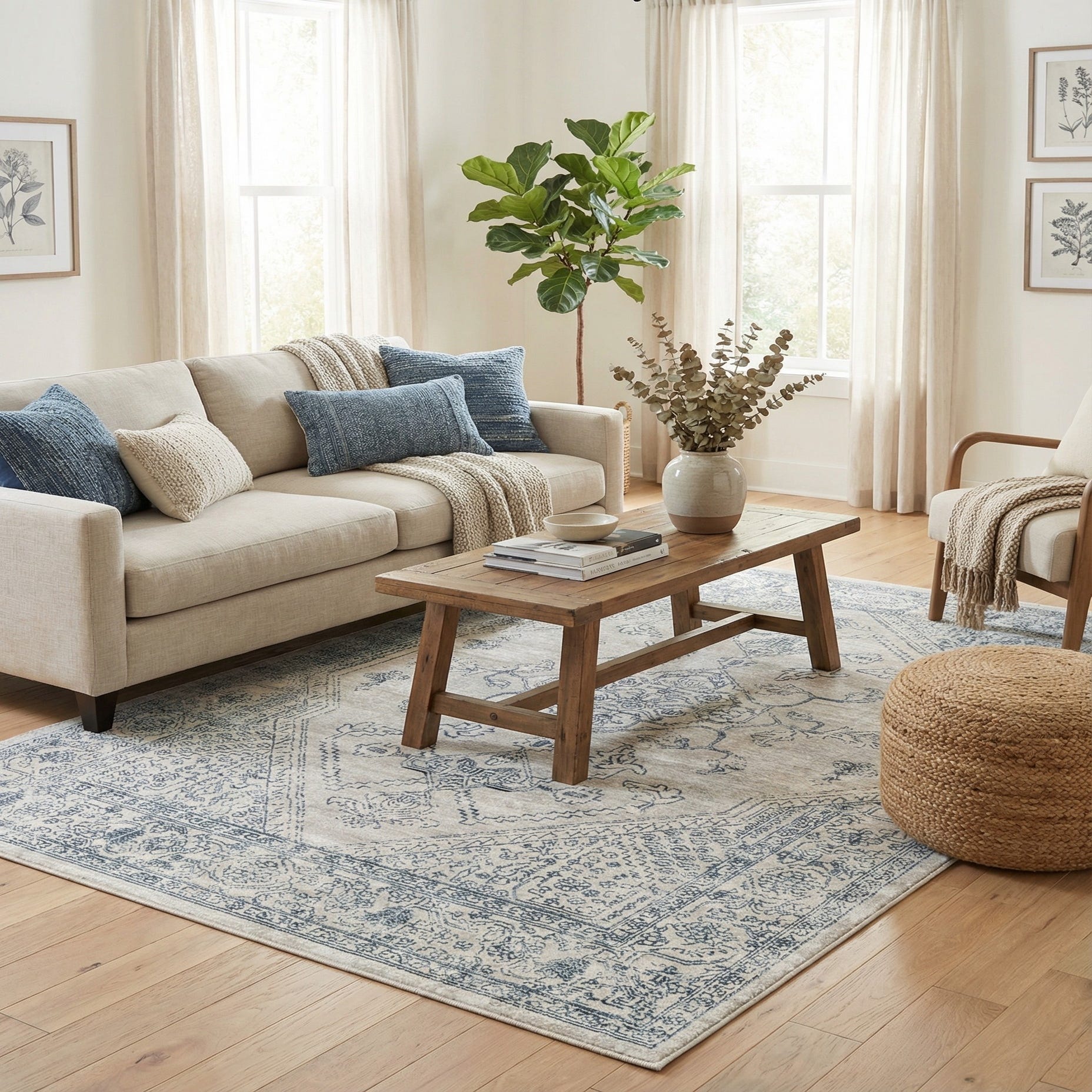This rug fits well in transitional, coastal, or modern farmhouse interiors, where its neutral palette and antique-inspired motifs add calm structure without overwhelming the room. Place it beneath a seating group to anchor a living room, layer it under a bed for a soft, organized look, or use it to define a reading nook alongside light wood furniture and linen upholstery. Its understated coloring also complements painted cabinetry, white trim, and muted accent tones for a cohesive, relaxed atmosphere.