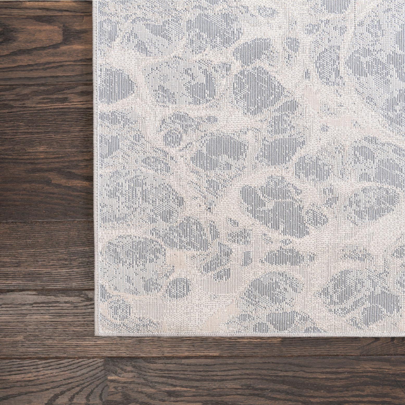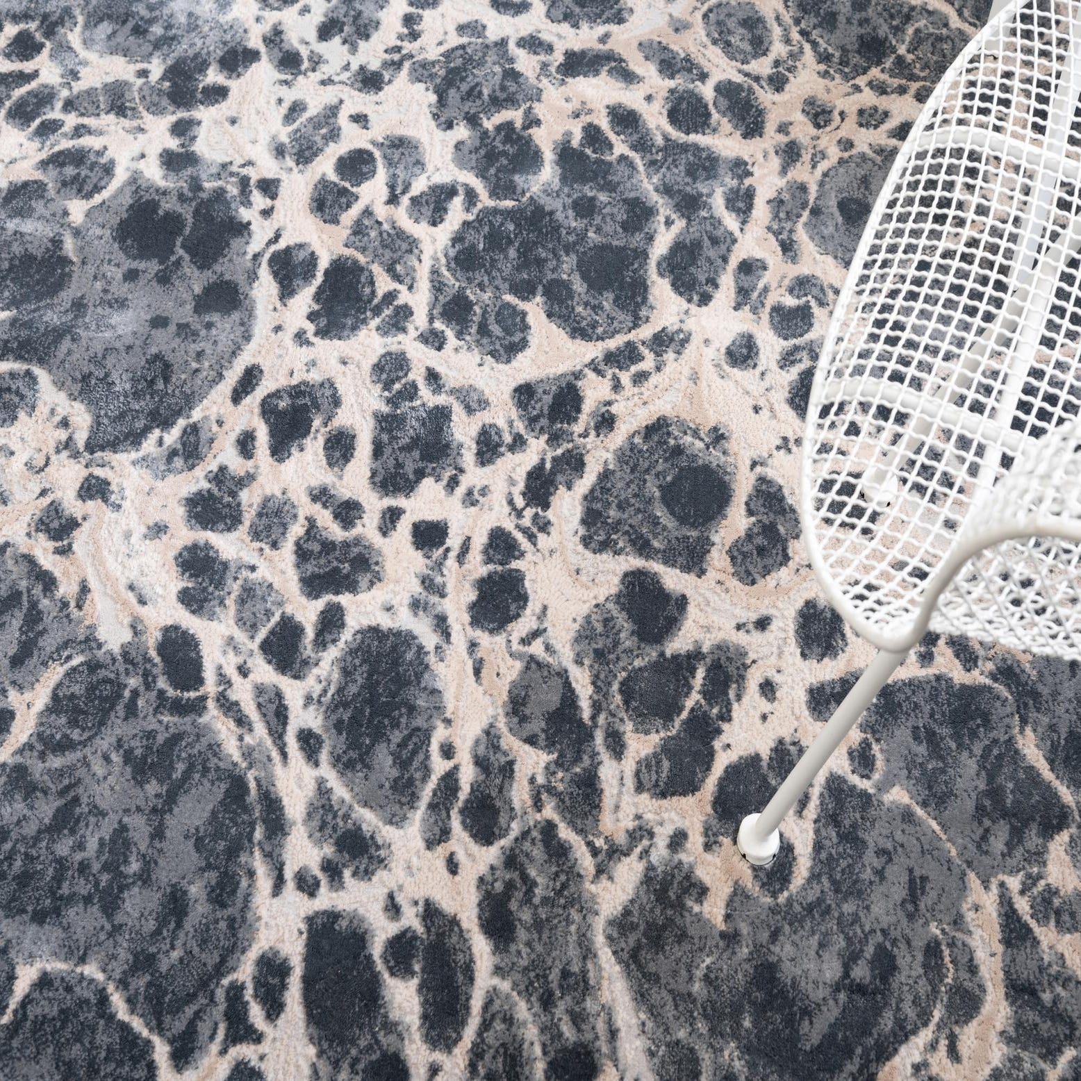 An abstract, organic pattern of rounded forms and flowing veins sits on a gray background, where ivory and beige accents weave through darker gray clusters to create visual depth. The design reads like a modern interpretation of natural stone or watermarks, with irregular shapes that give the surface movement without feeling busy. Machine made from 65% polypropylene and 35% polyester, the pile has a smooth, slightly plush hand and a soft low-to-medium texture that feels comfortable underfoot while keeping the pattern crisp.
