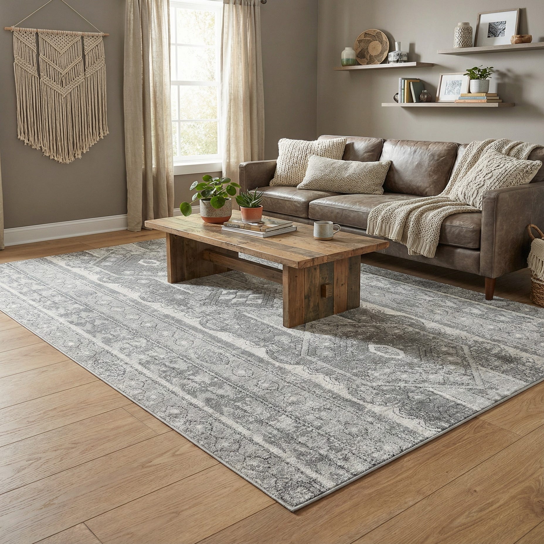Machine made from 85% polypropylene and 15% polyester, the pile has a low, slightly cushioned hand with a faint, satiny sheen from the polyester highlights. The texture feels smooth underfoot while the construction holds the pattern definition, making it a good choice for everyday living spaces. This neutral, softly aged design works well anchored under a sofa and coffee table, layered at the foot of a bed to add subtle pattern, or used in a contemporary home office to bring warmth without competing with other finishes.